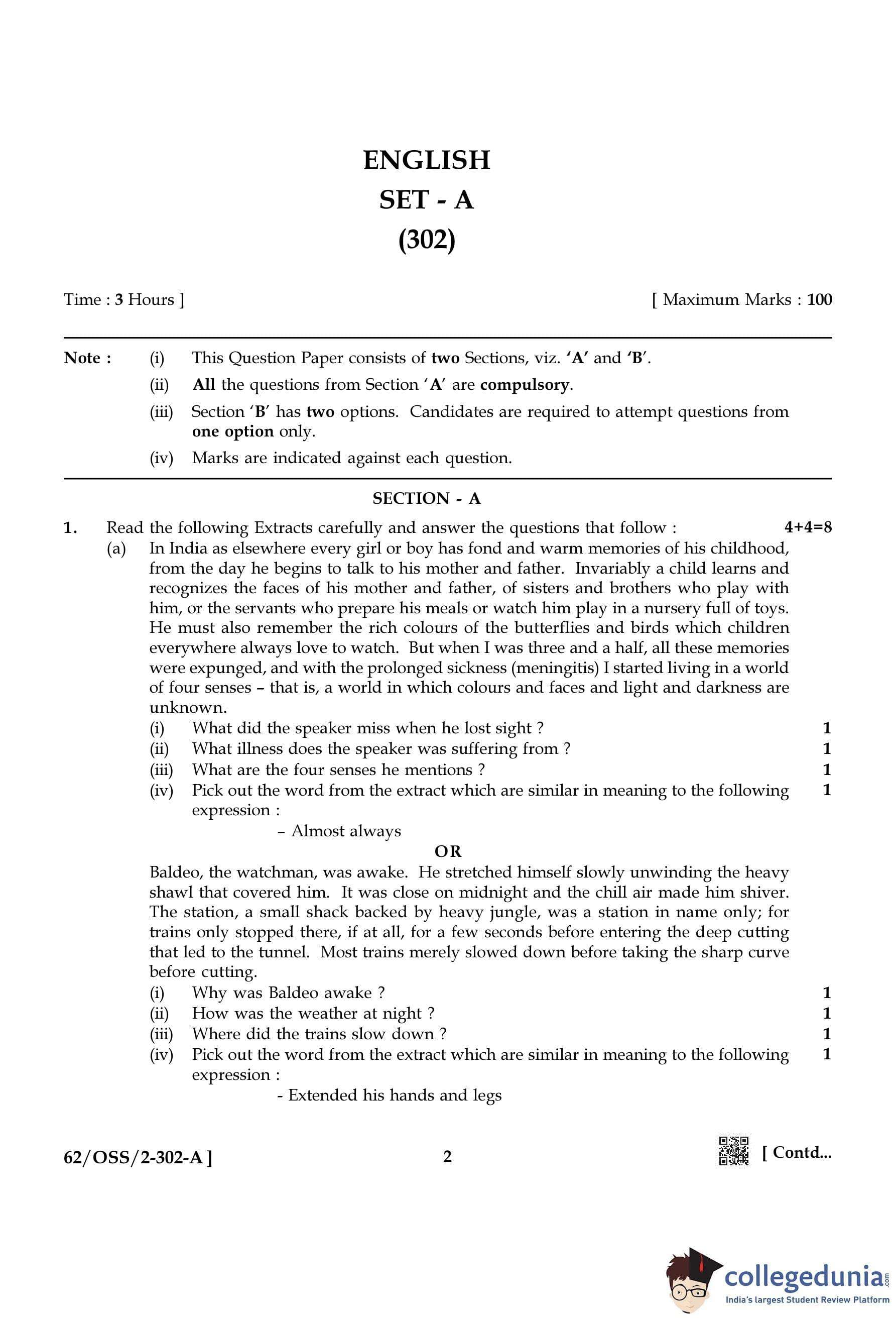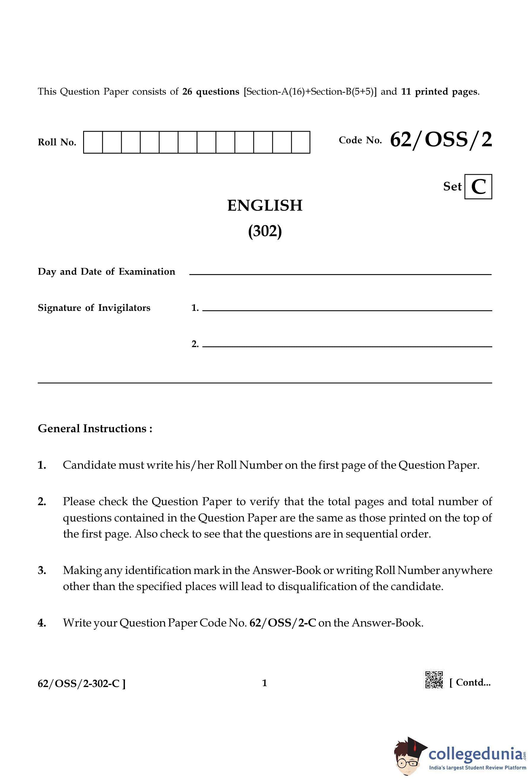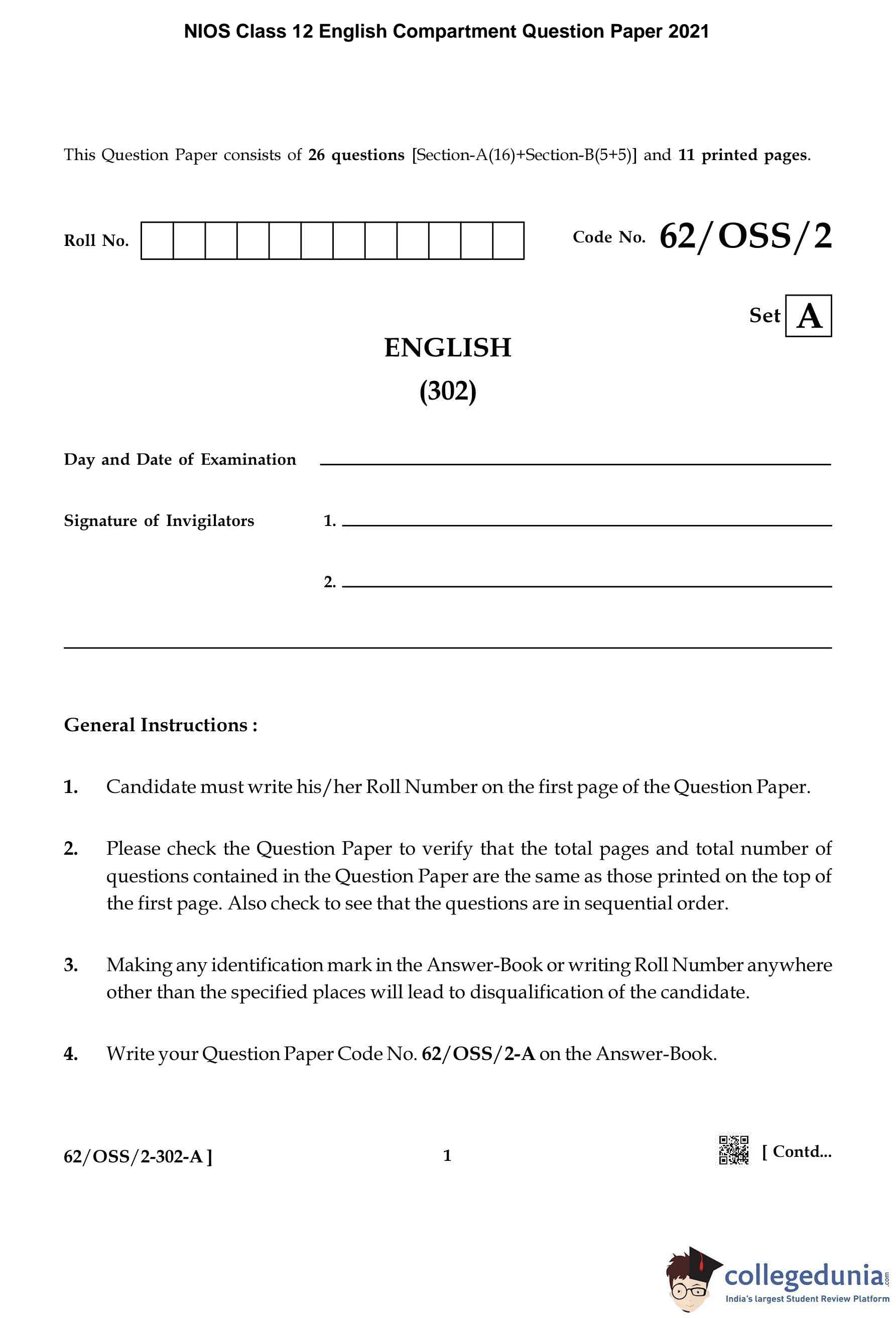 NIOS Class 12 English Compartment Question Paper 2021 with Answer Key