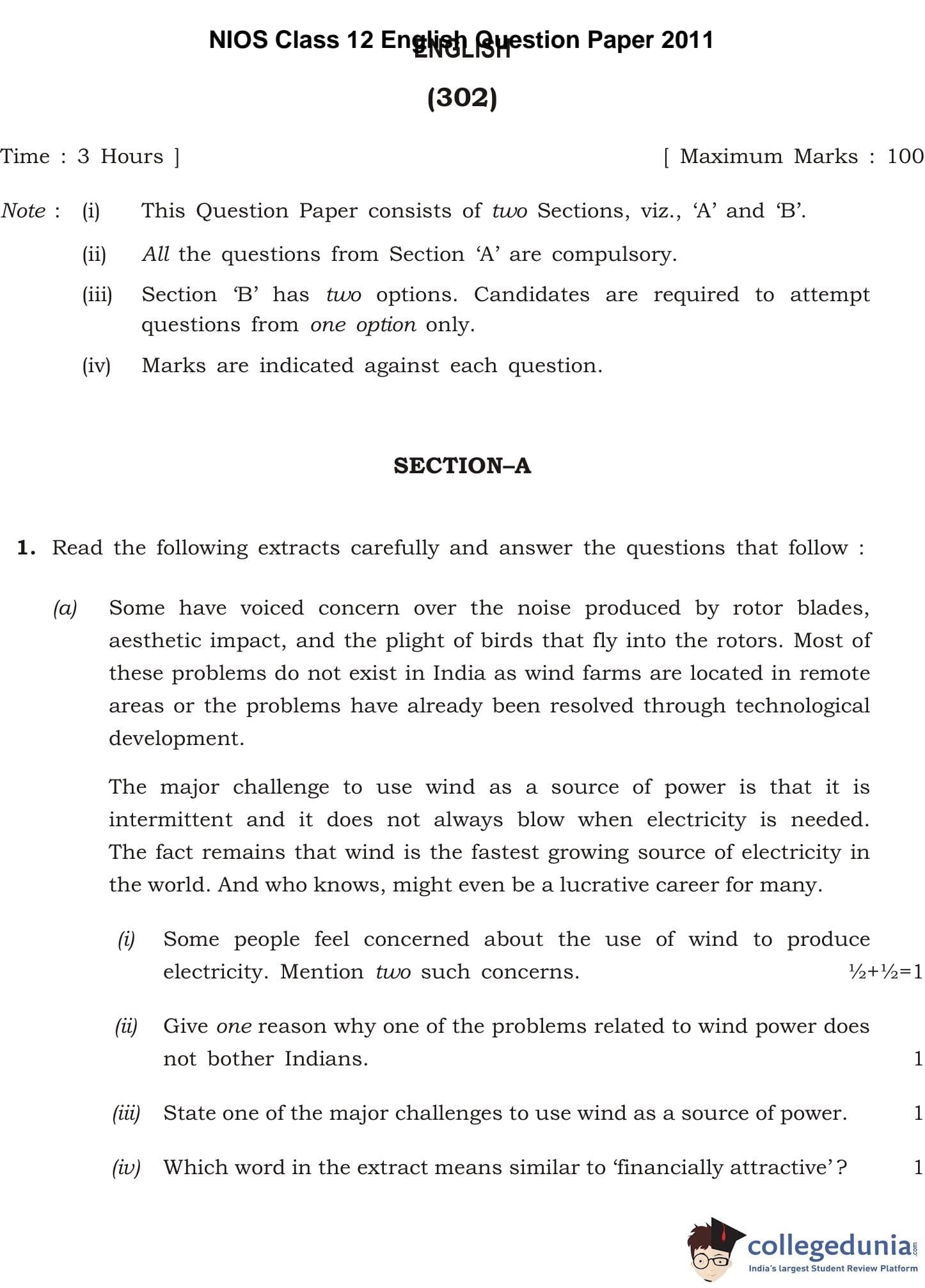 NIOS Class 12 English Question Paper 2011 with Answer Key pdf is available for download here. The exam was conducted by National Institute of Open Schooling. The question paper comprised a total of 21 questions divided among 2 sections.