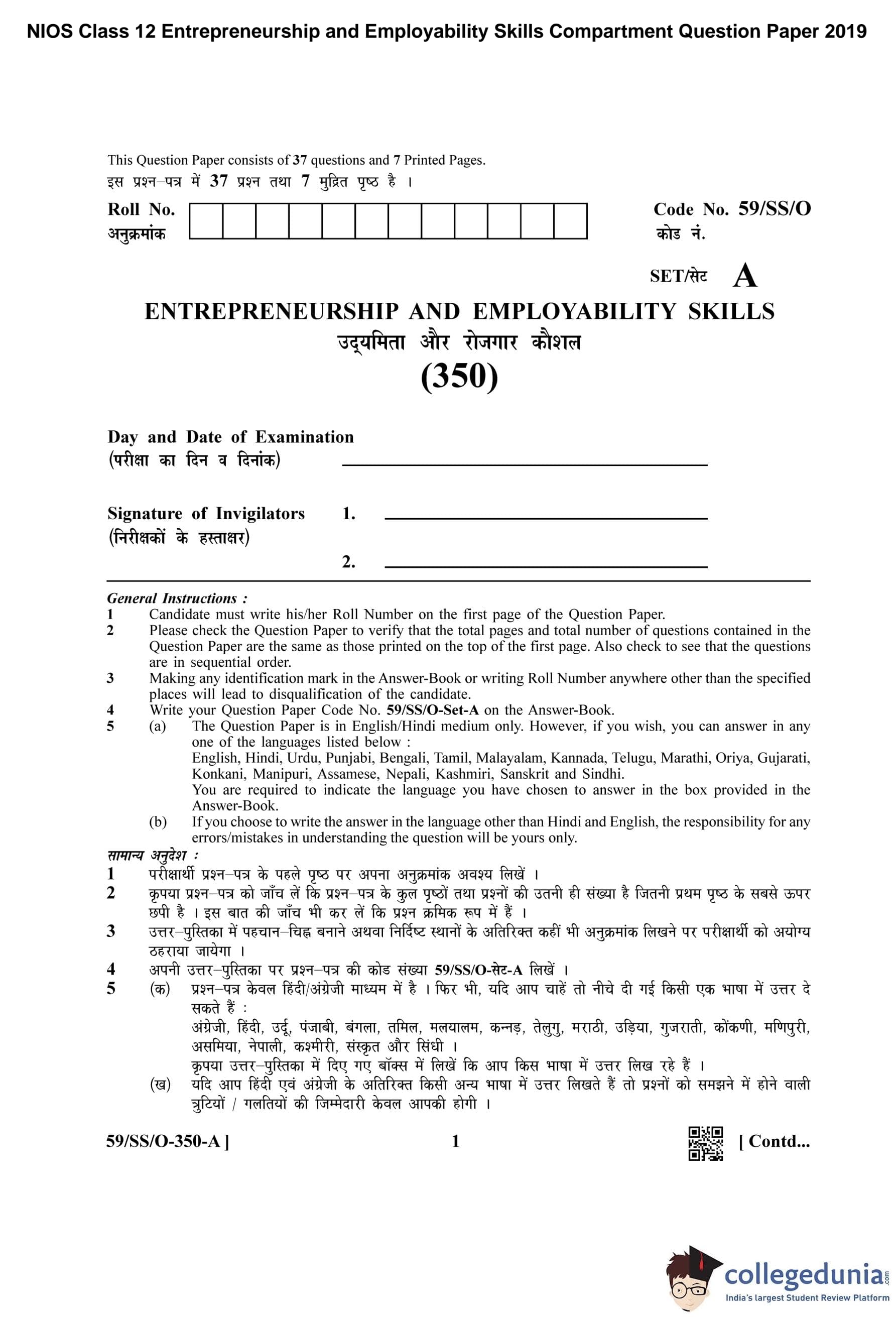 NIOS Class 12 Entrepreneurship and Employability Skills Compartment Question Paper 2019 with Answer Key pdf is available for download here. The exam was conducted by National Institute of Open Schooling on October 4, 2019 in the Afternoon Session 2:30 PM to 5:30 PM. The question paper comprised a total of 37 questions divided among 4 sections.