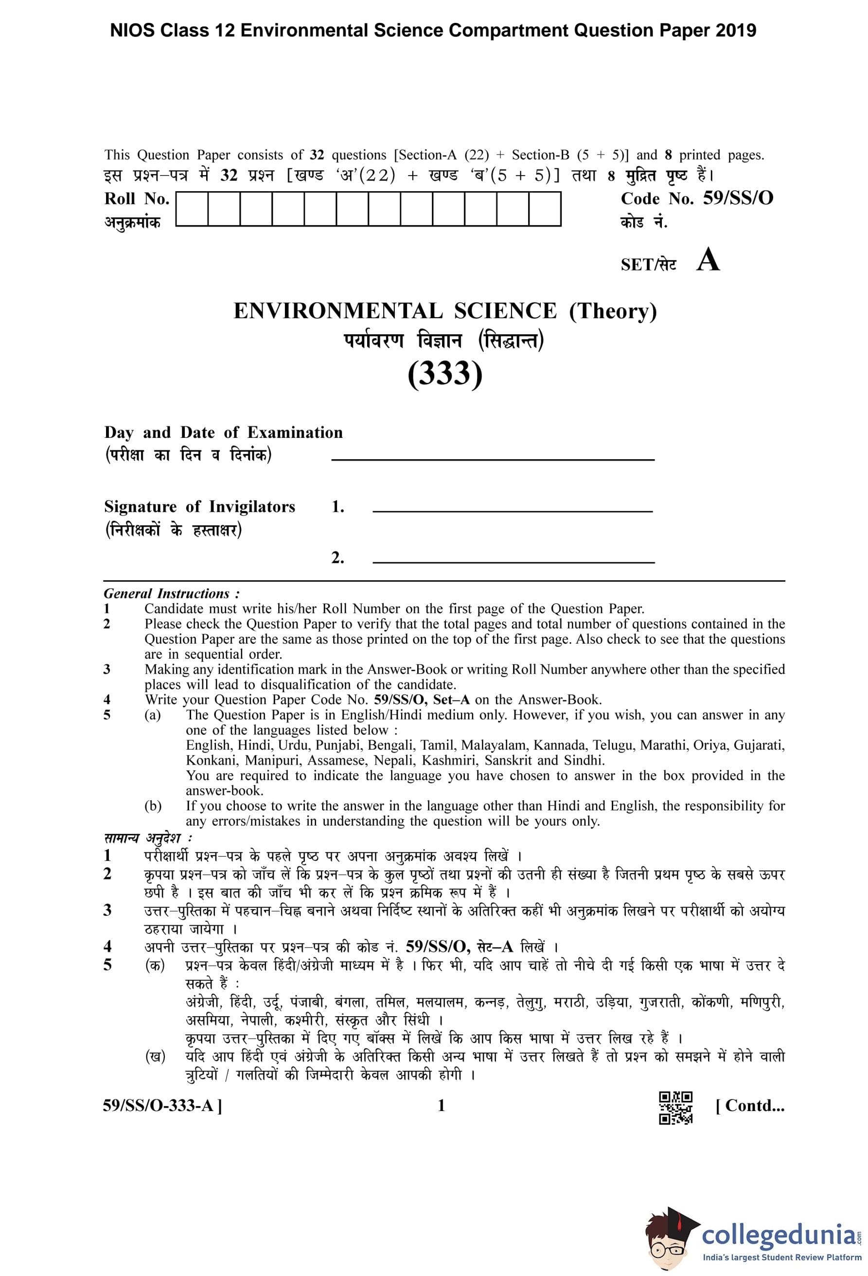 NIOS Class 12 Environmental Science Compartment Question Paper 2019 with Answer Key pdf is available for download here. The exam was conducted by National Institute of Open Schooling on October 30, 2019 in the Afternoon Session 2:30 PM to 5:30 PM. The question paper comprised a total of 27 questions divided among 2 sections.