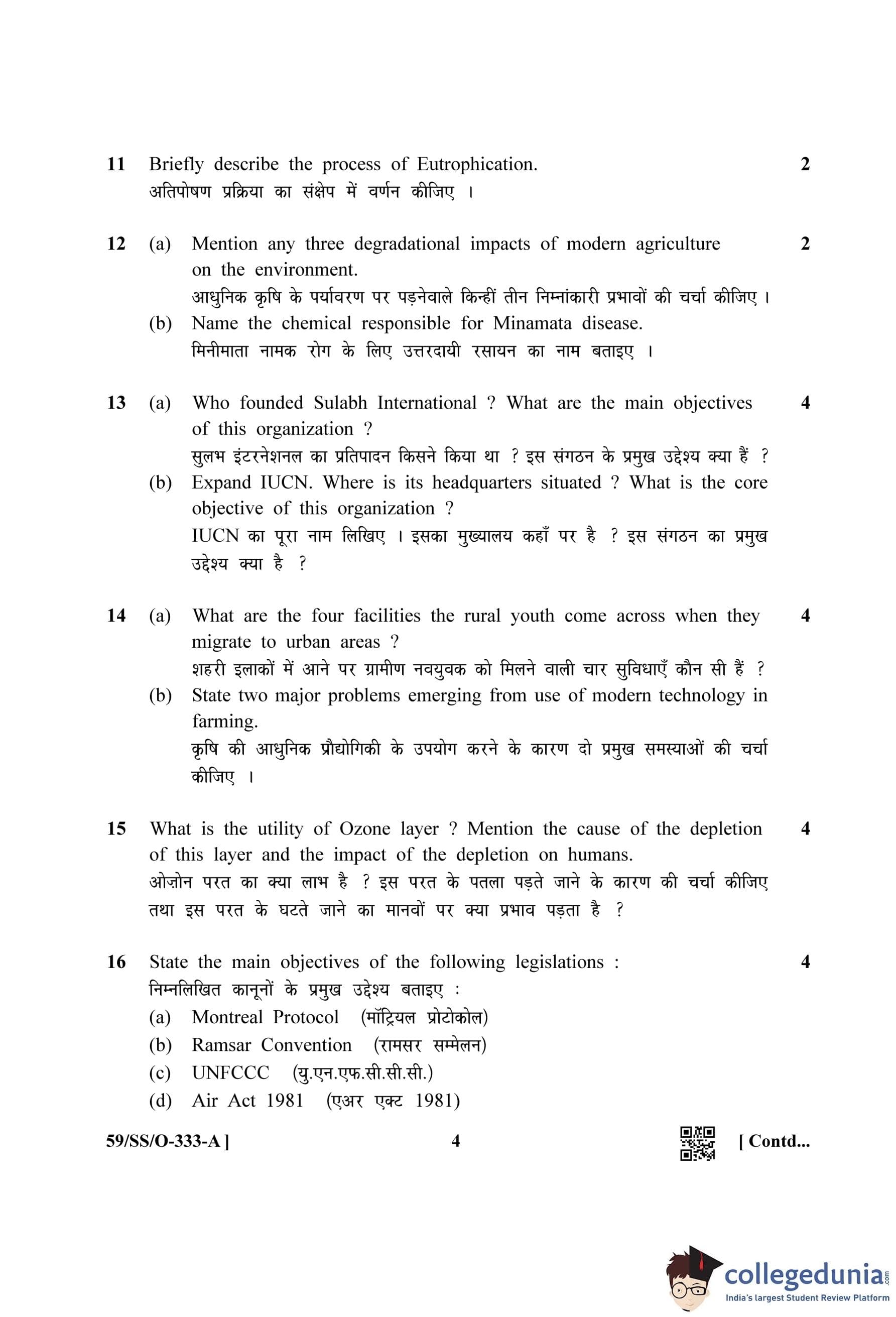 NIOS Class 12 Environmental Science Compartment Question Paper 2019 with Answer Key