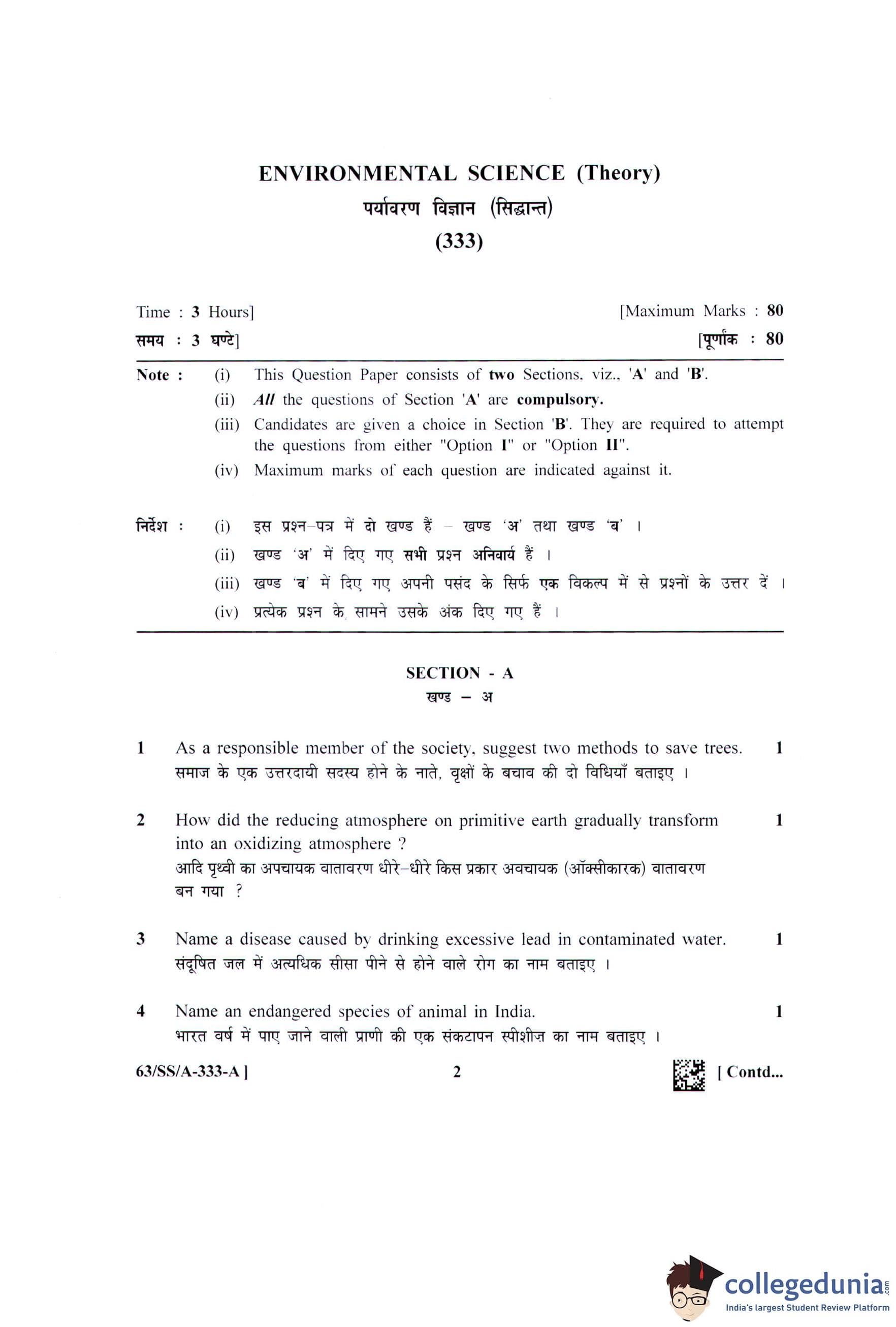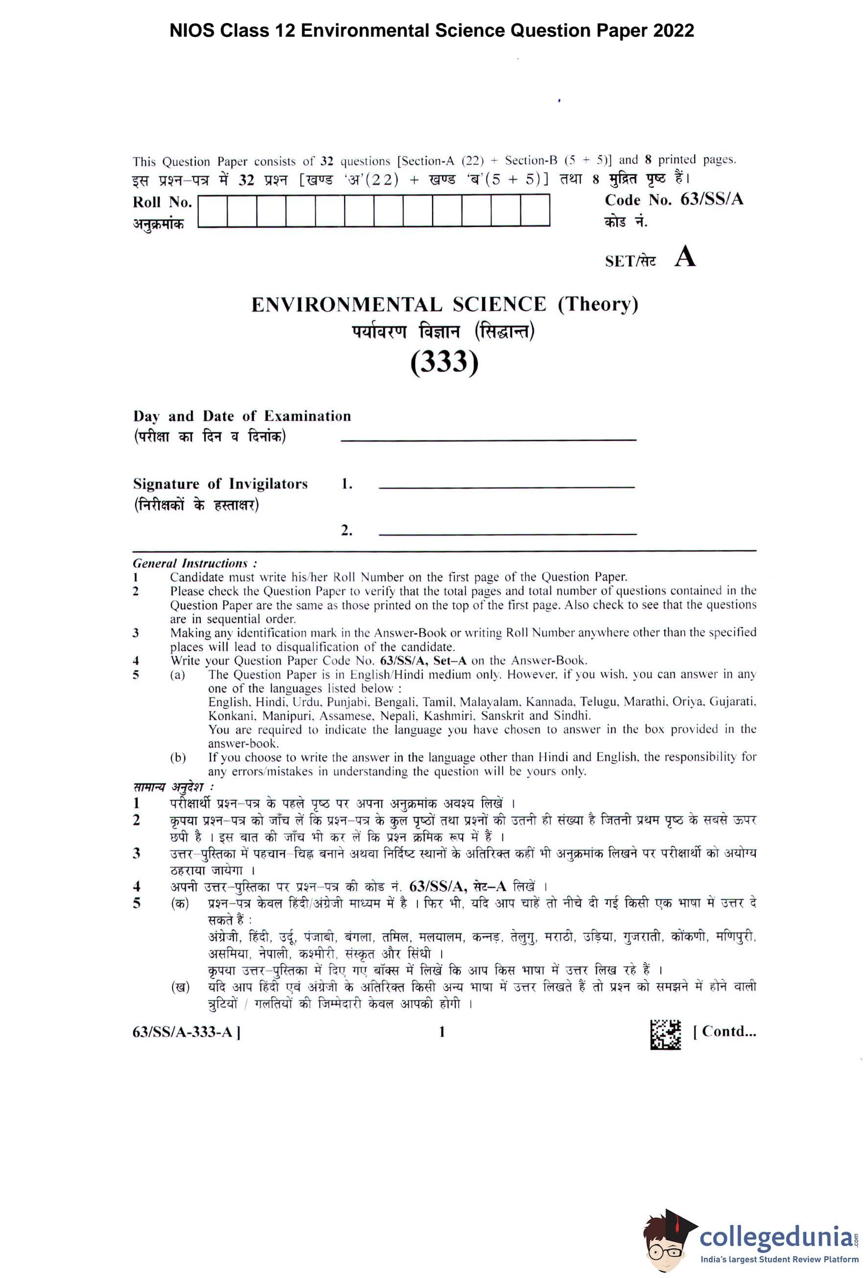 NIOS Class 12 Environmental Science Question Paper 2022 with Answer Key pdf is available for download here. The exam was conducted by National Institute of Open Schooling on April 6, 2022 in the Afternoon Session 2:30 PM to 5:30 PM. The question paper comprised a total of 27 questions divided among 2 sections.