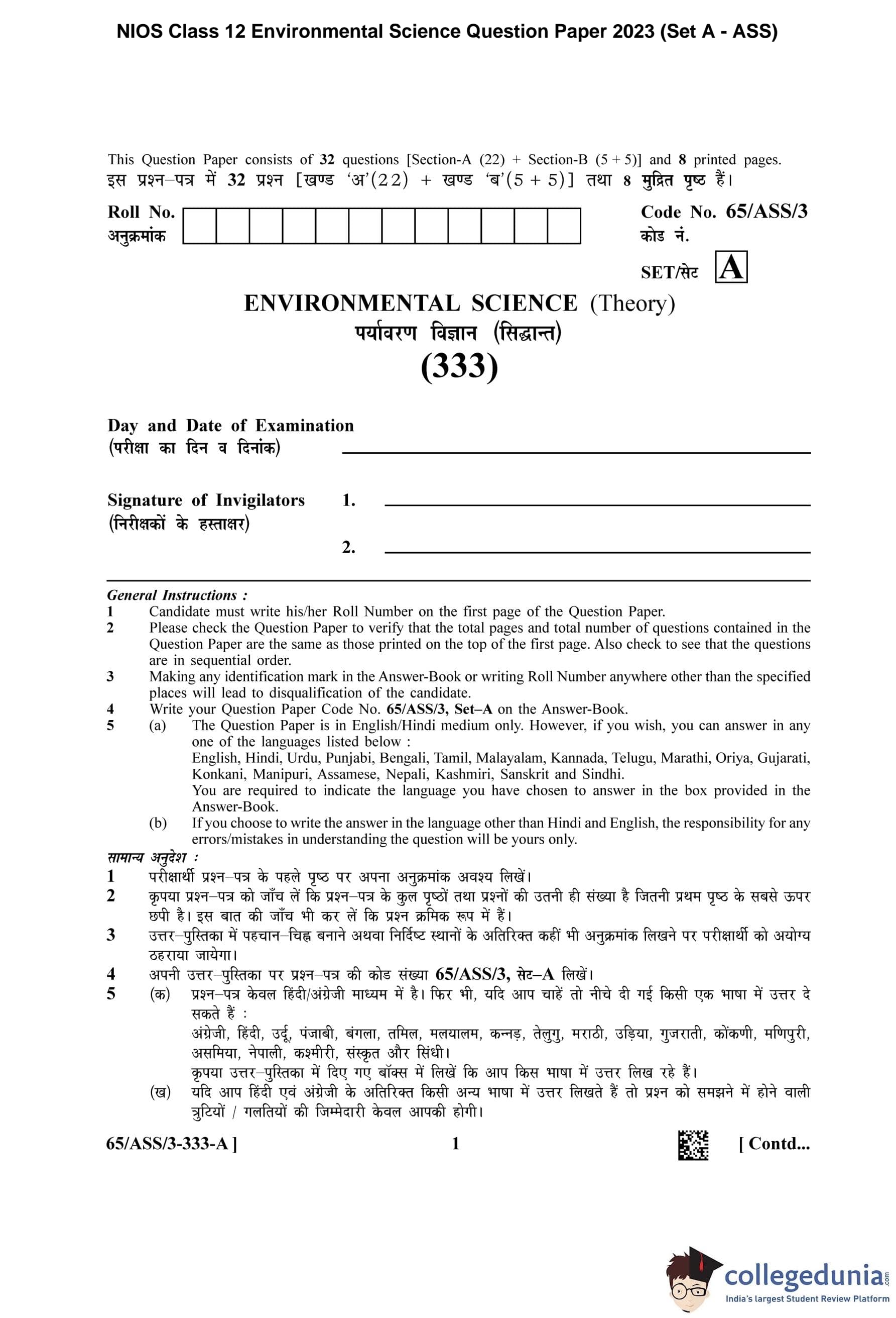 NIOS Class 12 Environmental Science Question Paper 2023 with Answer Key pdf (Set A - ASS) is available for download here. The exam was conducted by National Institute of Open Schooling on April 24, 2023 in the Afternoon Session 2.30 PM to 5.30 PM. The question paper comprised a total of 32 questions divided among 2 sections.
