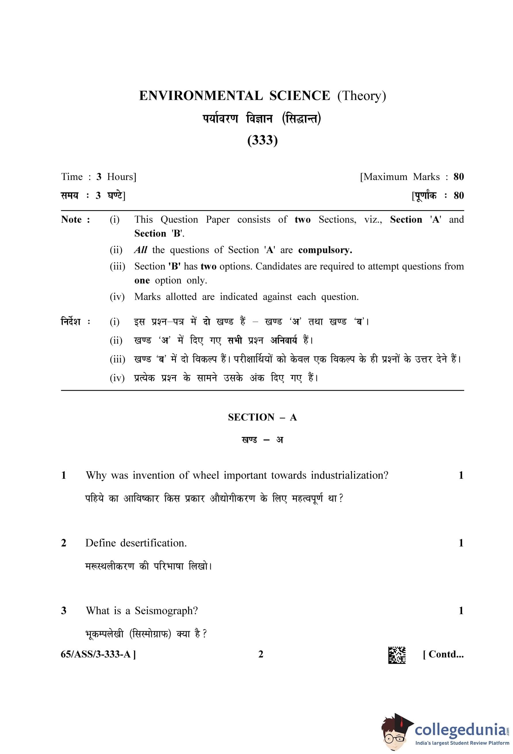NIOS Class 12 Environmental Science (Set A - ASS) Question Paper 2023 with Answer Key