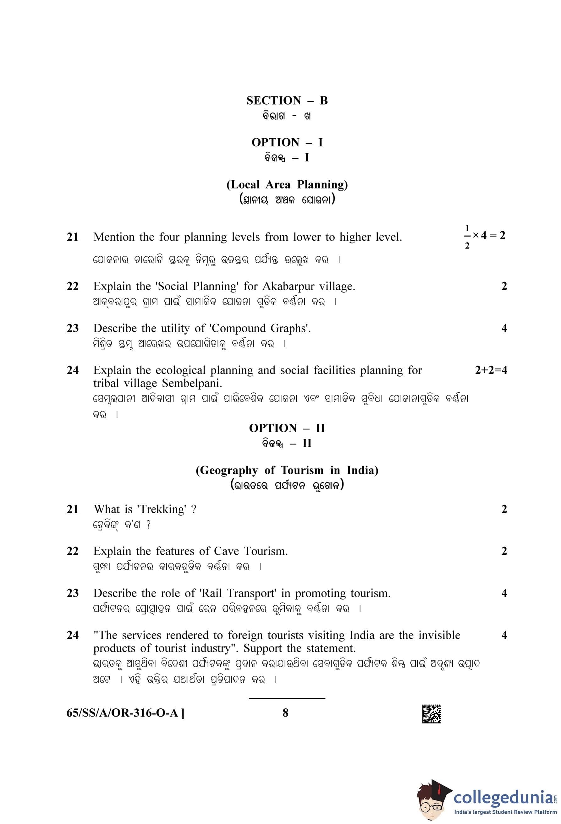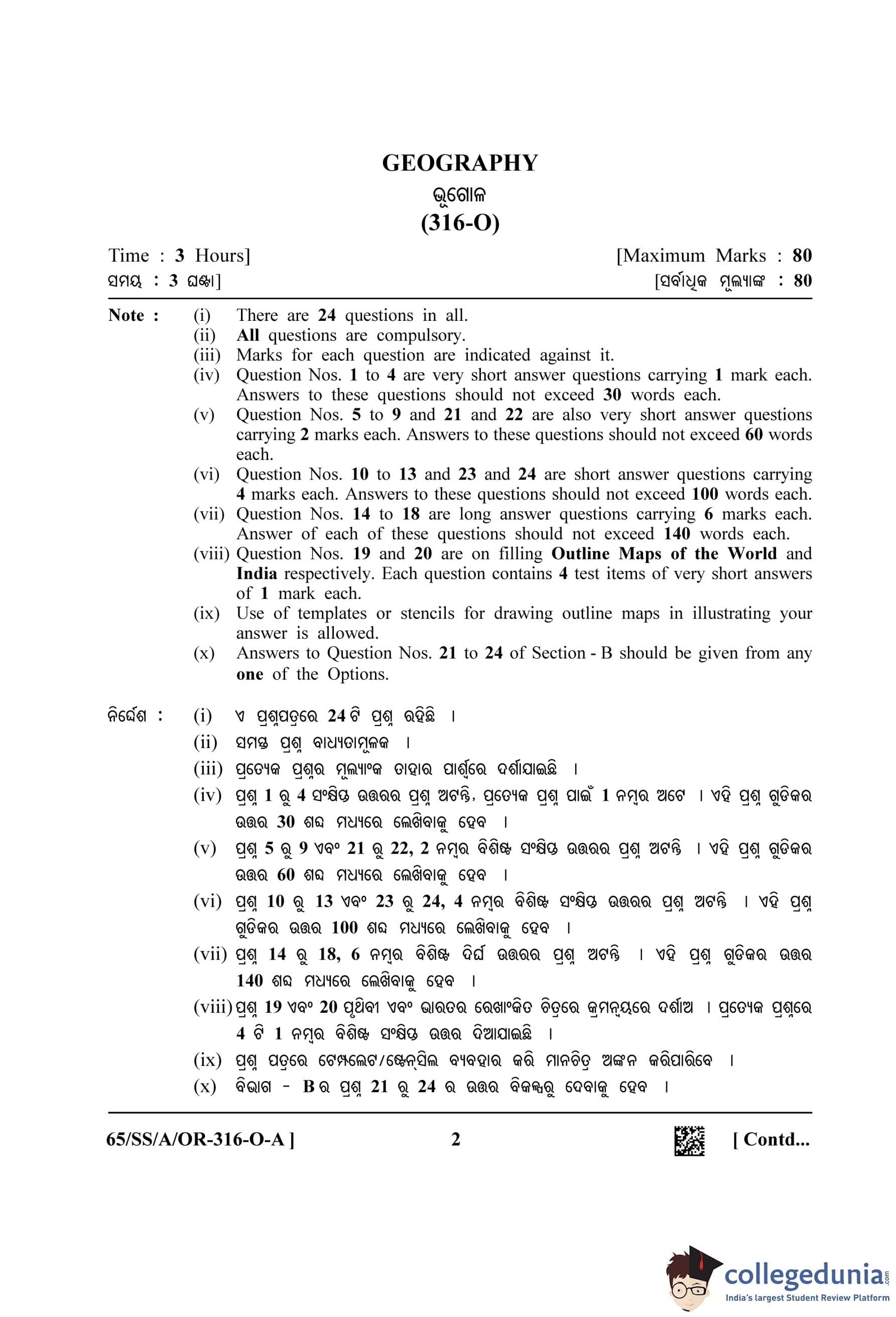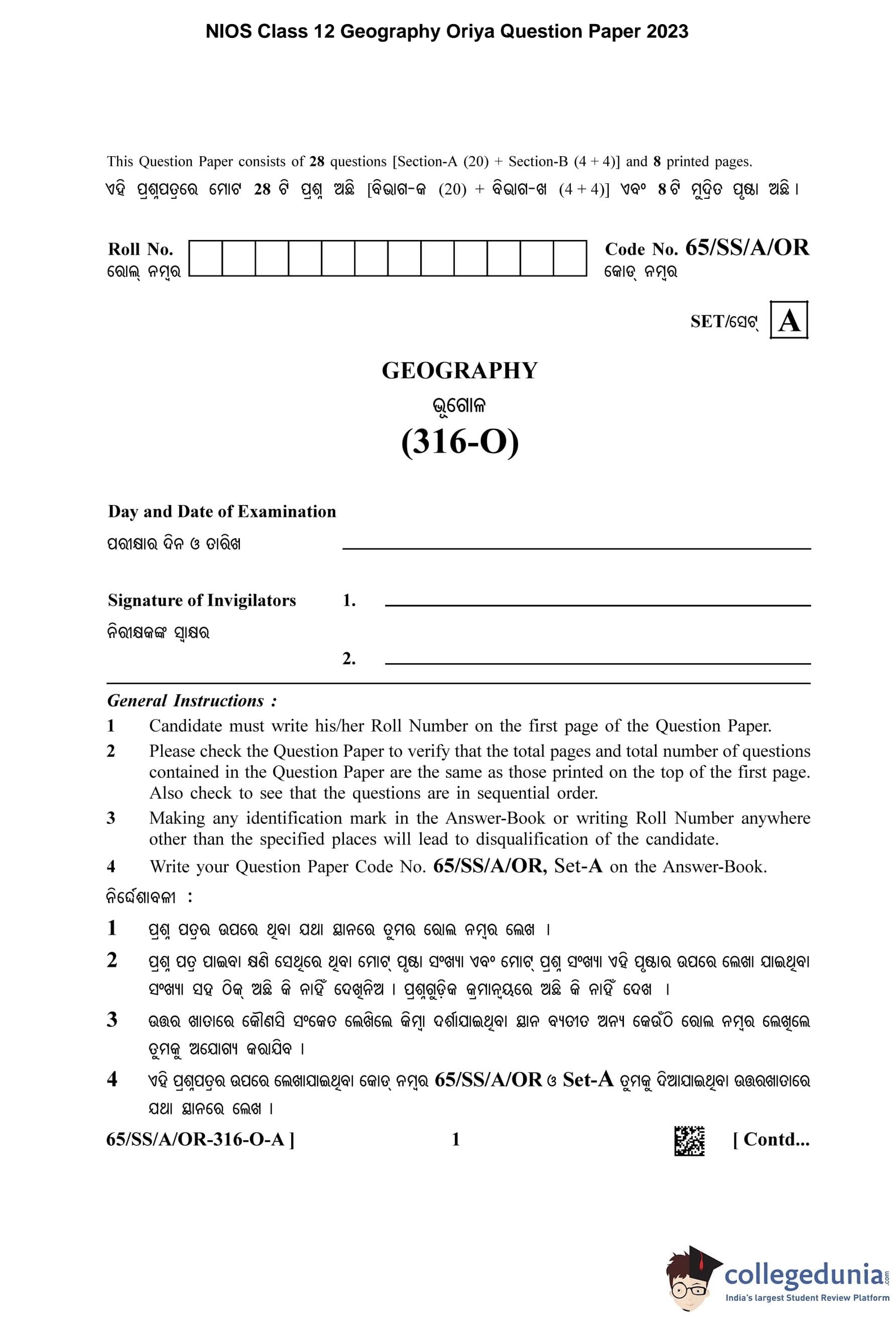 NIOS Class 12 Geography Oriya Question Paper 2023 with Answer Key pdf (Set A) is available for download here. The exam was conducted by National Institute of Open Schooling on April 29, 2023 in the Afternoon Session 2.30 PM to 5.30 PM. The question paper comprised a total of 28 questions divided among 2 sections.