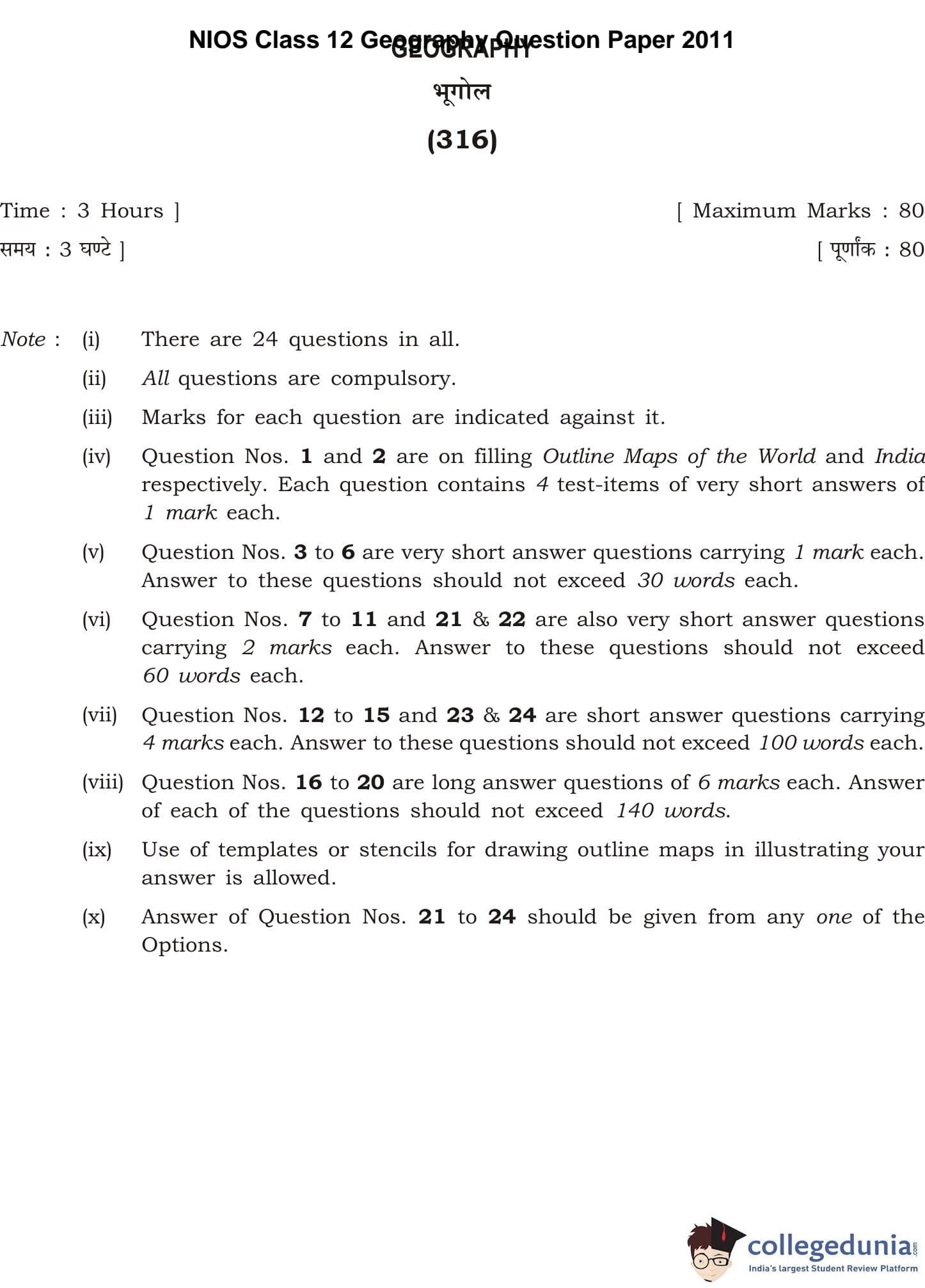 NIOS Class 12 Geography Question Paper 2011 with Answer Key pdf is available for download here. The exam was conducted by National Institute of Open Schooling. The question paper comprised a total of 24 questions divided among 2 sections.