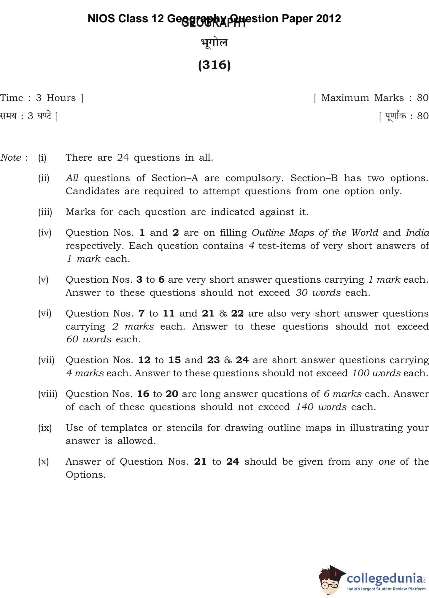 NIOS Class 12 Geography Question Paper 2012 with Answer Key pdf is available for download here. The exam was conducted by National Institute of Open Schooling. The question paper comprised a total of 24 questions divided among 2 sections.