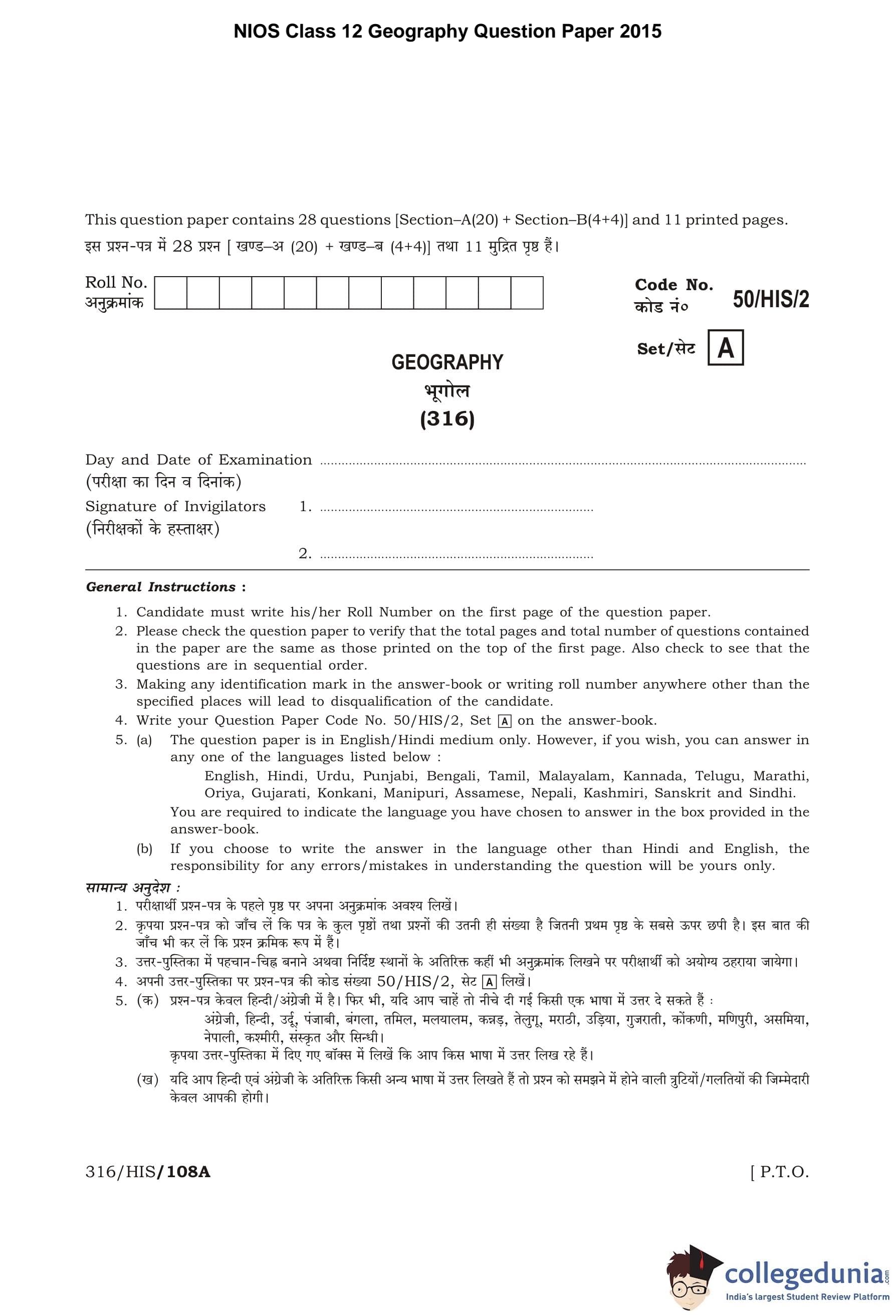 NIOS Class 12 Geography Question Paper 2015 with Answer Key