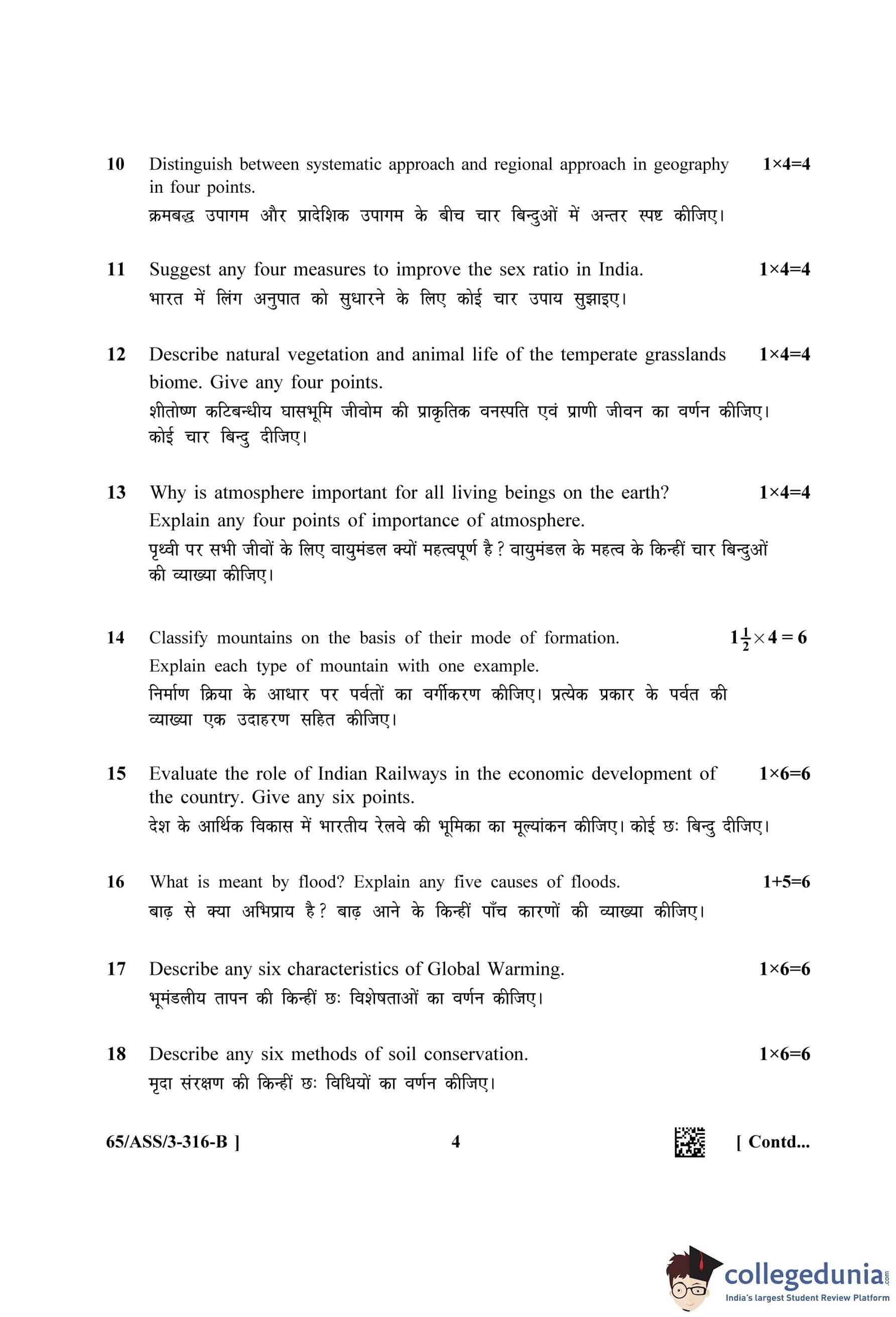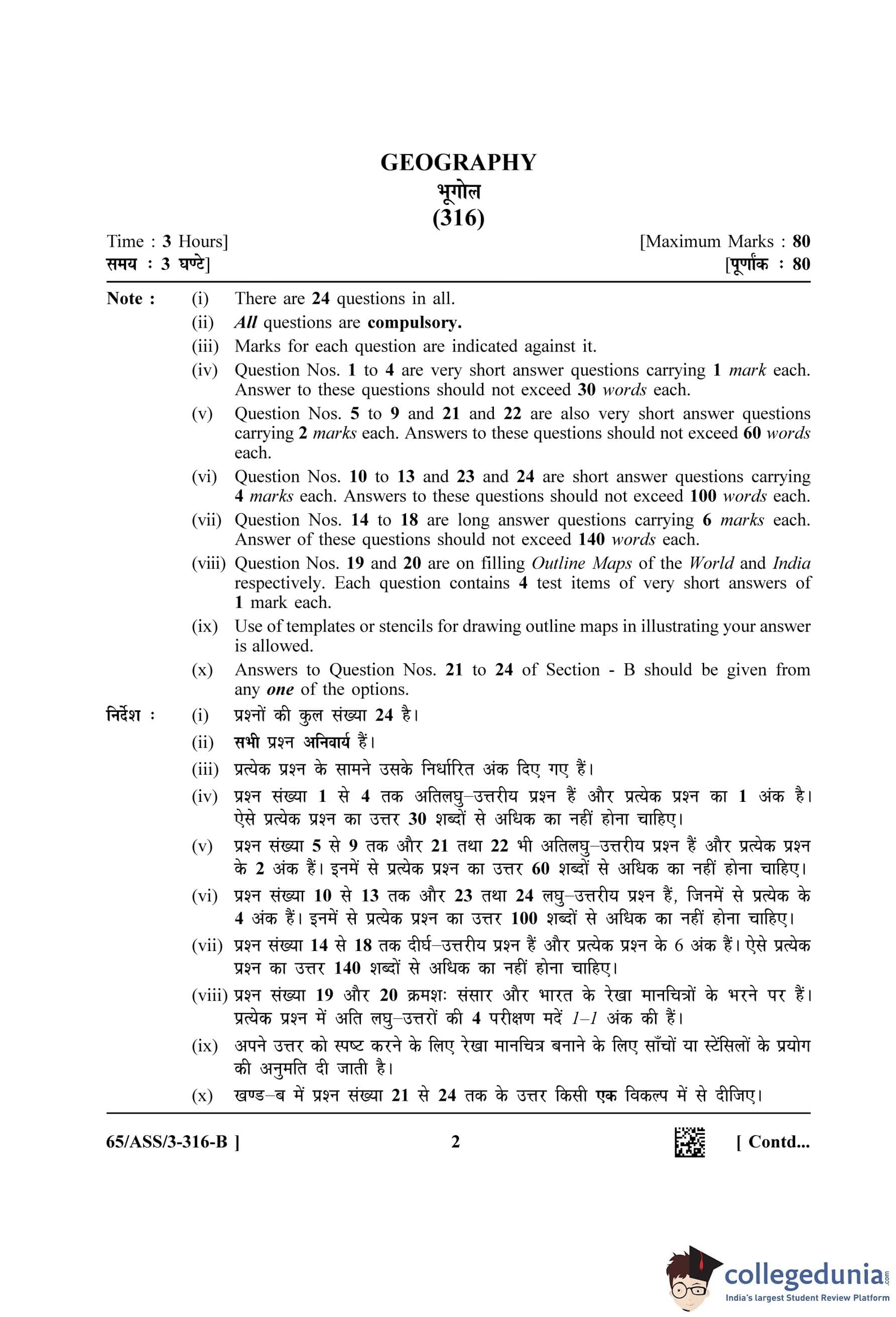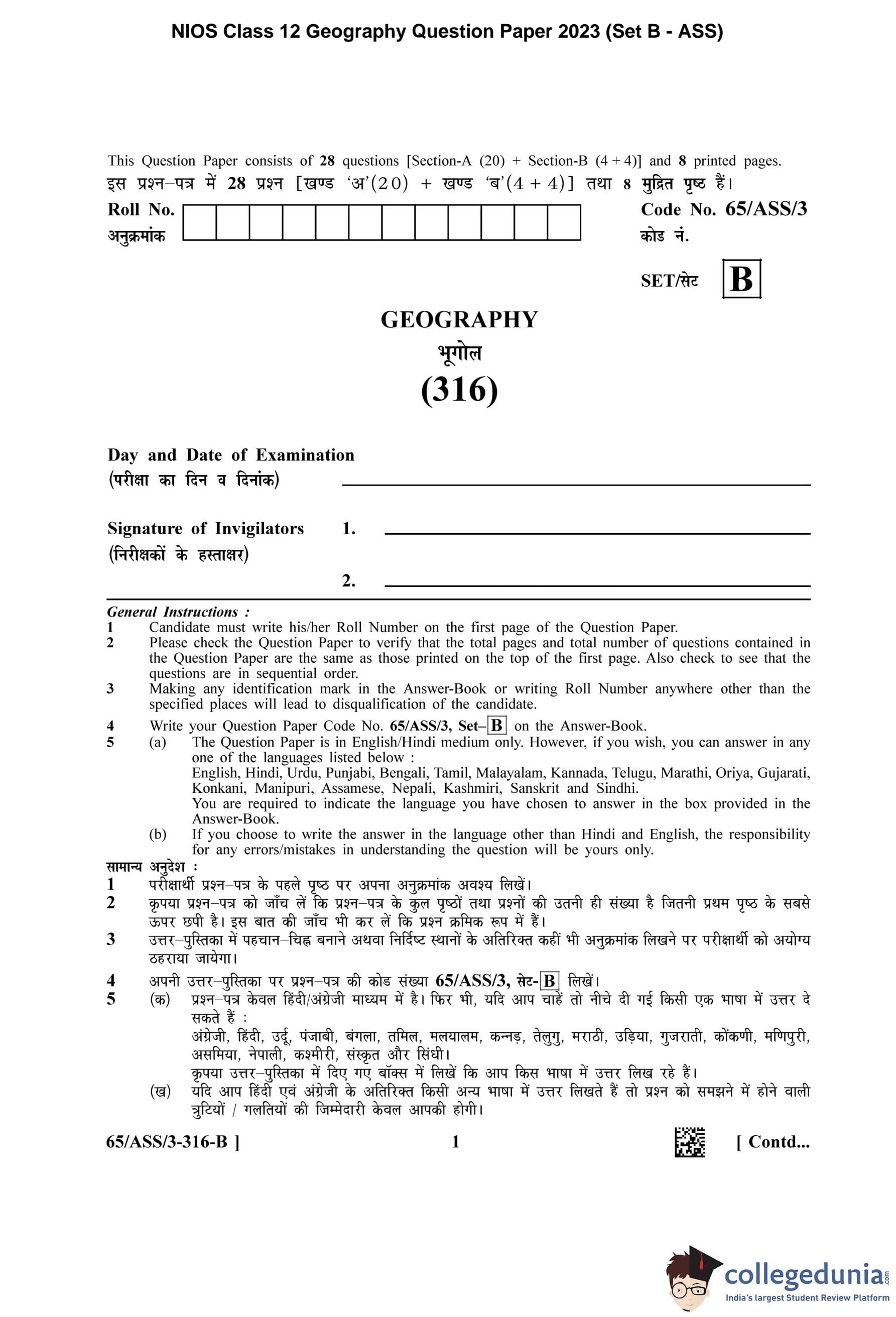 NIOS Class 12 Geography Question Paper 2023 with Answer Key pdf (Set B - ASS) is available for download here. The exam was conducted by National Institute of Open Schooling on April 29, 2023 in the Afternoon Session 2.30 PM to 5.30 PM. The question paper comprised a total of 28 questions divided among 2 sections.