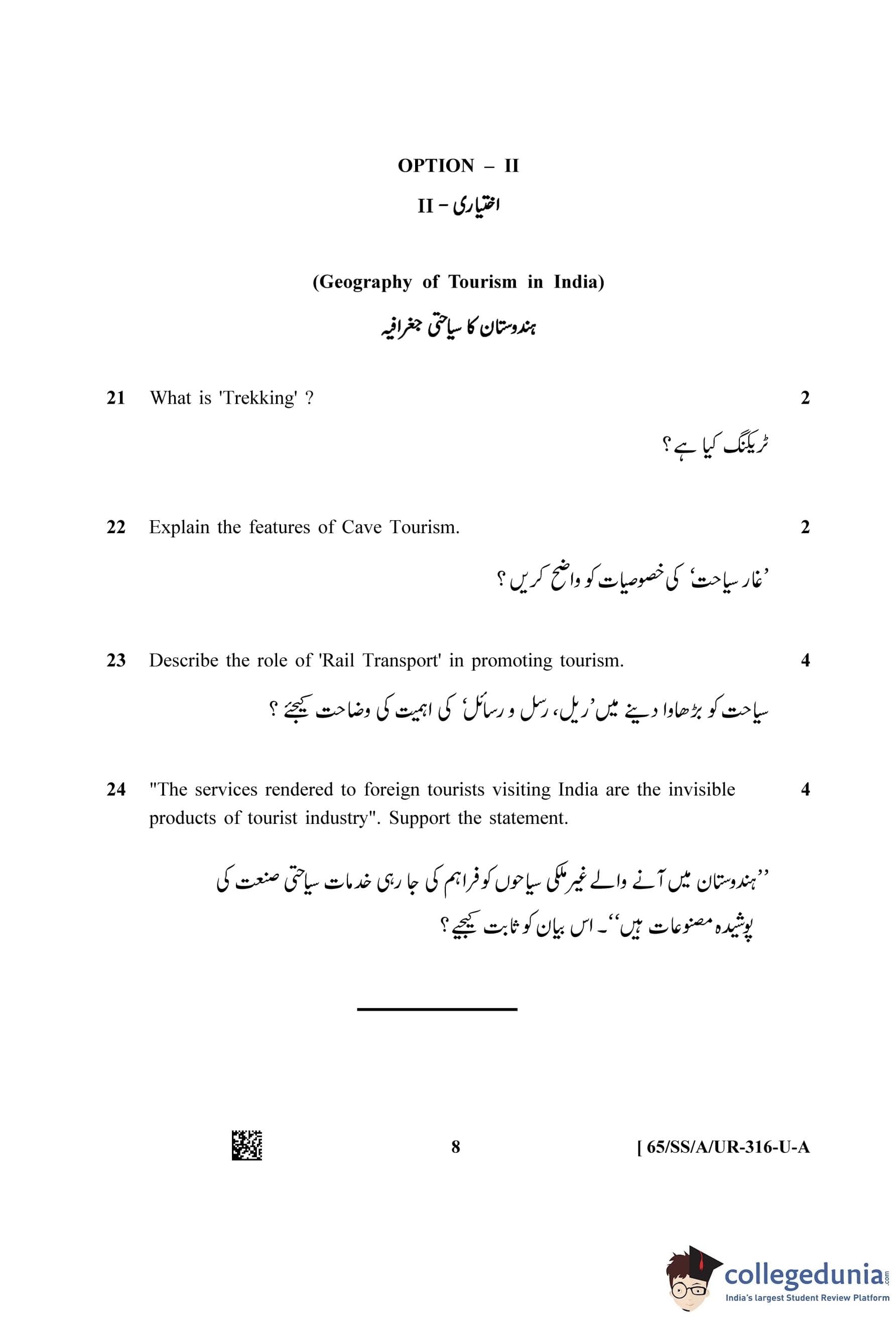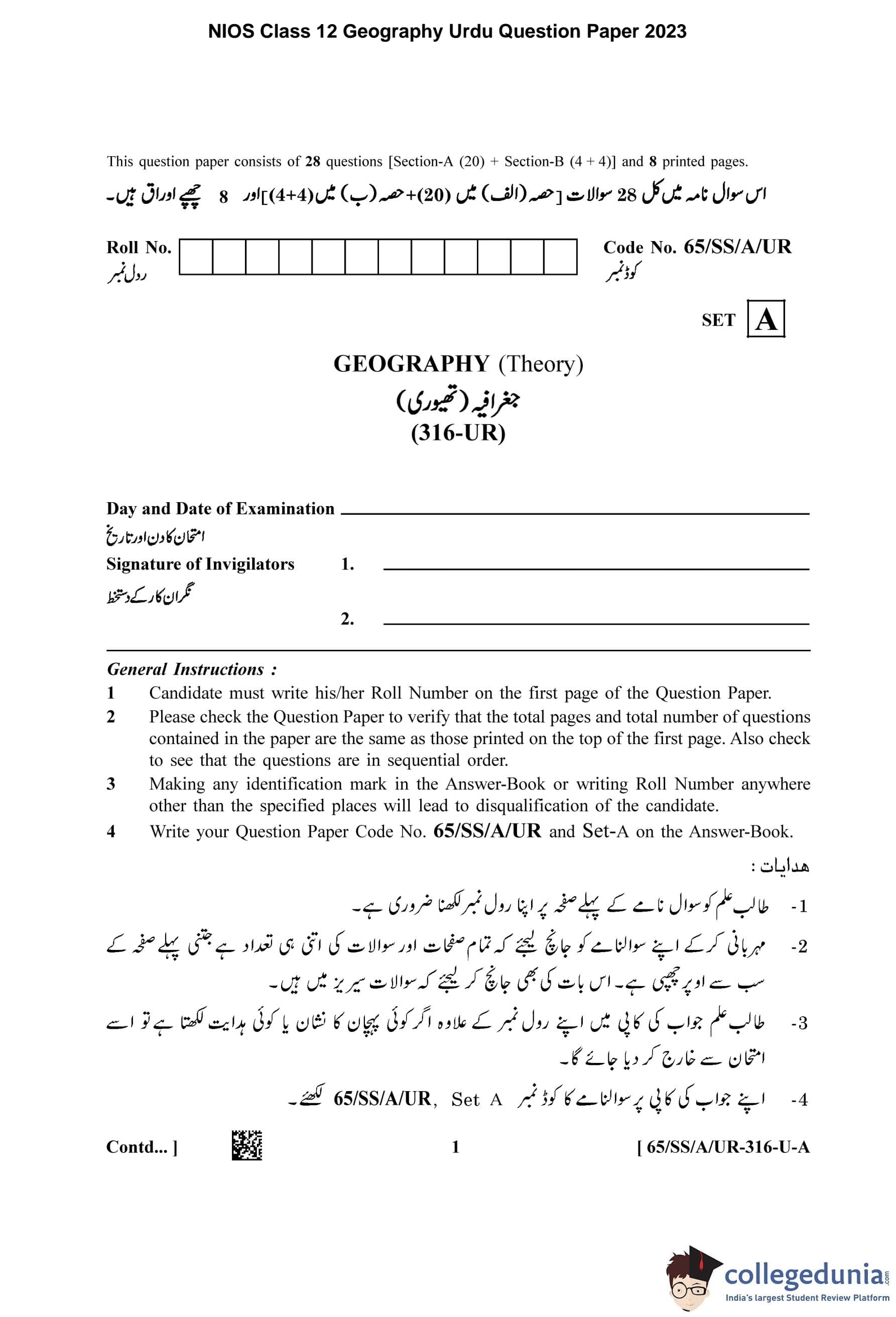 NIOS Class 12 Geography Urdu Question Paper 2023 with Answer Key pdf (Set A) is available for download here. The exam was conducted by National Institute of Open Schooling on April 29, 2023 in the Afternoon Session 2.30 PM to 5.30 PM. The question paper comprised a total of 28 questions divided among 2 sections.