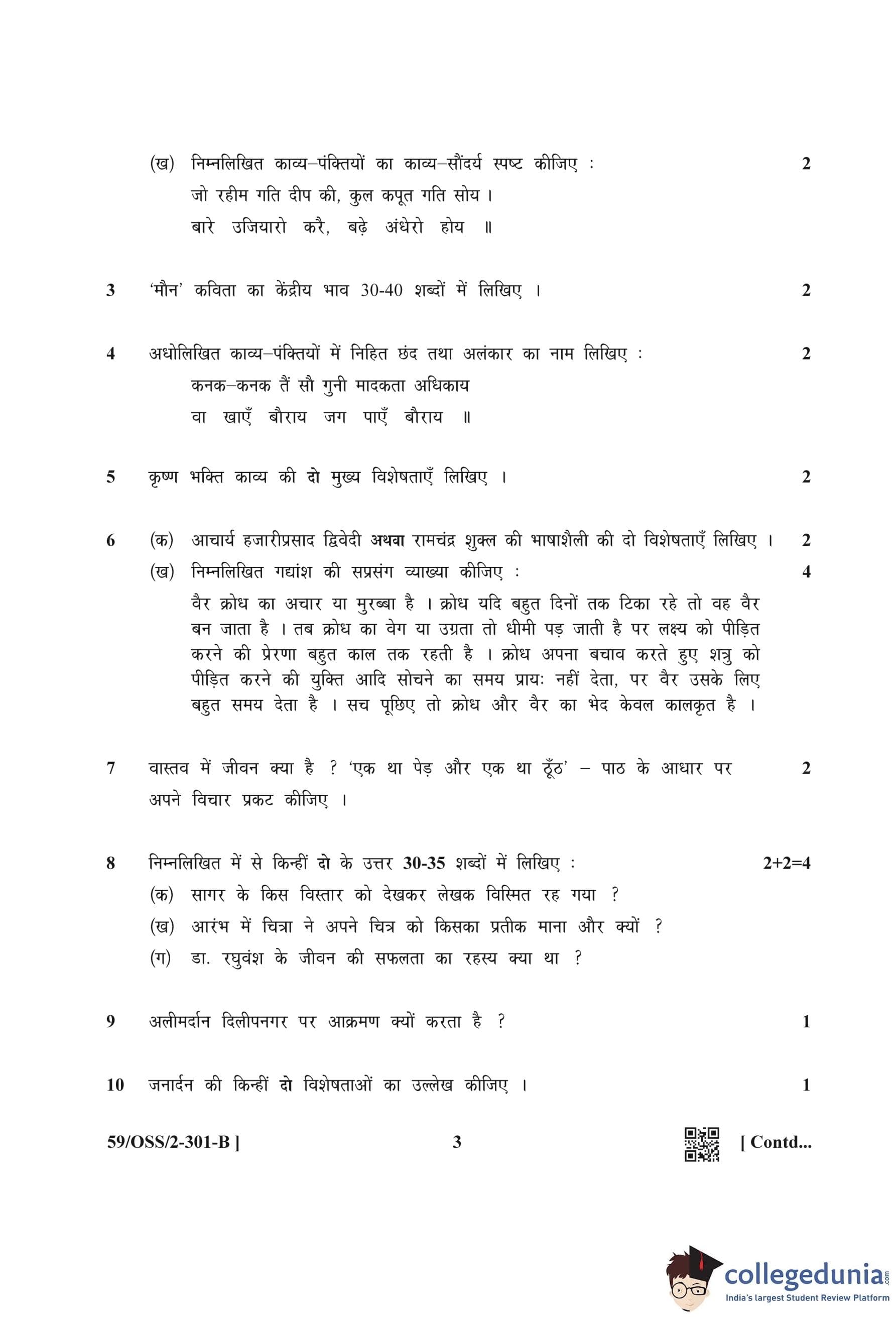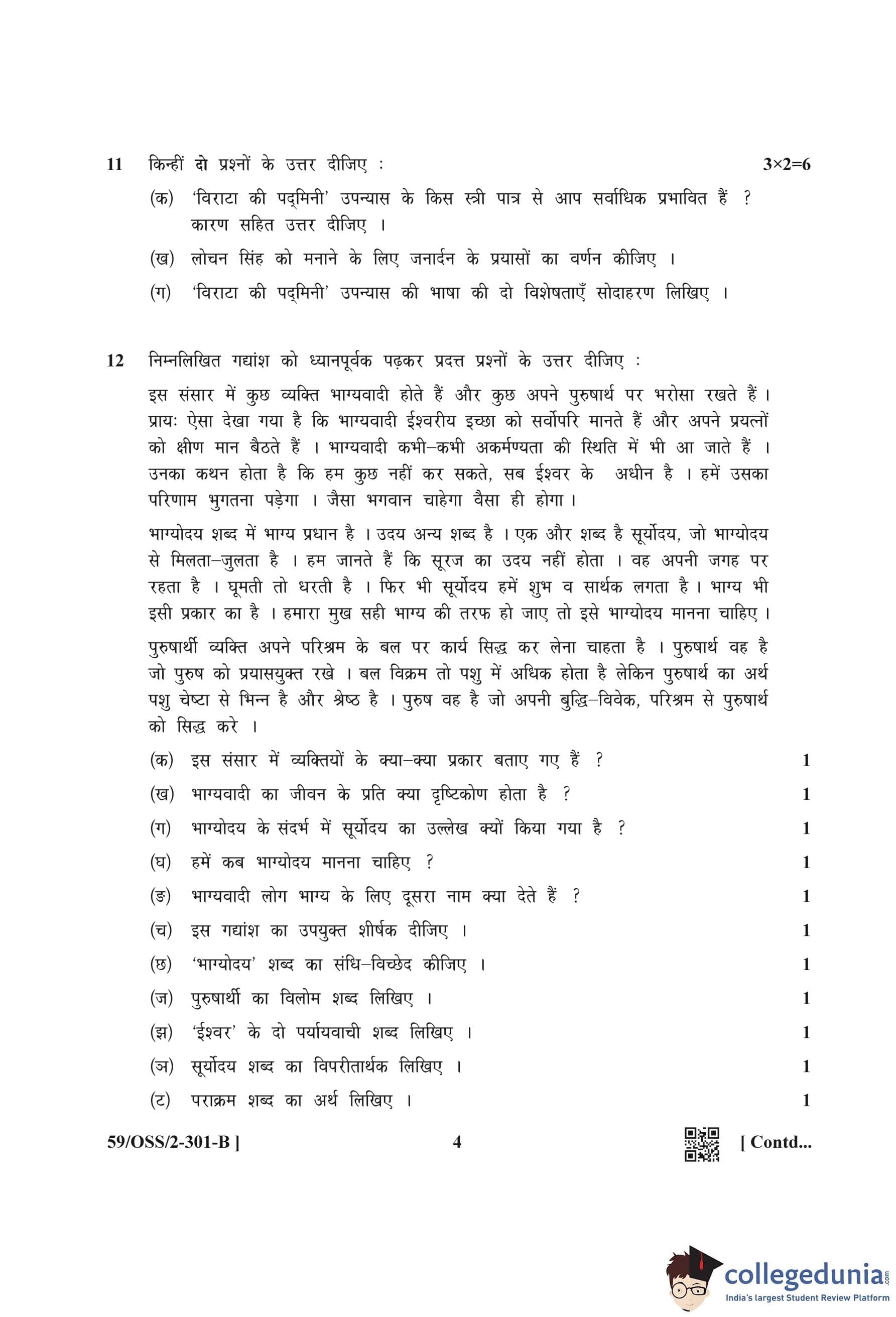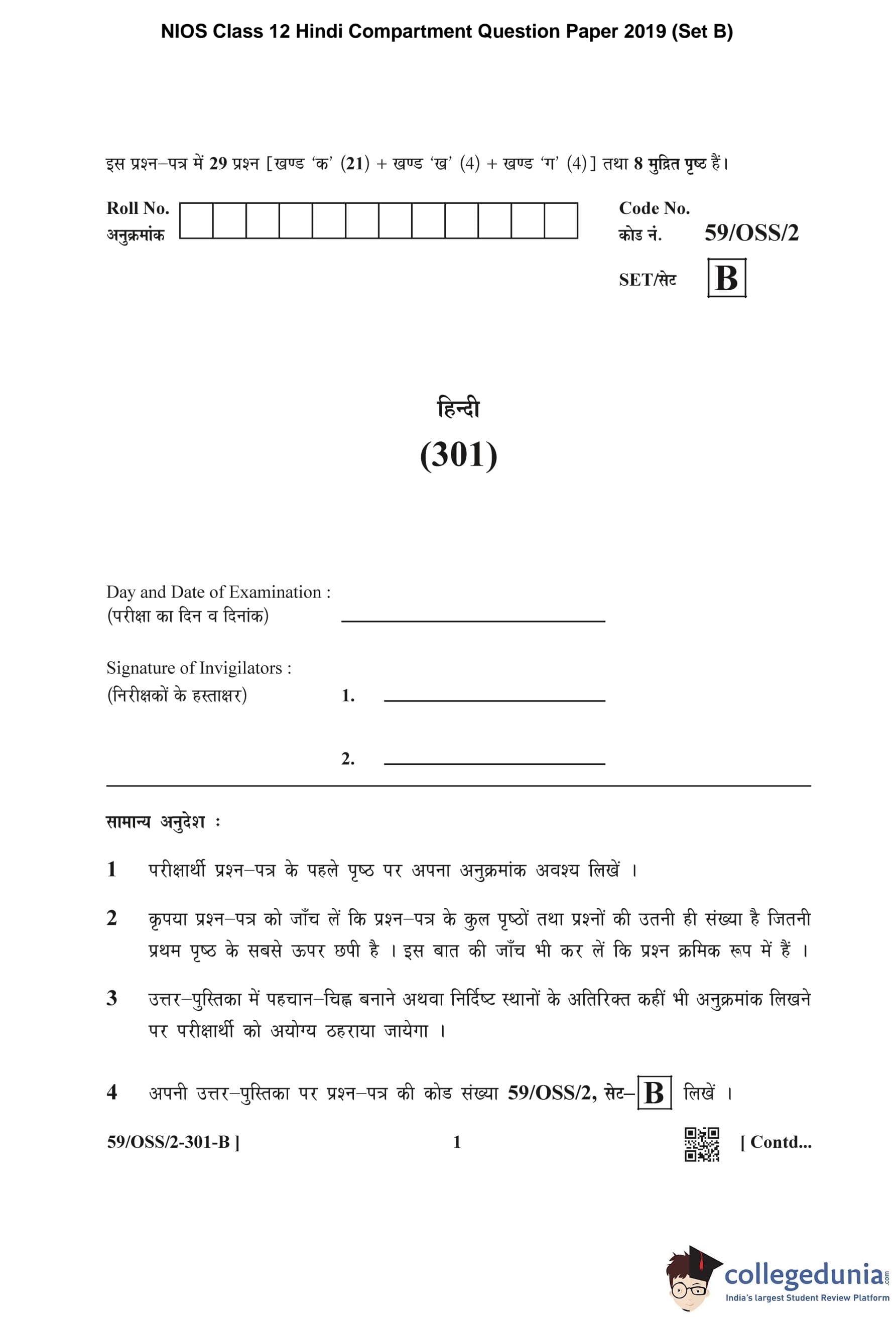 NIOS Class 12 Hindi (Set B) Compartment Question Paper 2019 with Answer Key