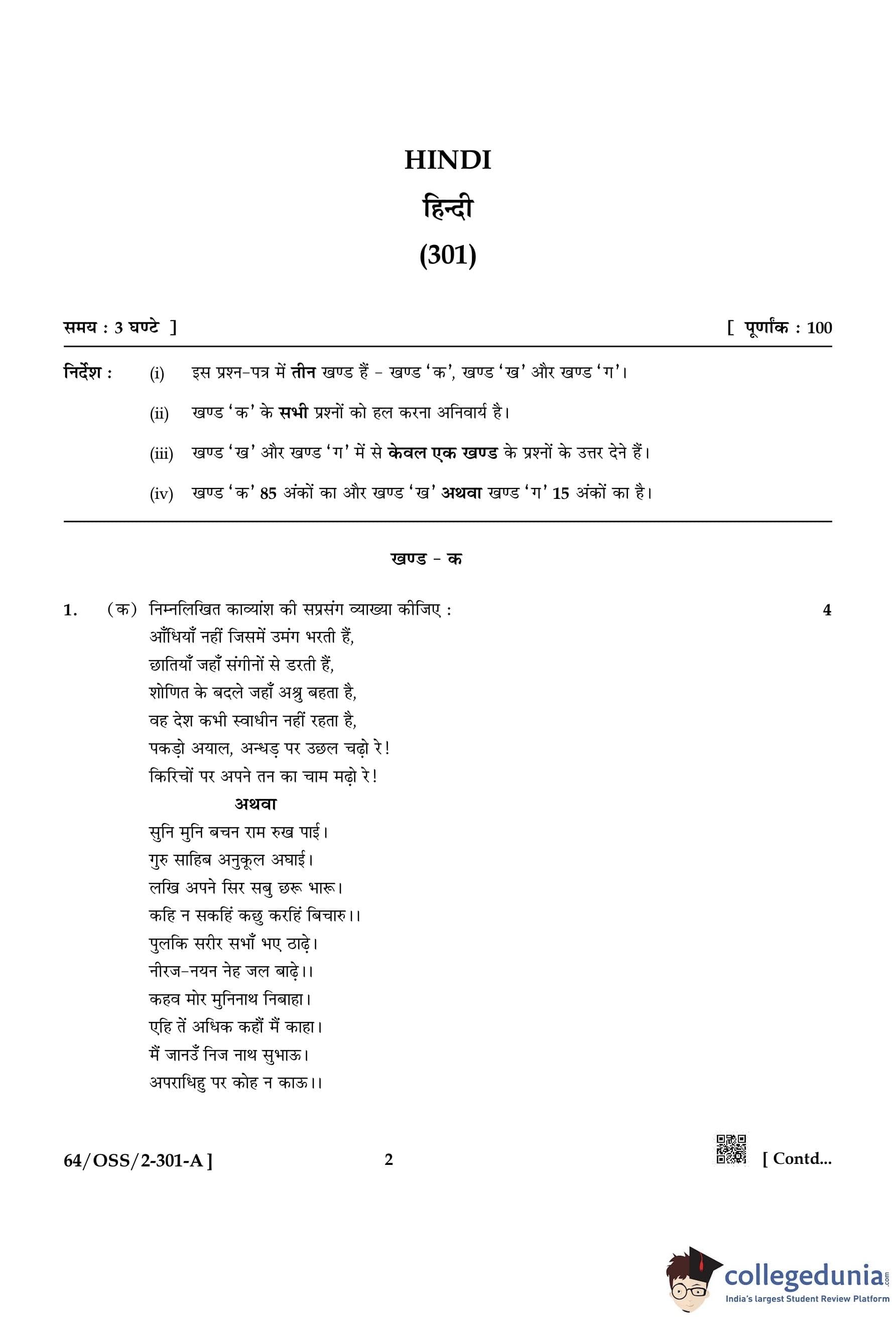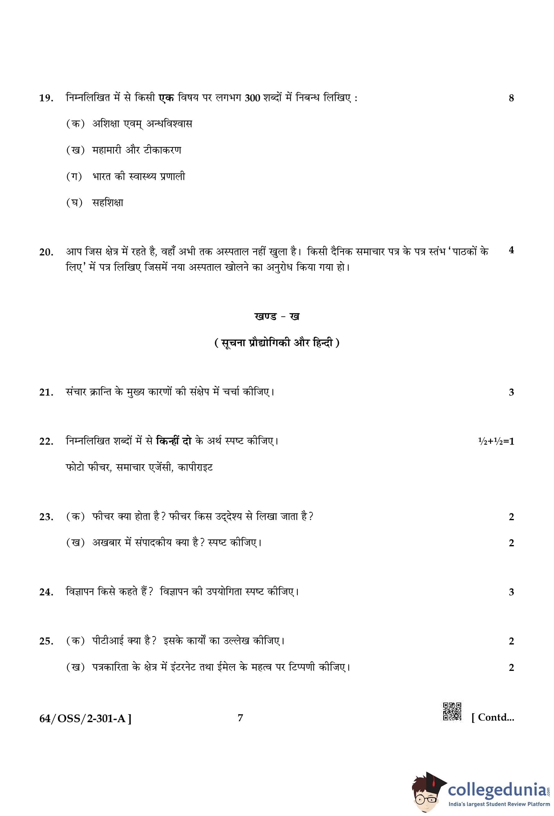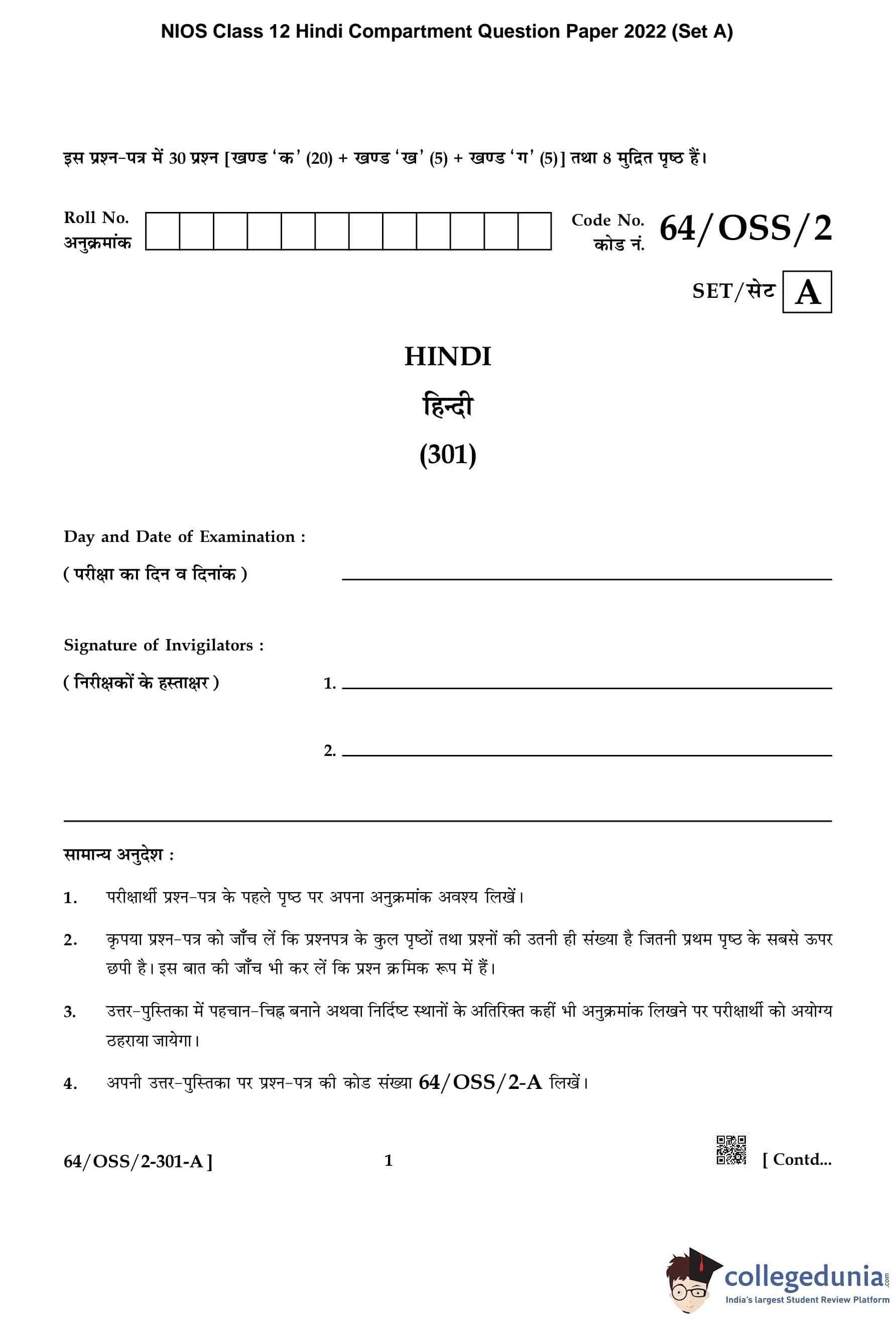 NIOS Class 12 Hindi Compartment Question Paper 2022 with Answer Key pdf (Set A) is available for download here. The exam was conducted by National Institute of Open Schooling on October 18, 2022 in the Afternoon Session 2:30 PM to 5:30 PM. The question paper comprised a total of 25 questions divided among 3 sections.