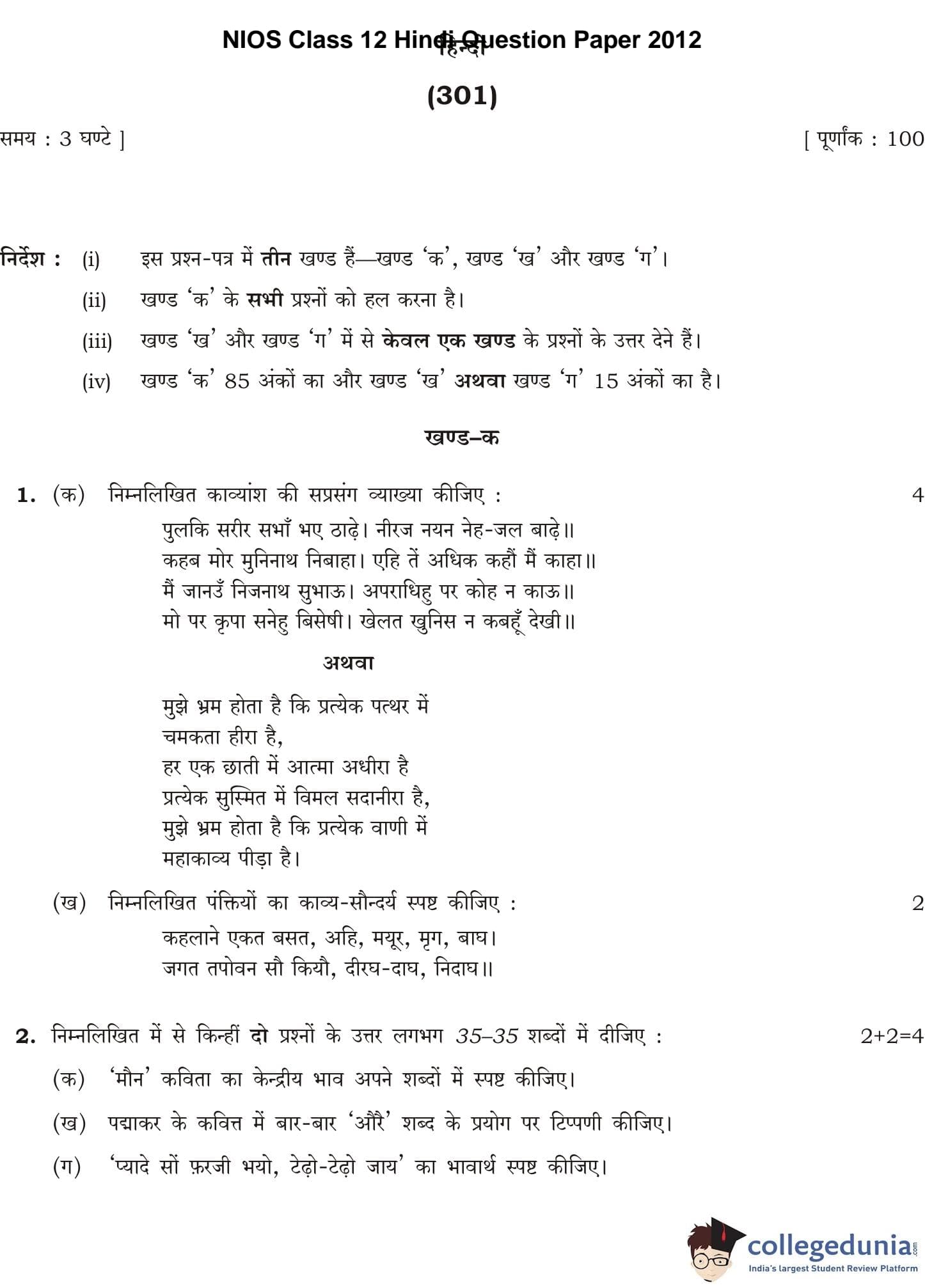 NIOS Class 12 Hindi Question Paper 2012 with Answer Key pdf is available for download here. The exam was conducted by National Institute of Open Schooling. The question paper comprised a total of 25 questions divided among 3 sections.
