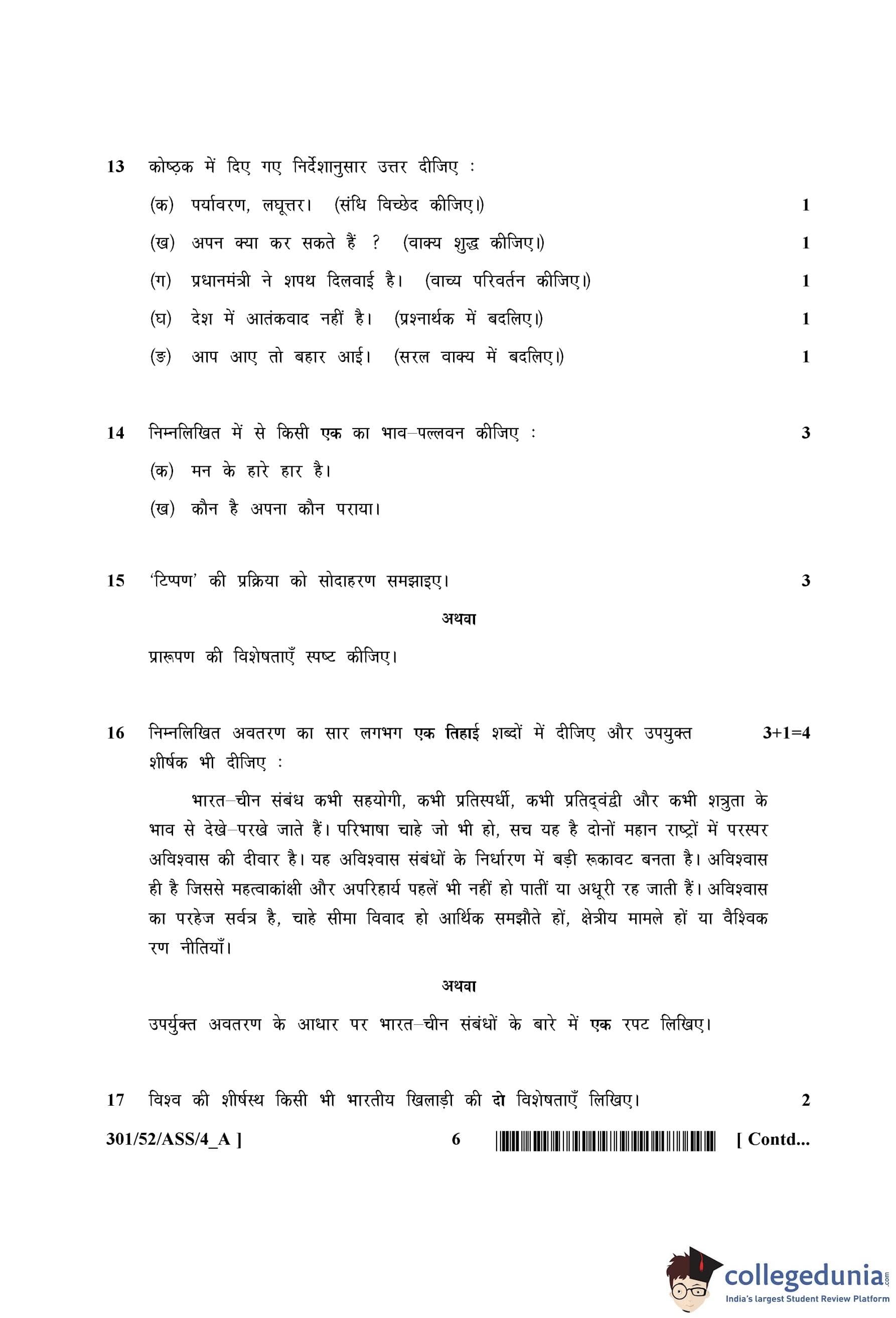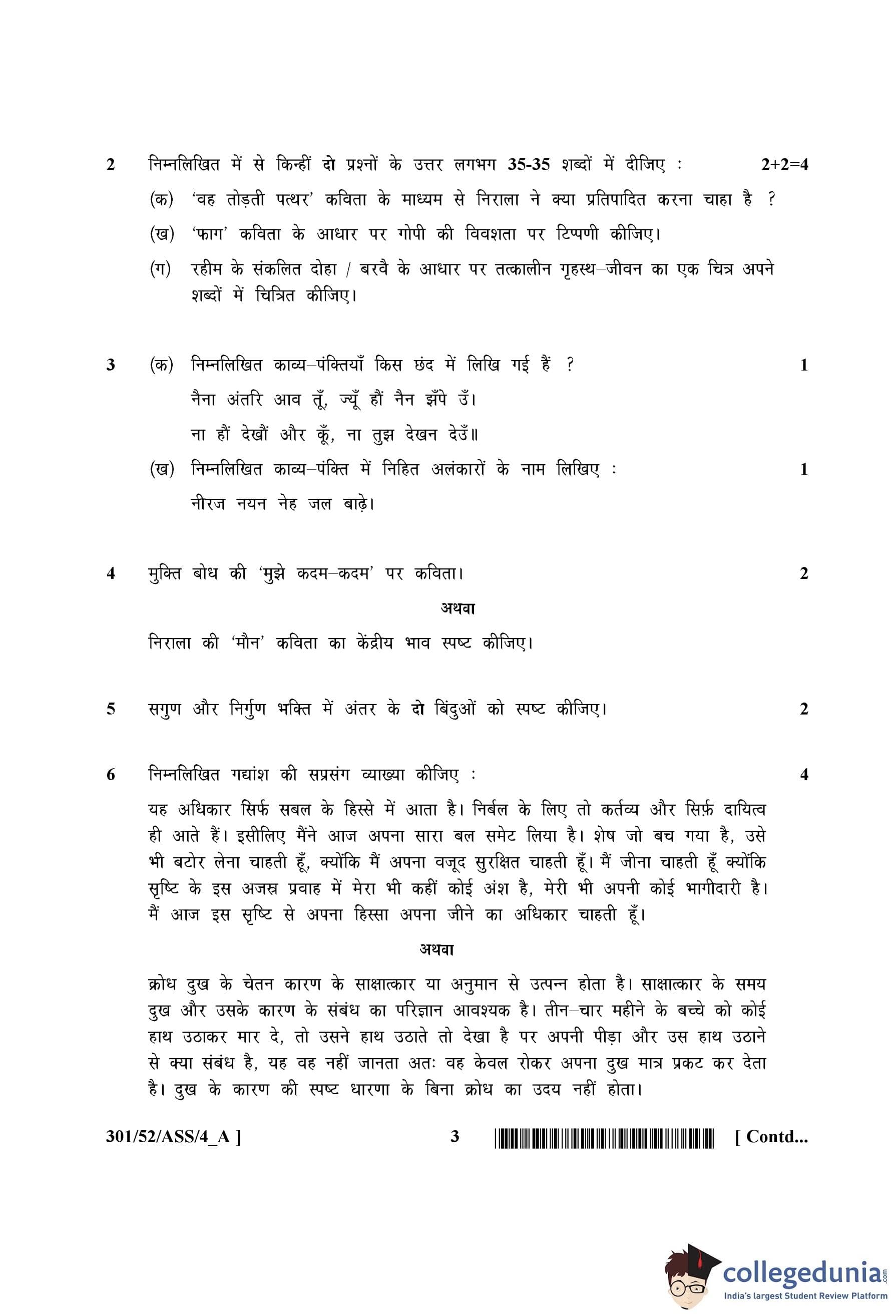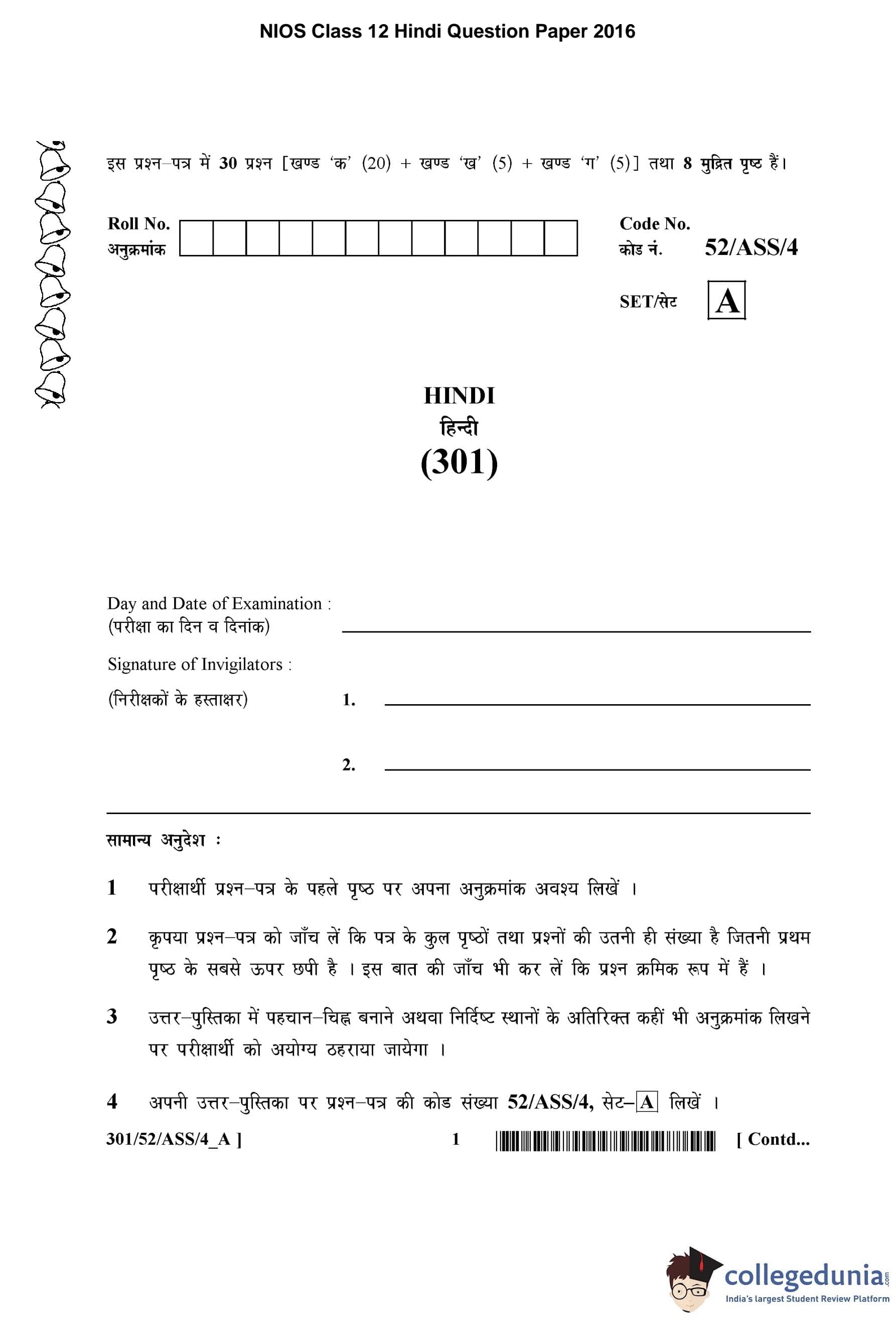 NIOS Class 12 Hindi Question Paper 2016 with Answer Key