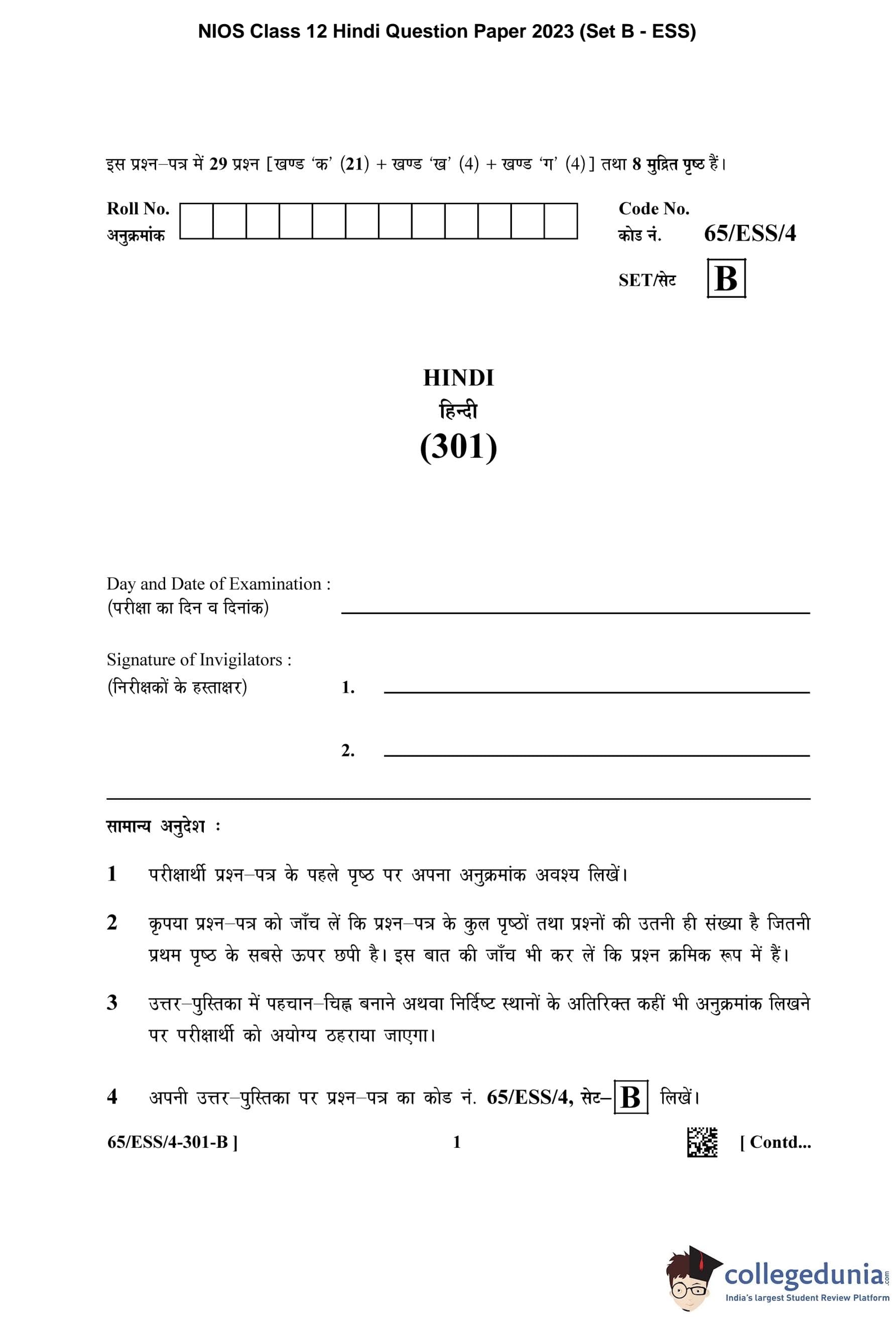 NIOS Class 12 Hindi Question Paper 2023 with Answer Key pdf (Set B - ESS) is available for download here. The exam was conducted by National Institute of Open Schooling on April 20, 2023 in the Afternoon Session 2.30 PM to 5.30 PM. The question paper comprised a total of 29 questions divided among 3 sections.