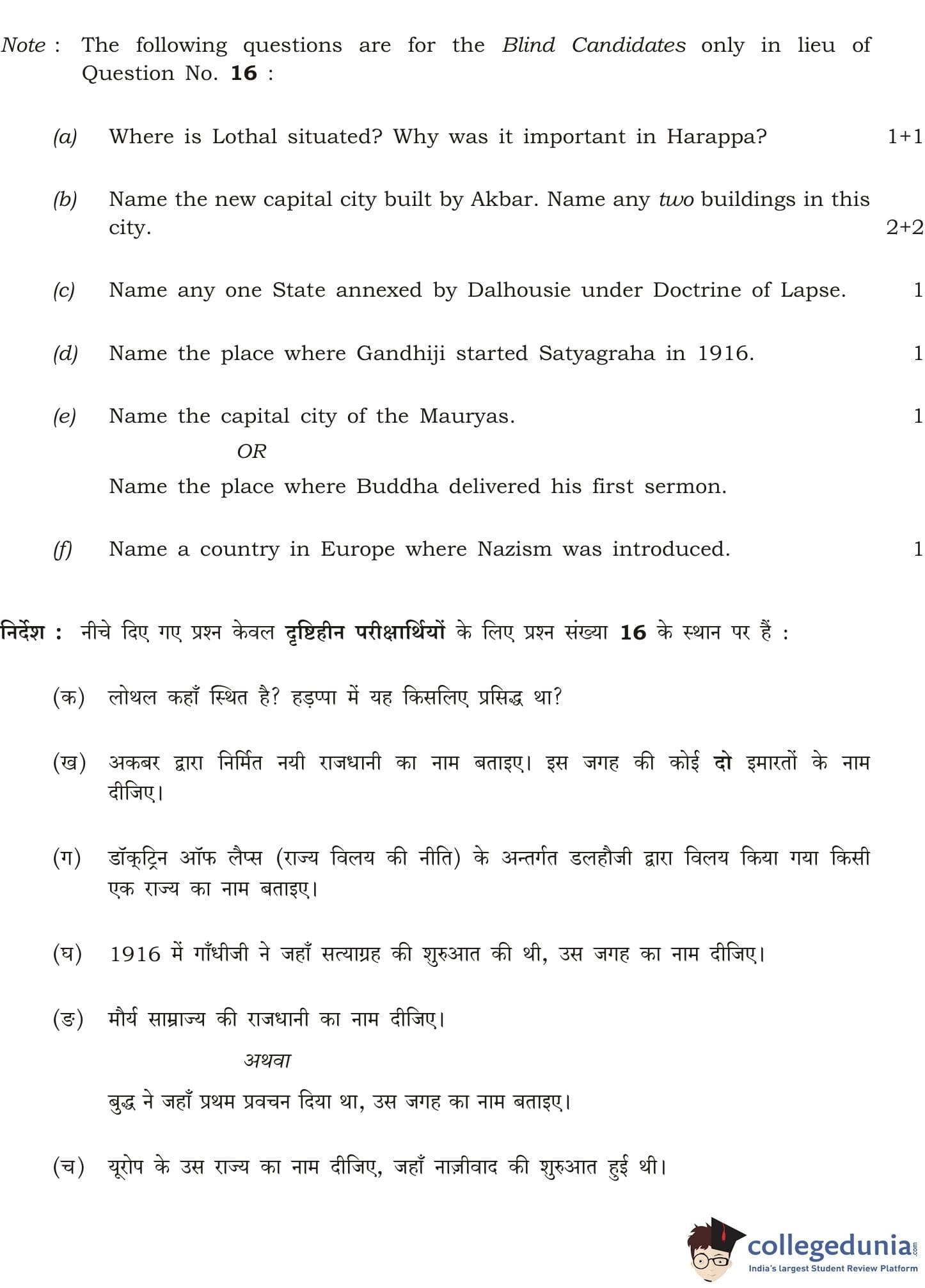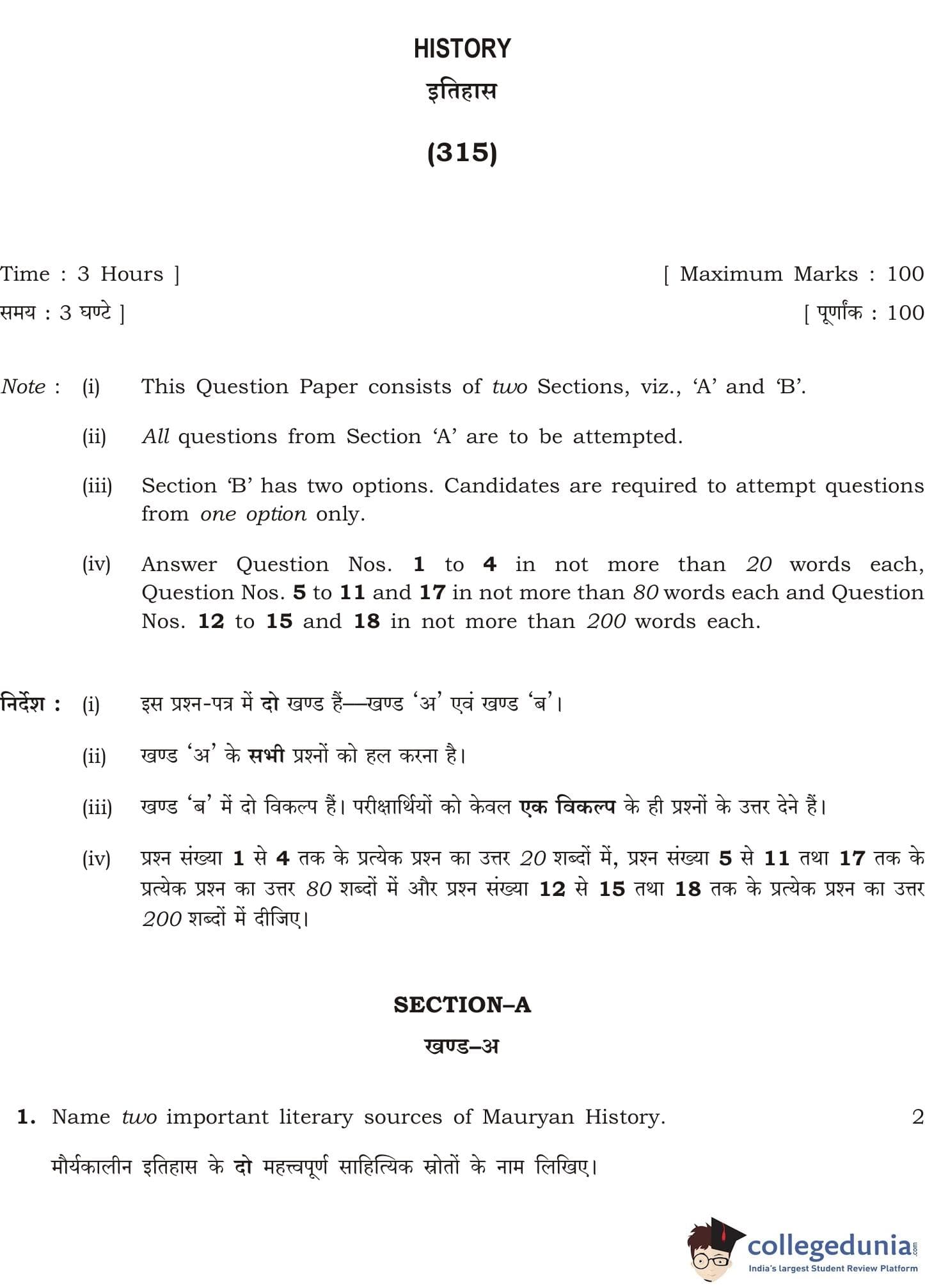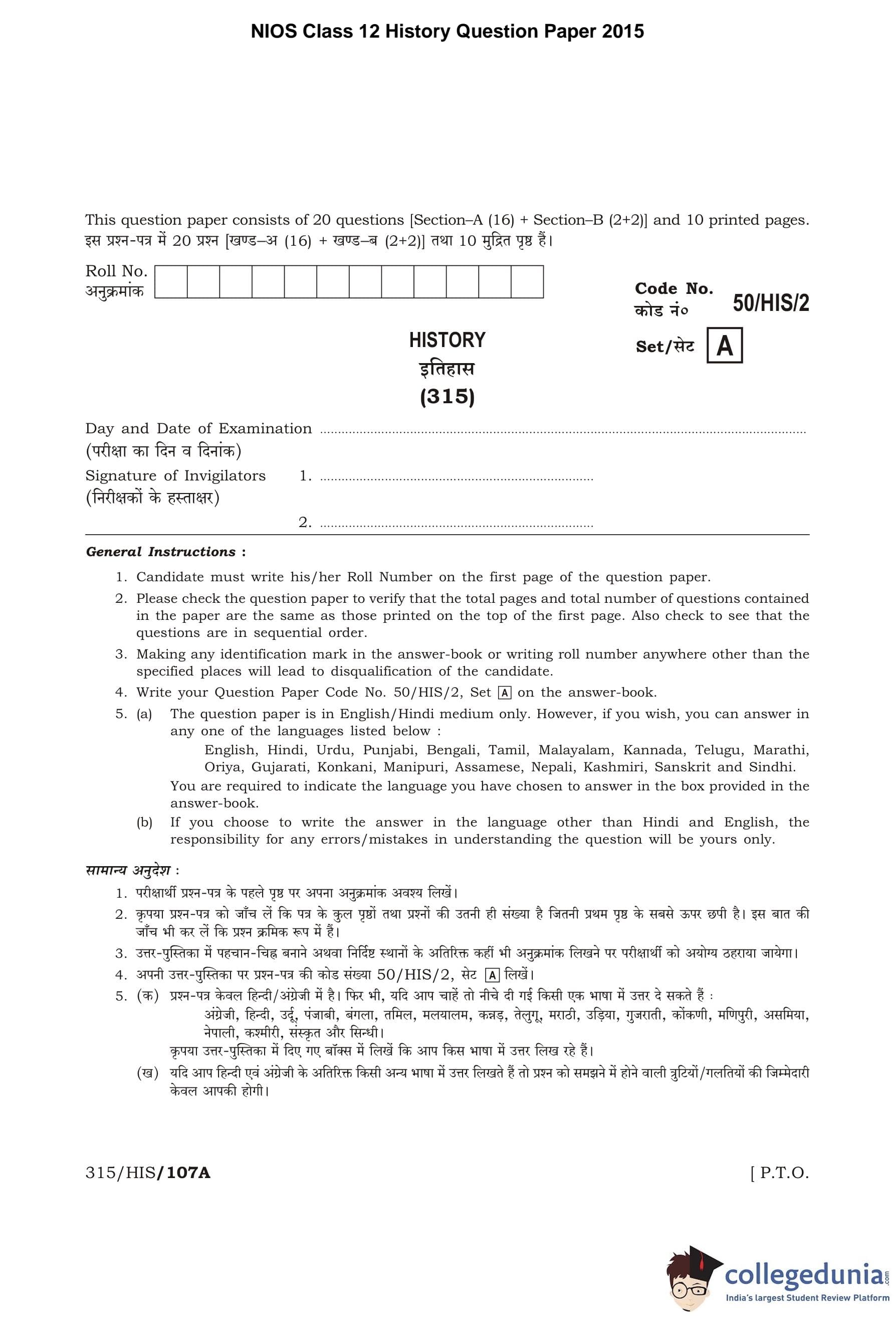 NIOS Class 12 History Question Paper 2015 with Answer Key