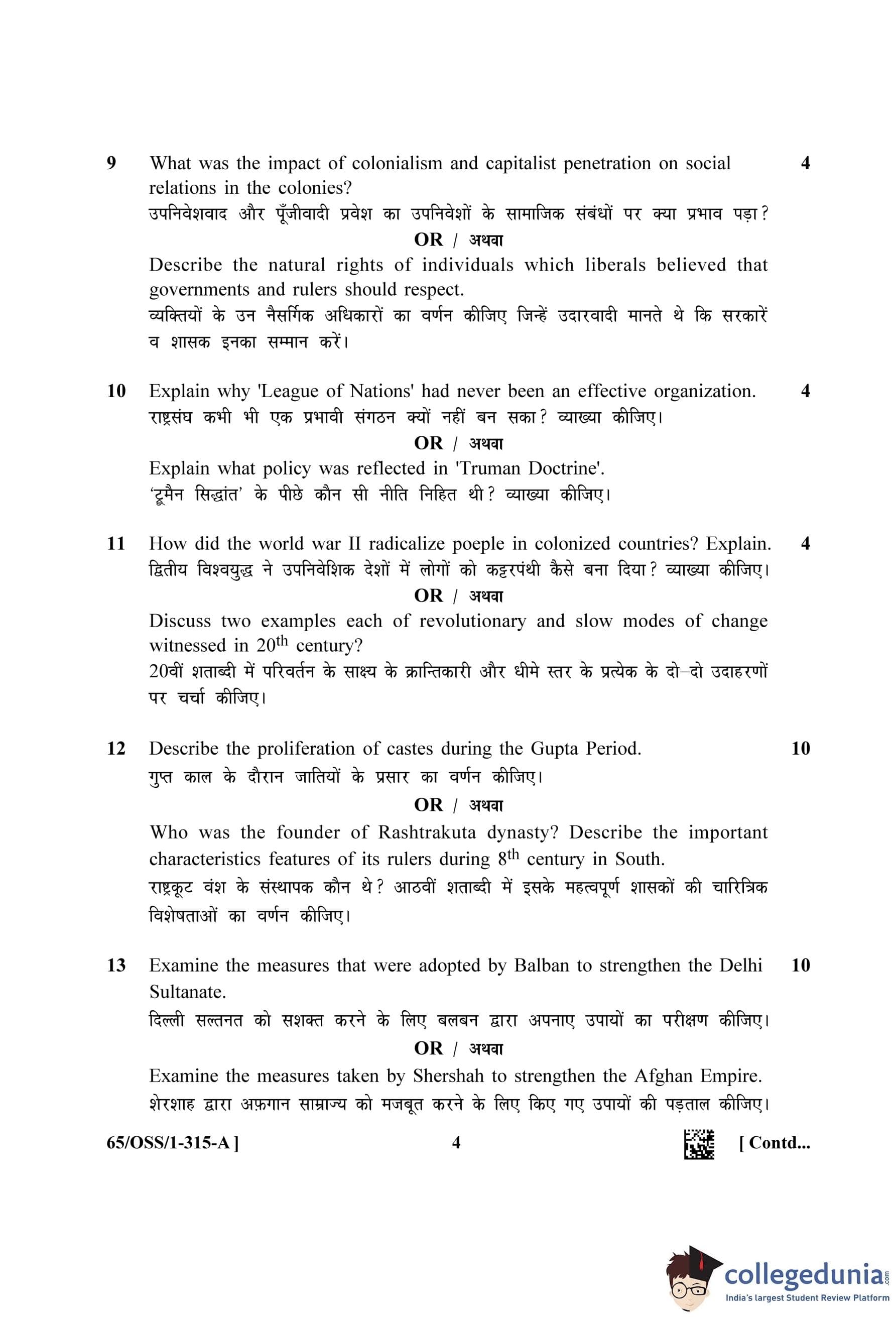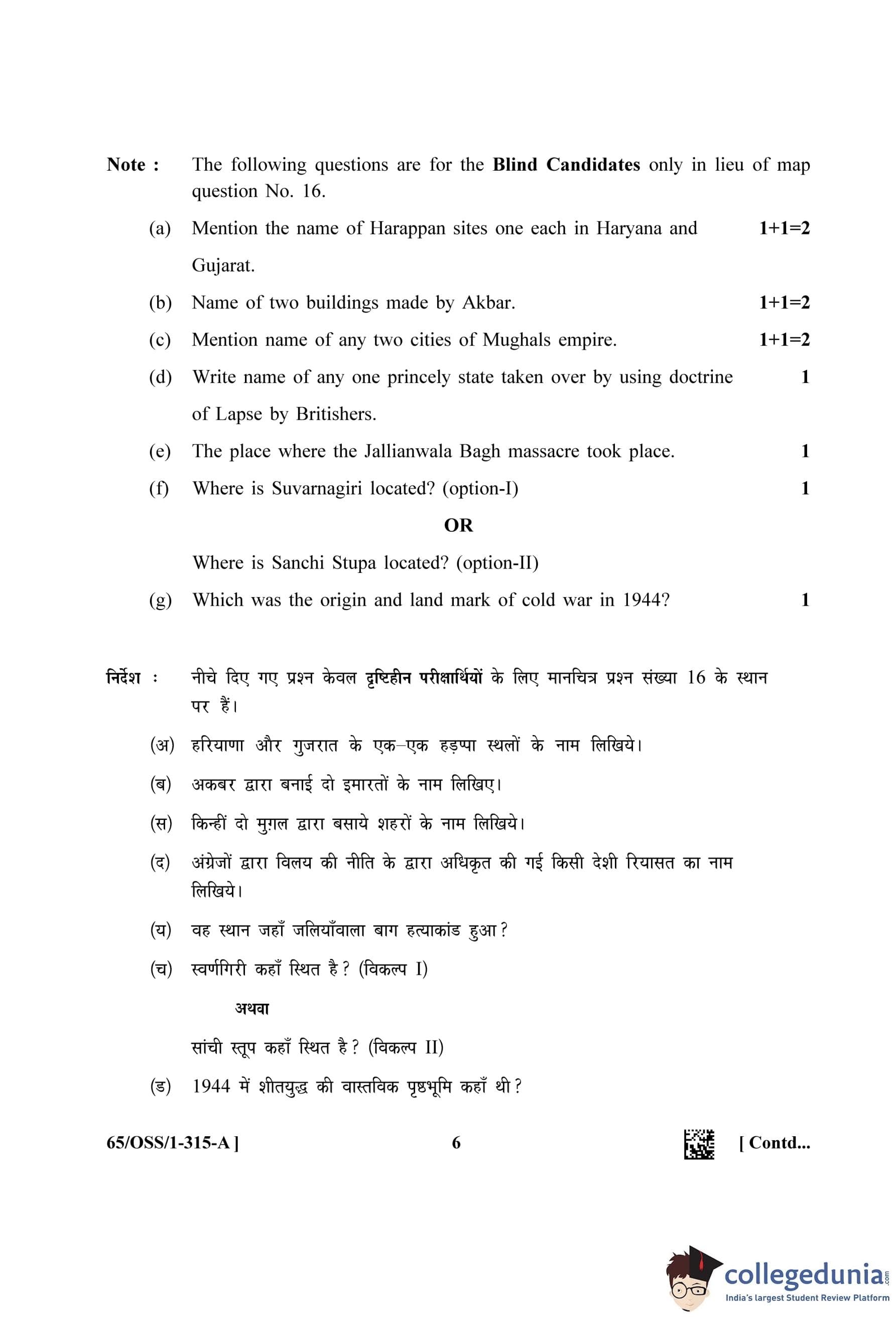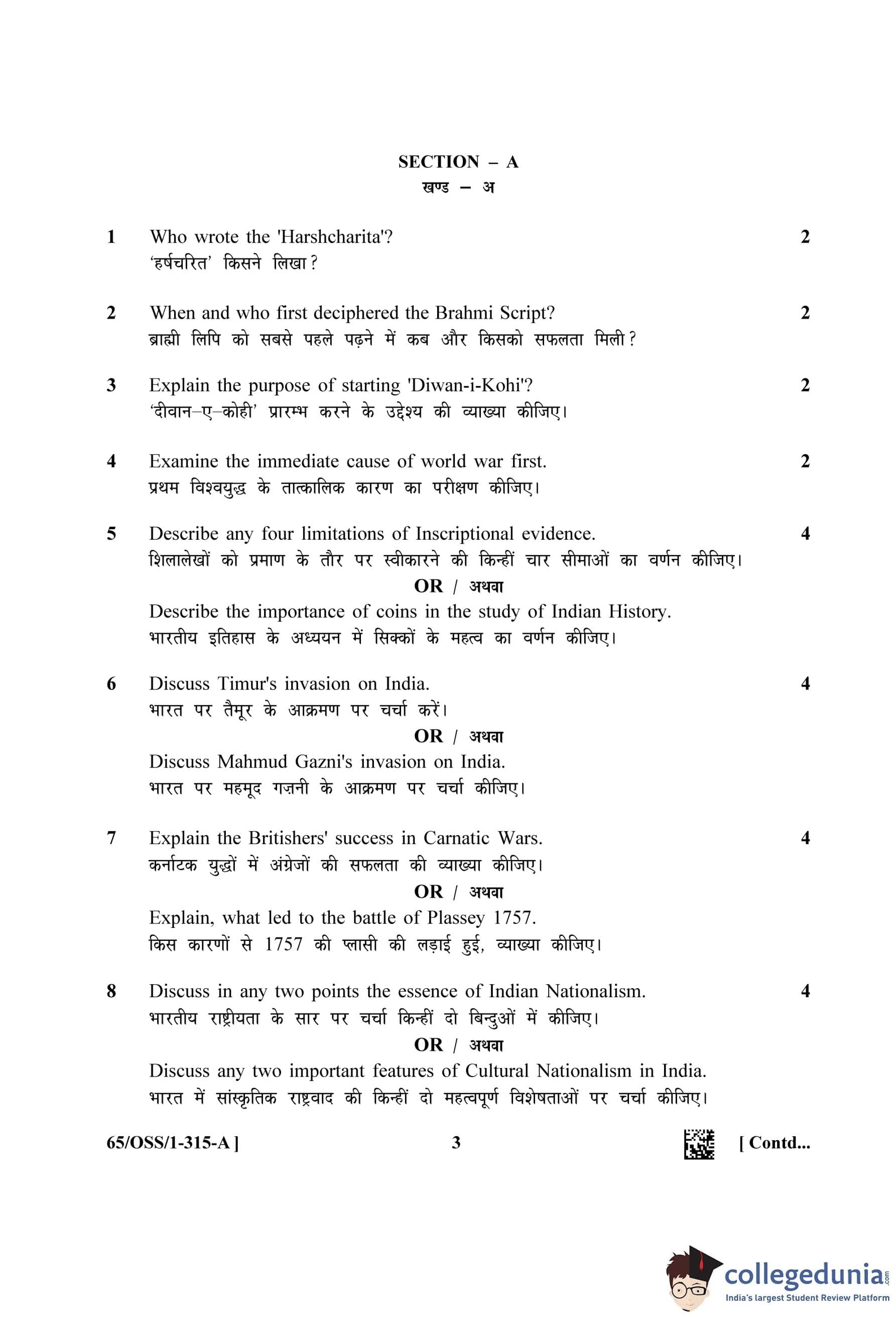 NIOS Class 12 History (Set A - OSS) Question Paper 2023 with Answer Key