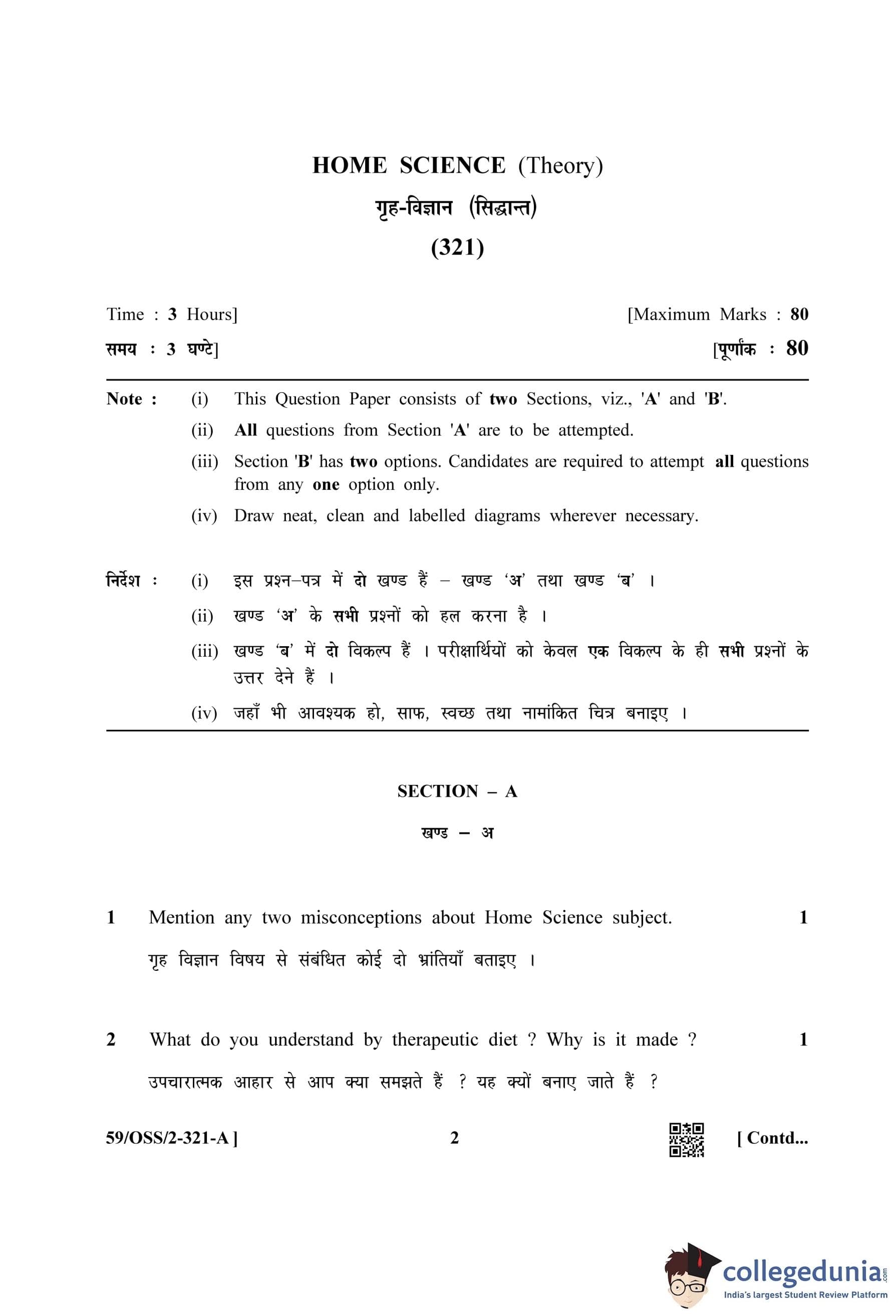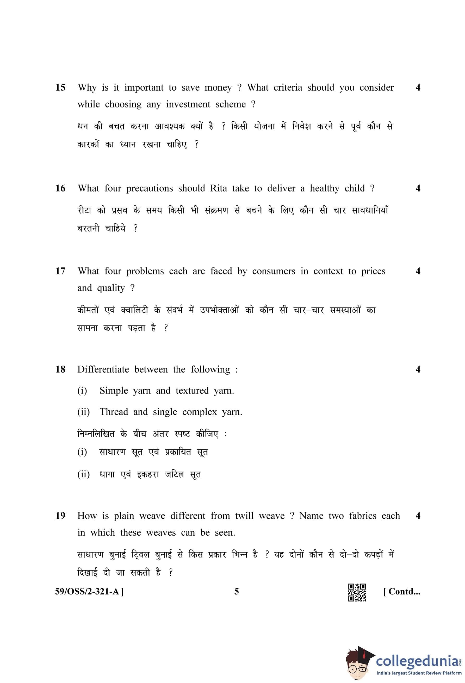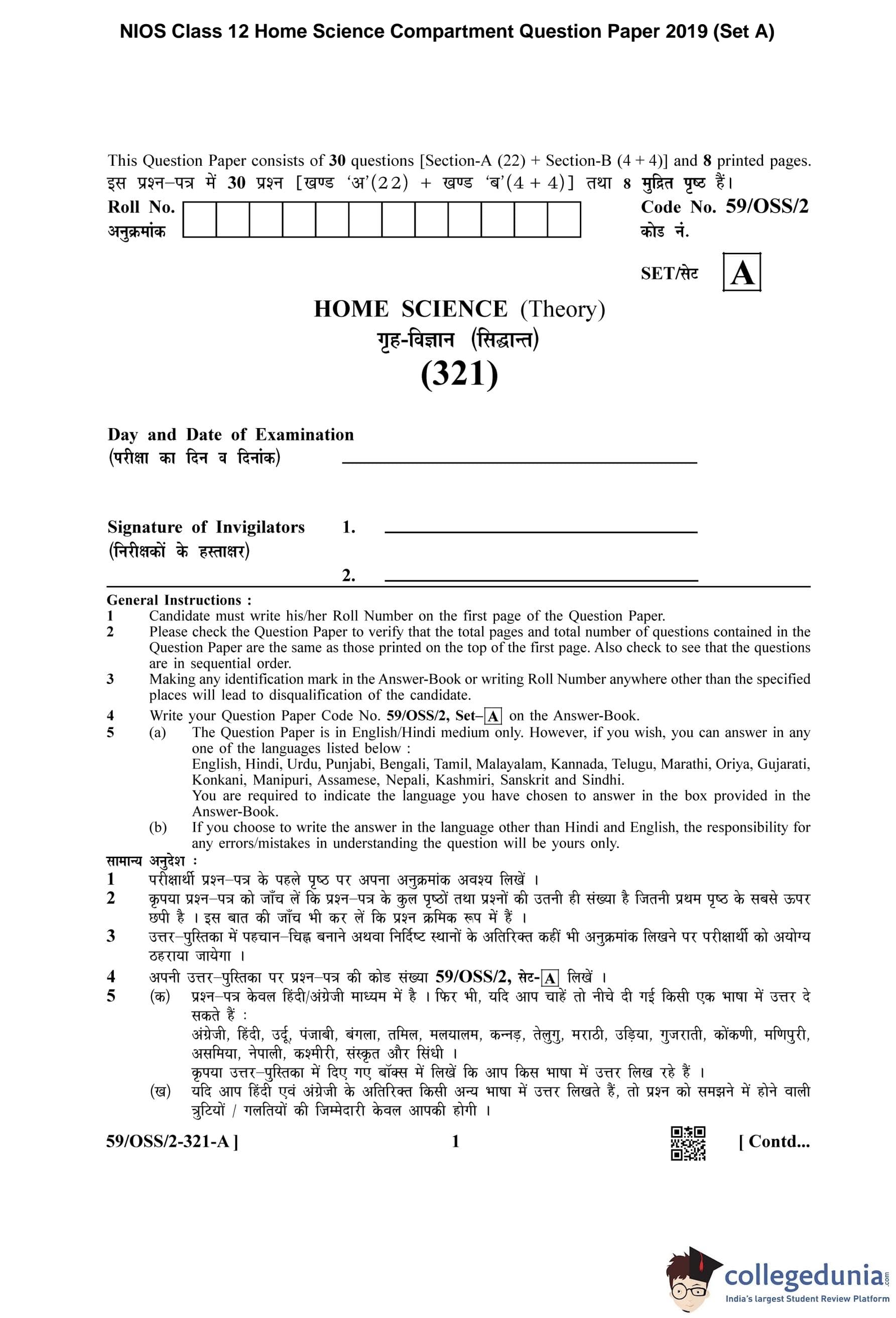 NIOS Class 12 Home Science (Set A) Compartment Question Paper 2019 with Answer Key