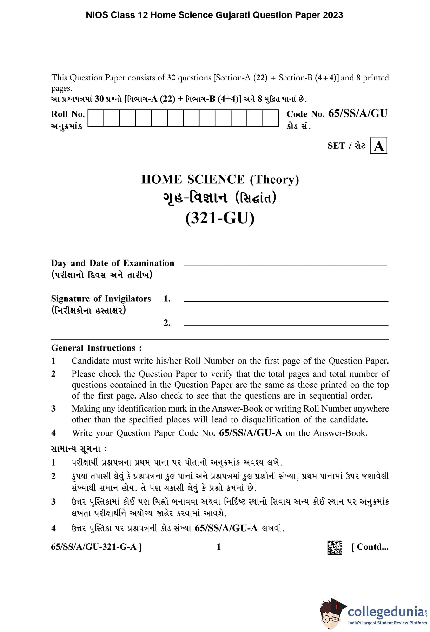 NIOS Class 12 Home Science Gujarati Question Paper 2023 with Answer Key pdf (Set A) is available for download here. The exam was conducted by National Institute of Open Schooling on April 17, 2023 in the Afternoon Session 2.30 PM to 5.30 PM. The question paper comprised a total of 30 questions divided among 2 sections.