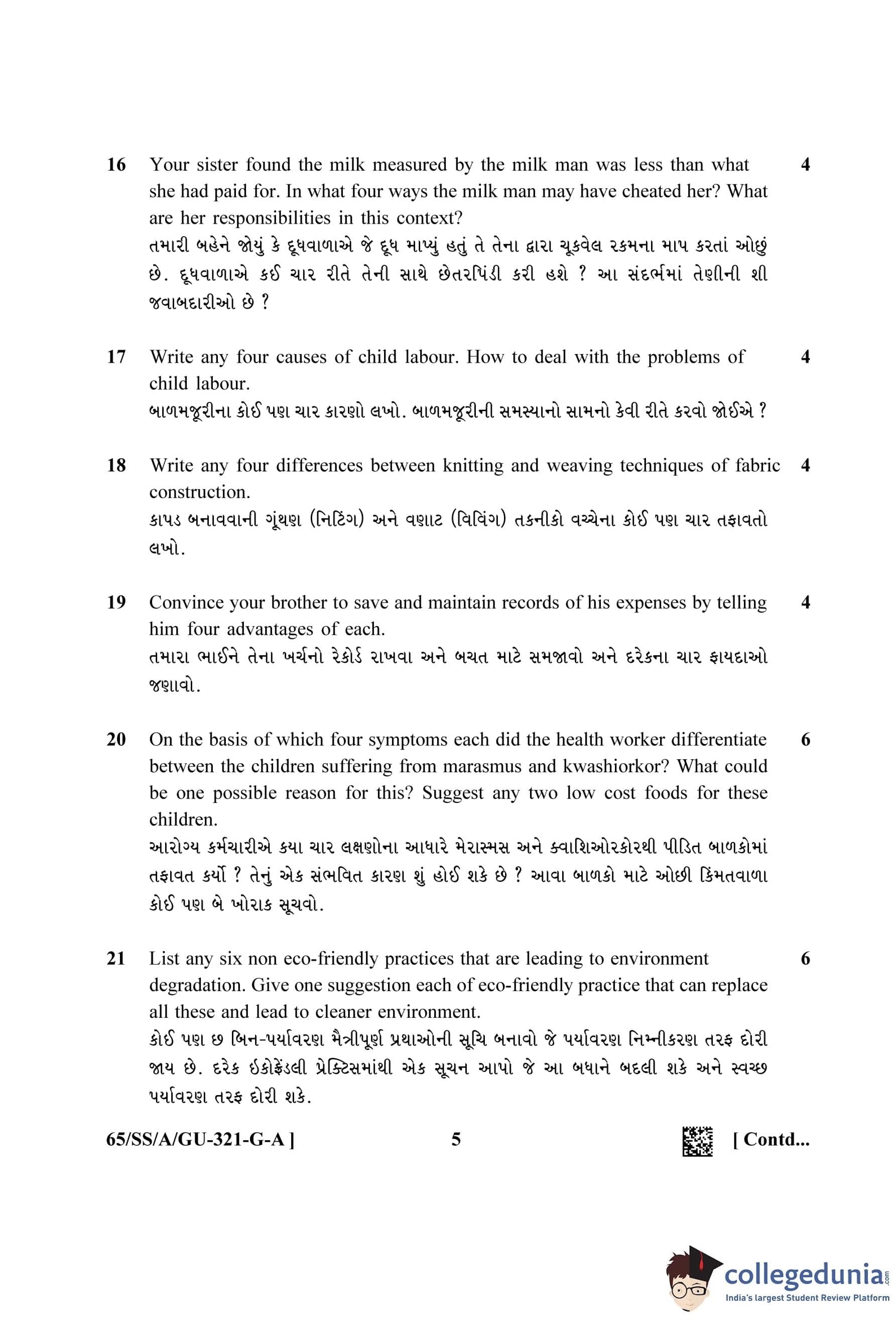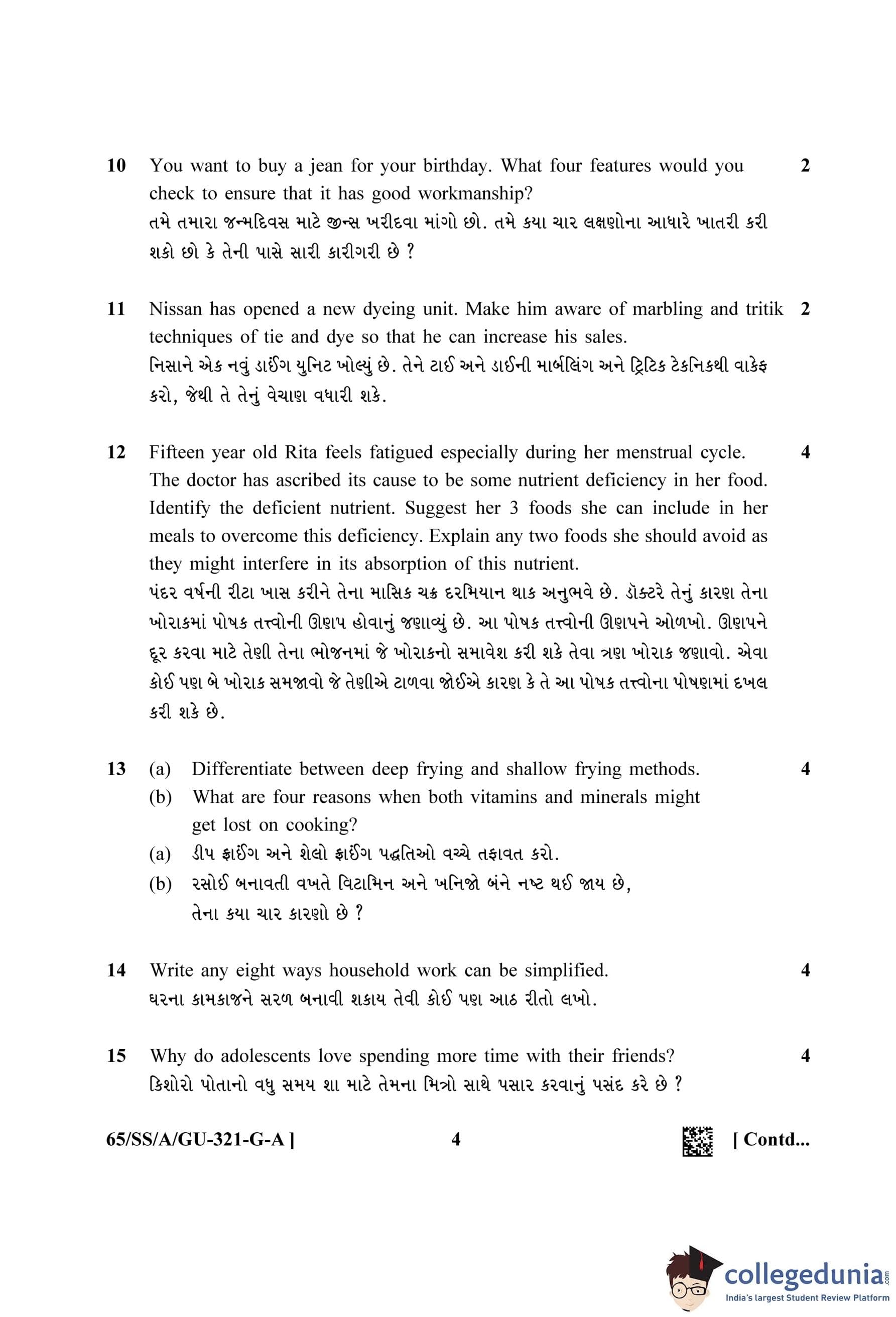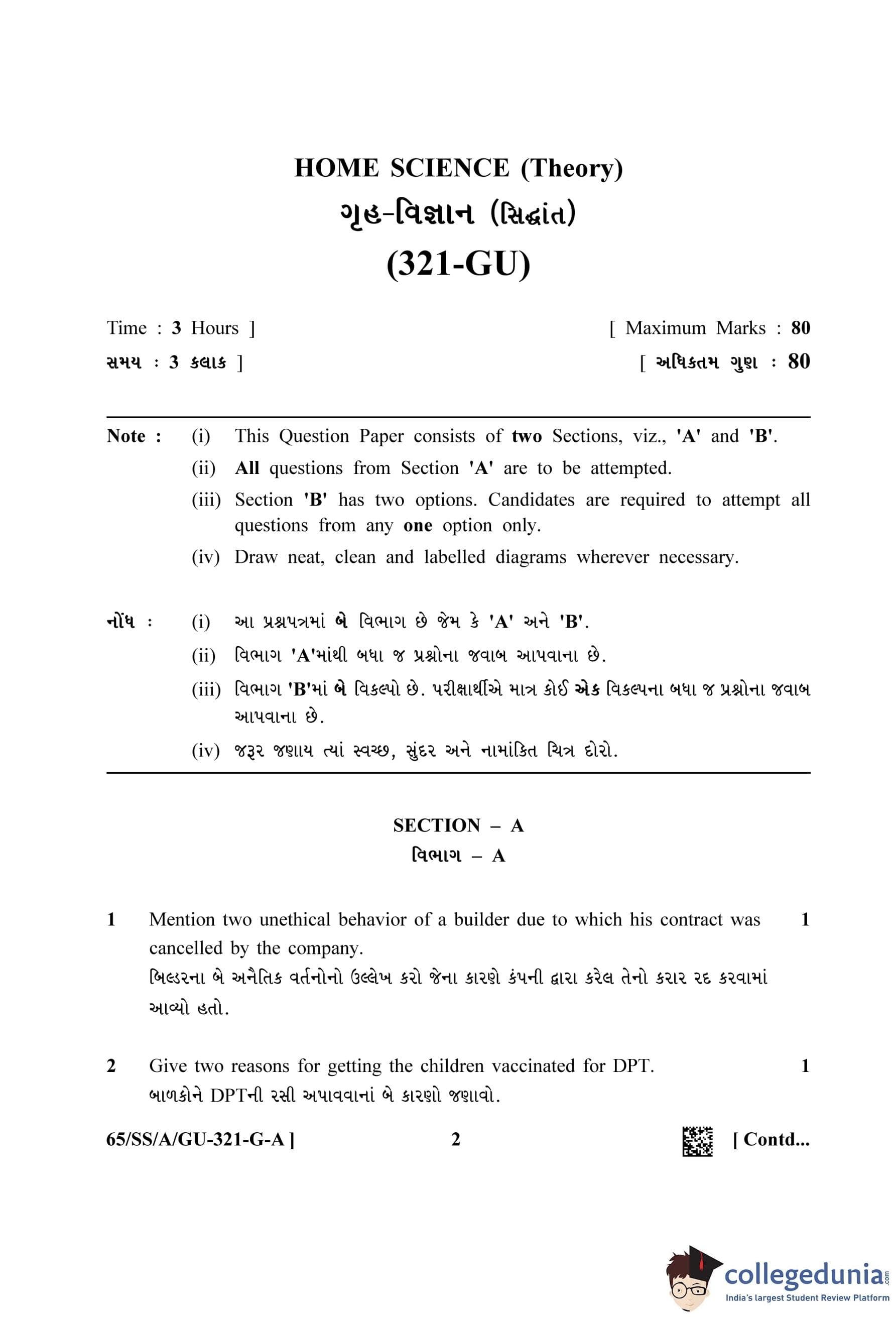NIOS Class 12 Home Science Gujarati (Set A) Question Paper 2023 with Answer Key