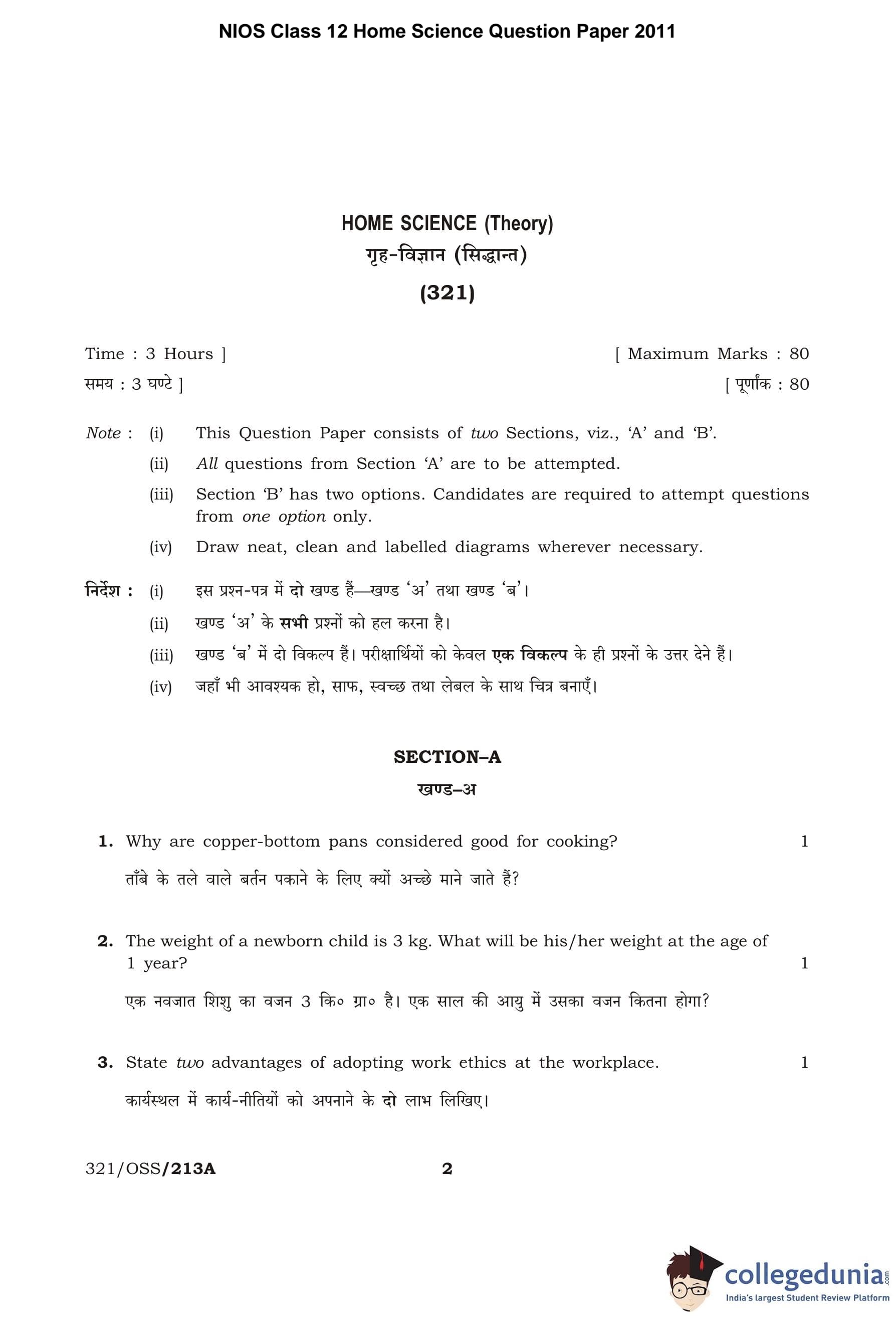 NIOS Class 12 Home Science Question Paper 2011 with Answer Key pdf is available for download here. The exam was conducted by National Institute of Open Schooling. The question paper comprised a total of 26 questions divided among 2 sections.