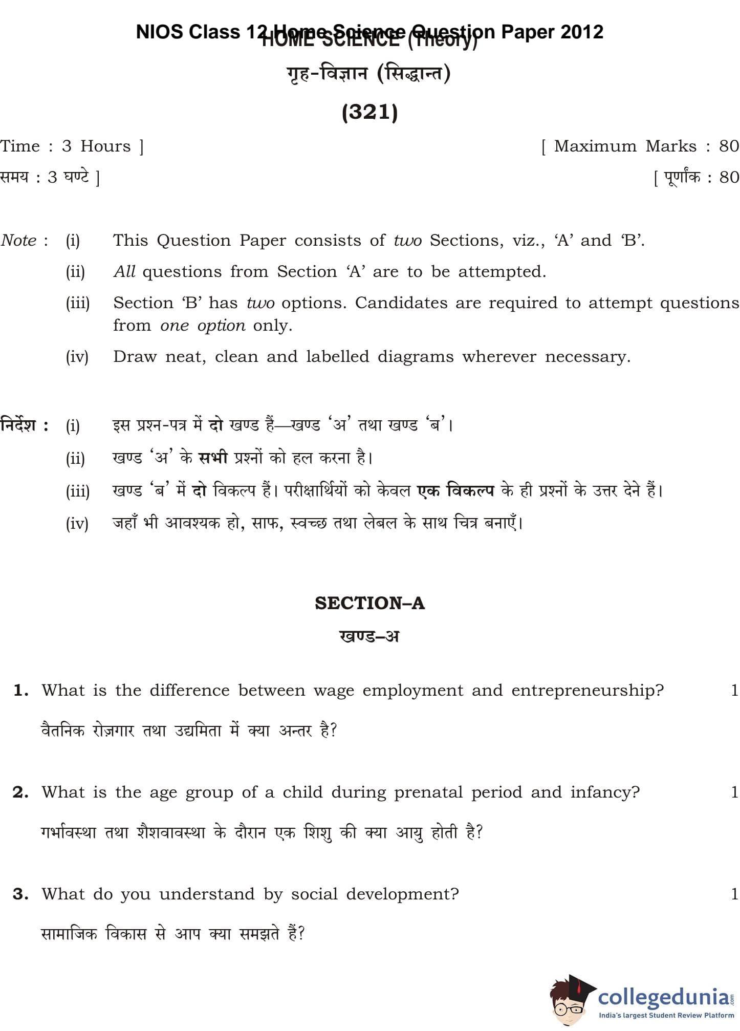 NIOS Class 12 Home Science Question Paper 2012 with Answer Key pdf is available for download here. The exam was conducted by National Institute of Open Schooling. The question paper comprised a total of 26 questions divided among 2 sections.