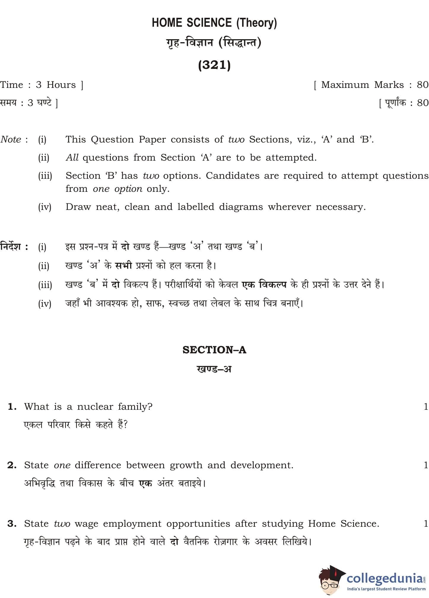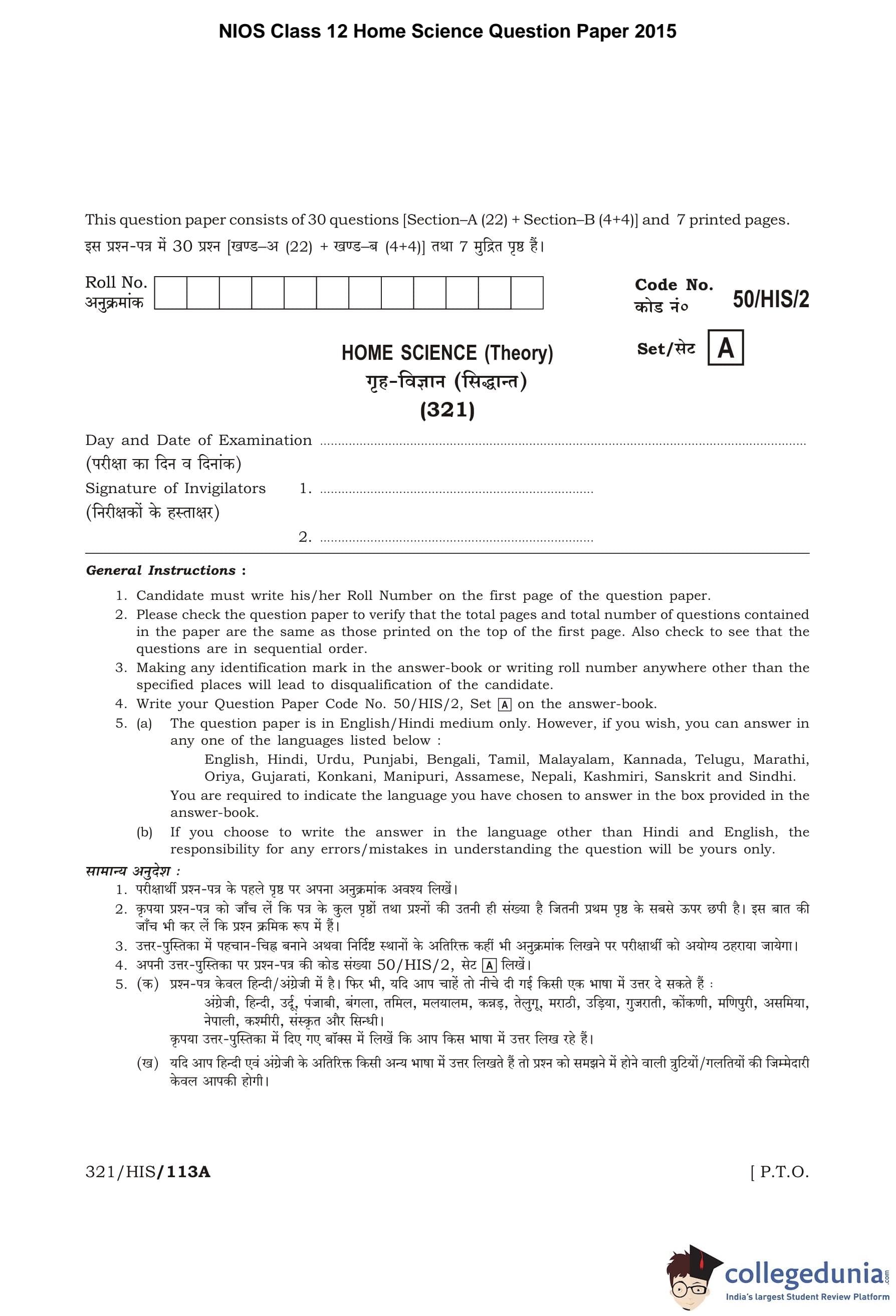 NIOS Class 12 Home Science Question Paper 2015 with Answer Key pdf is available for download here. The exam was conducted by National Institute of Open Schooling on April 11, 2015 in the Afternoon Session 2:30 PM to 5:30 PM. The question paper comprised a total of 26 questions divided among 2 sections.