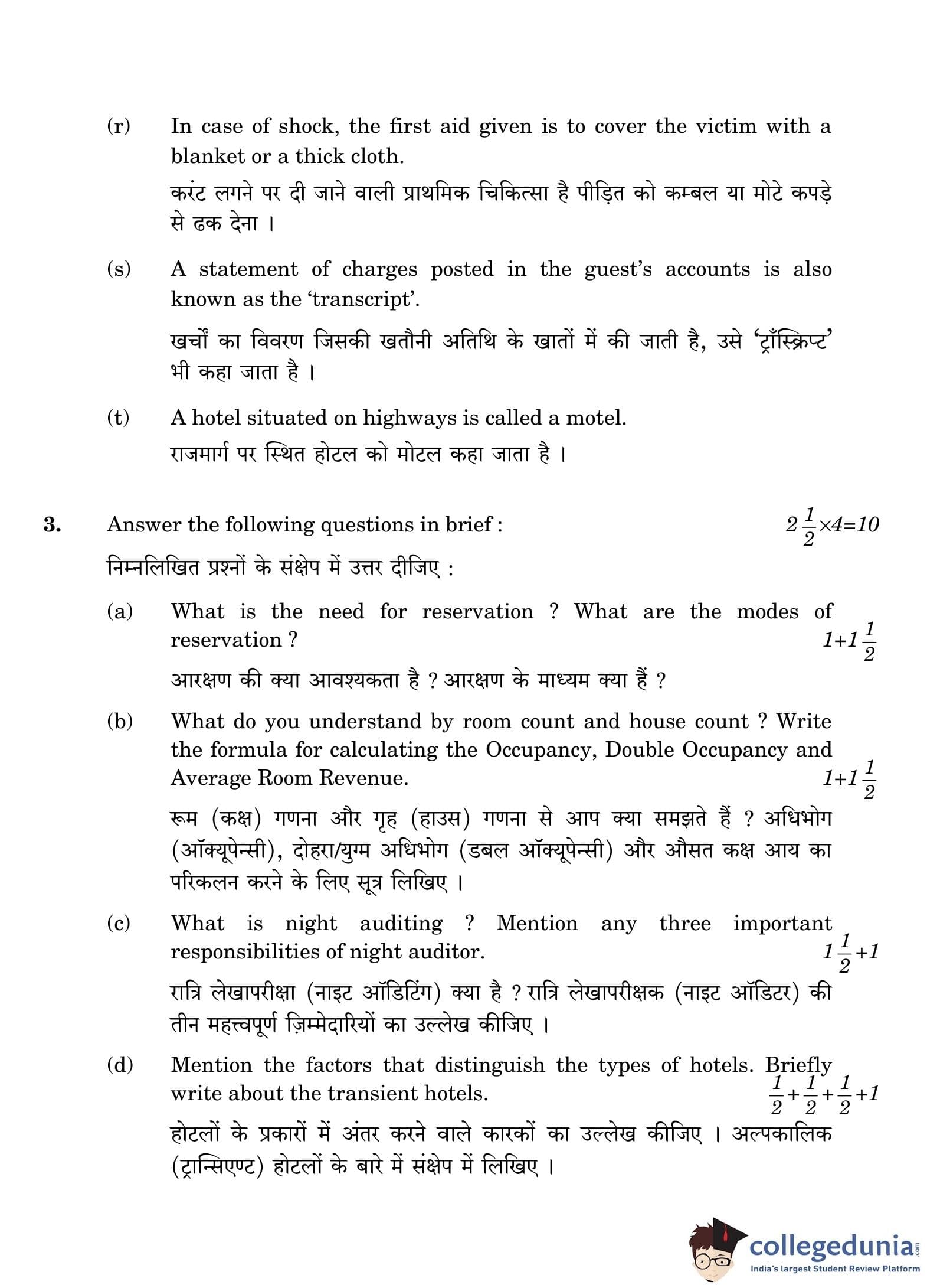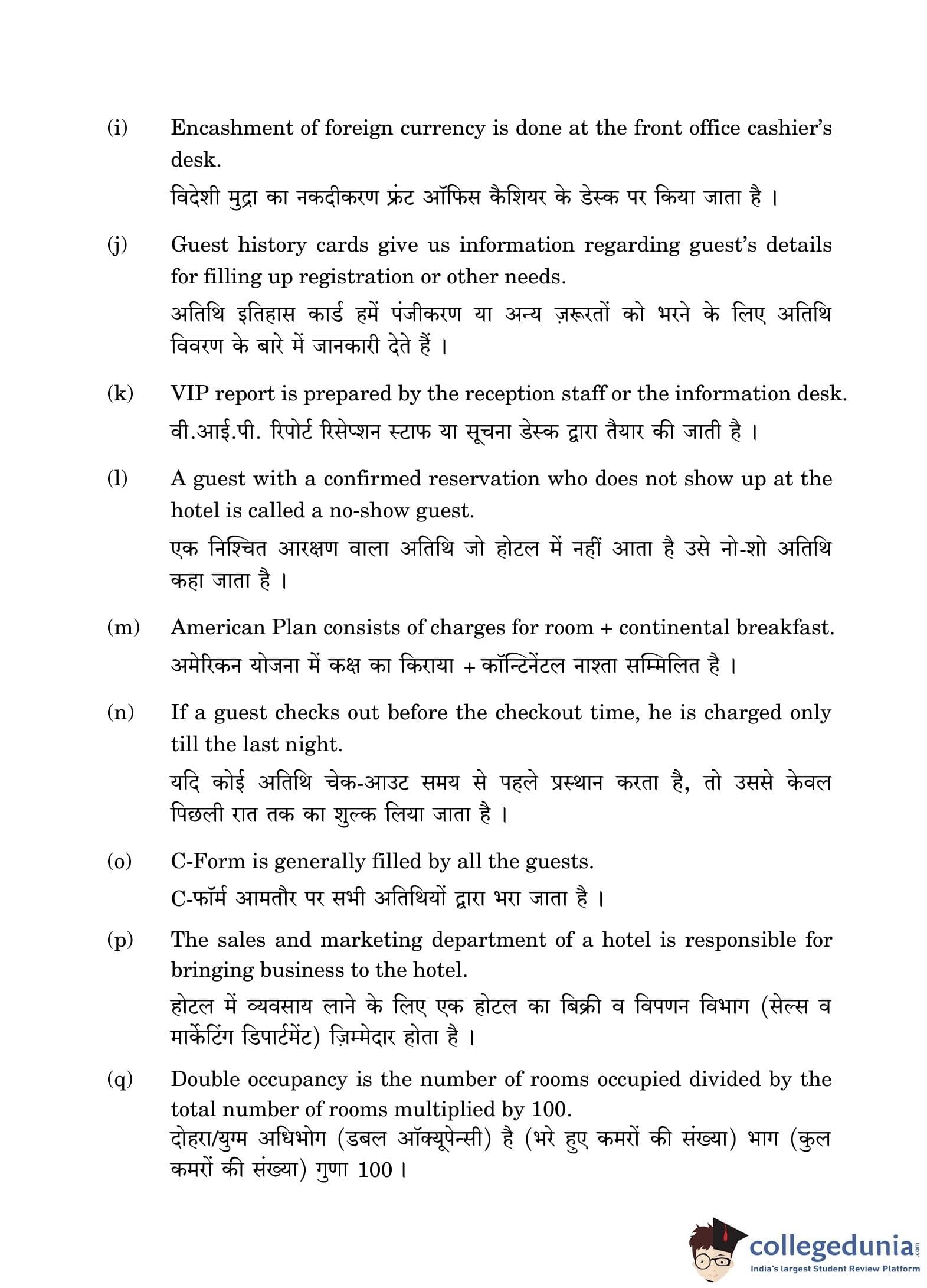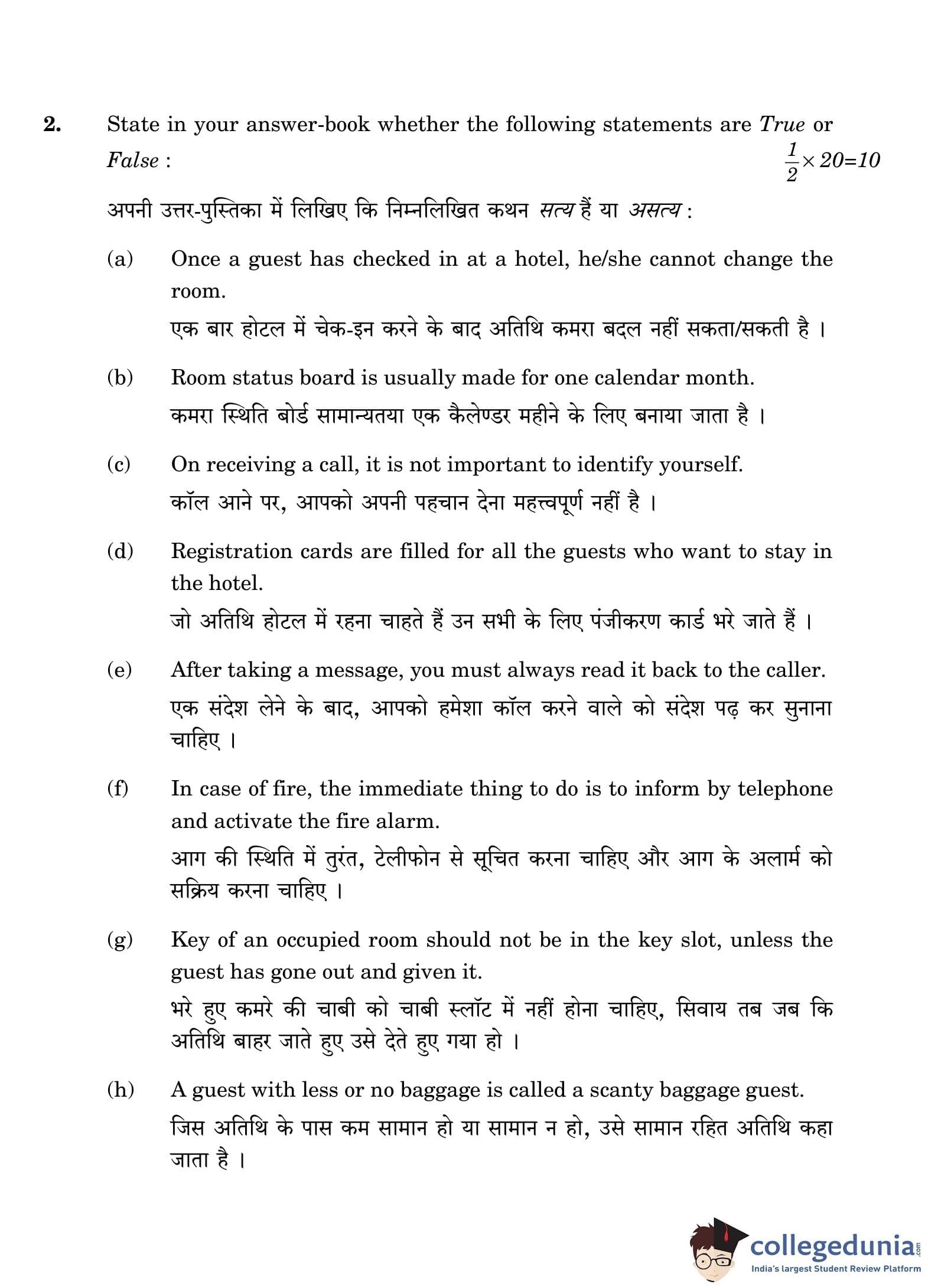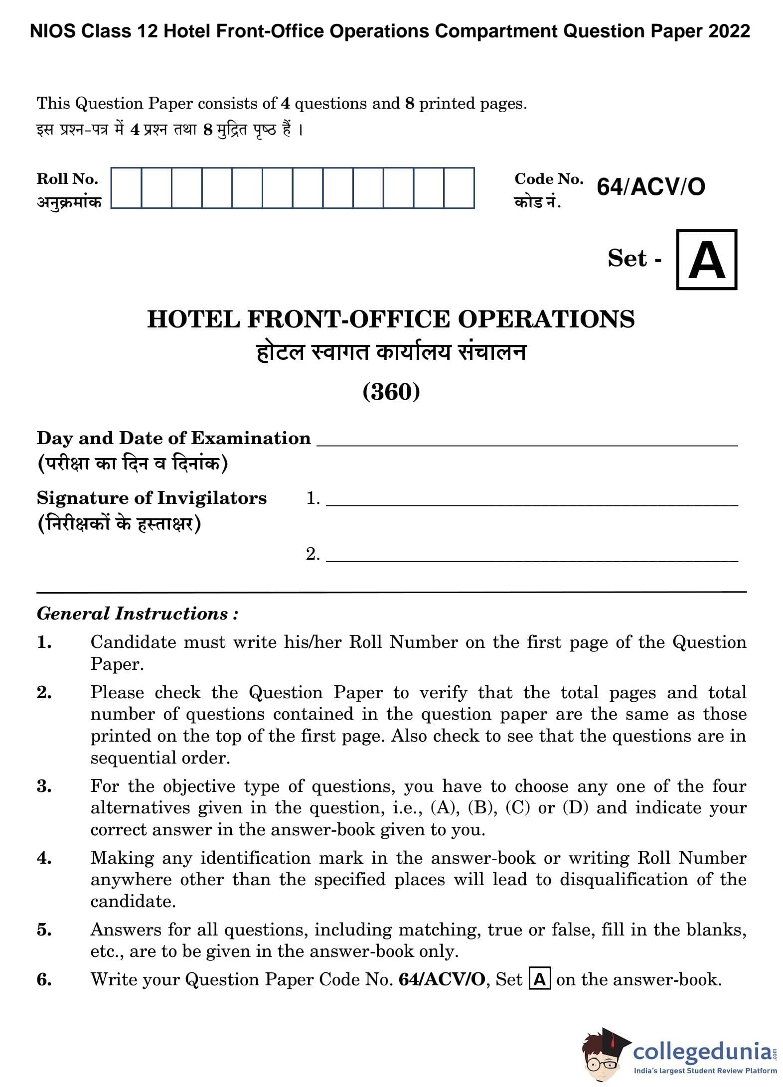 NIOS Class 12 Hotel Front-Office Operations Compartment Question Paper 2022 with Answer Key