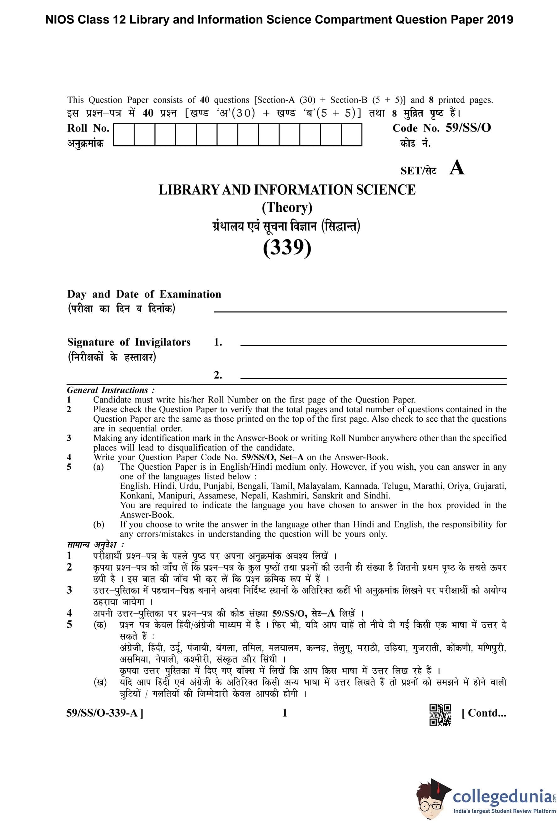 | NIOS Class 12 Library and Information Science Question Paper 2019 PDF | NIOS Class 12 Library and Information Science Answer Key 2019 PDF |