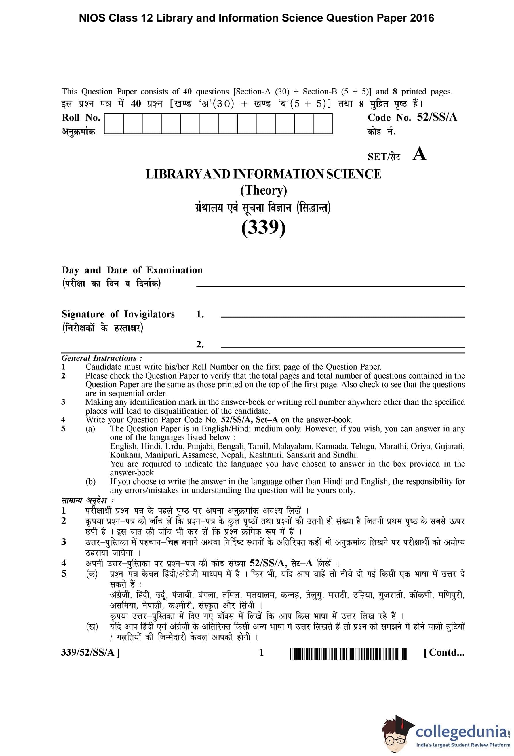 NIOS Class 12 Library and Information Science Question Paper 2016 with Answer Key pdf is available for download here. The exam was conducted by National Institute of Open Schooling on May 5, 2016 in the Afternoon Session 2;30 PM to 5:30 PM. The question paper comprised a total of 35 questions divided among 2 sections.