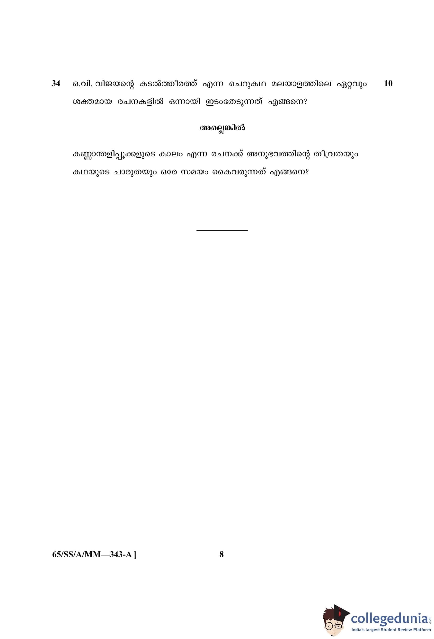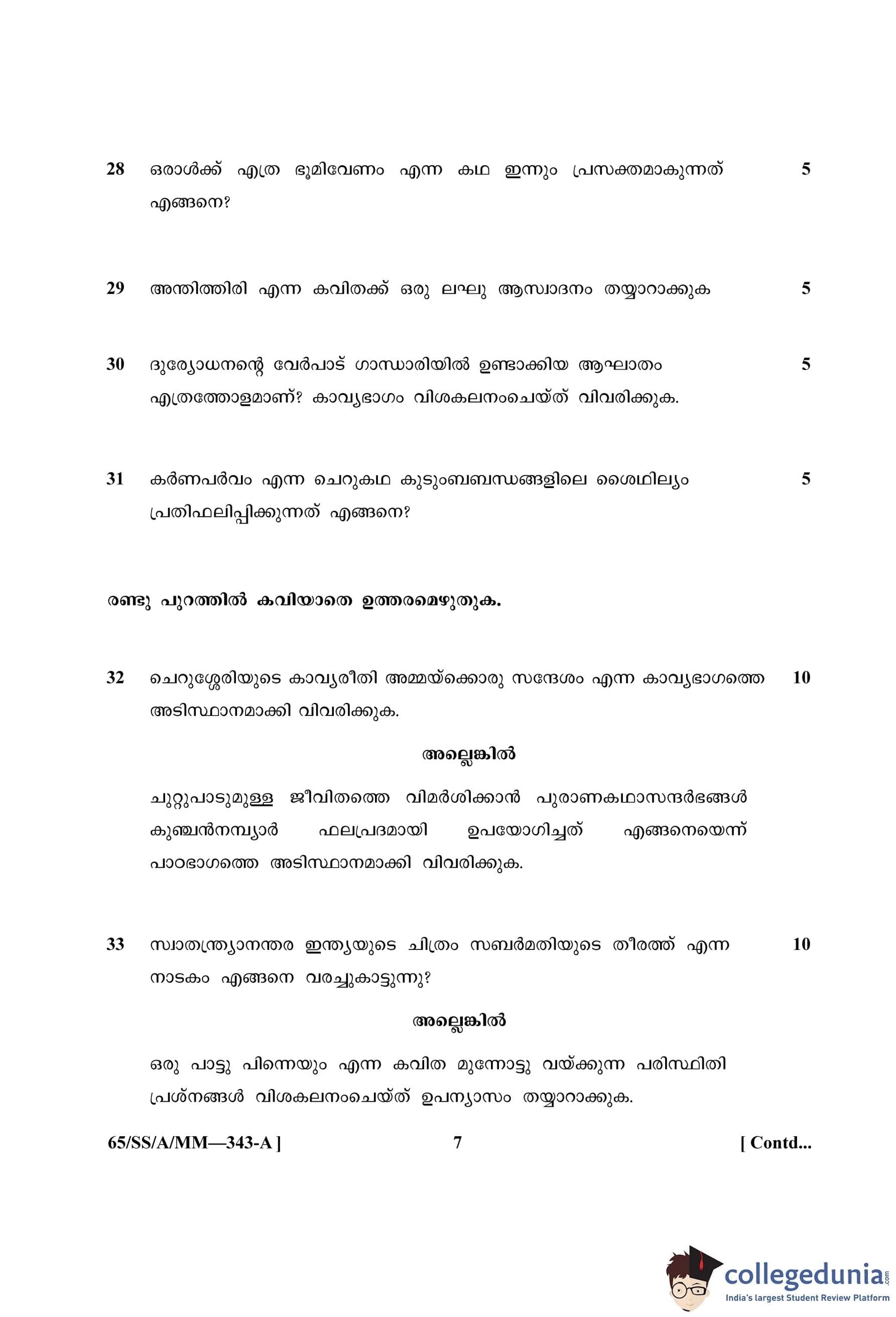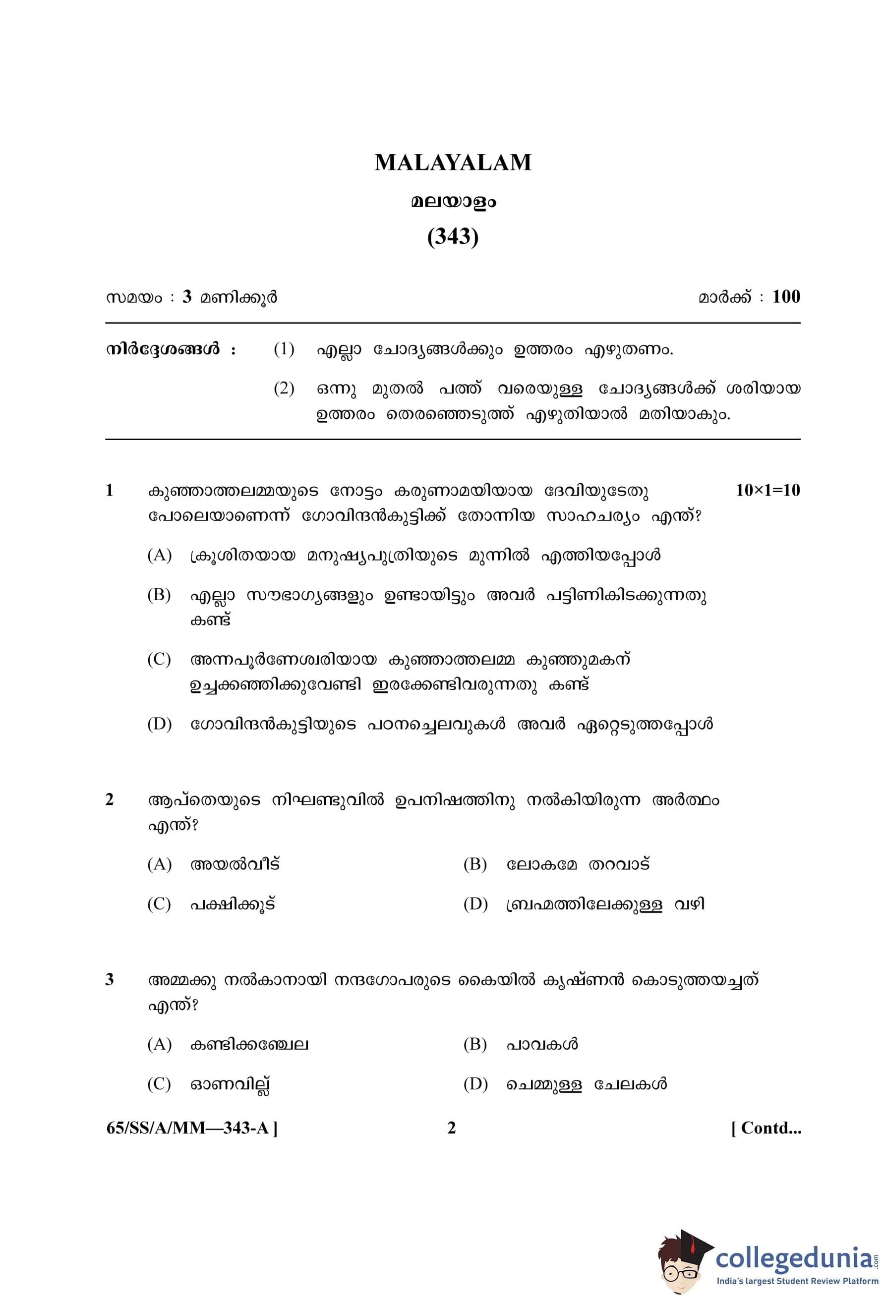 NIOS Class 12 Malayalam (Set A) Question Paper 2023 with Answer Key