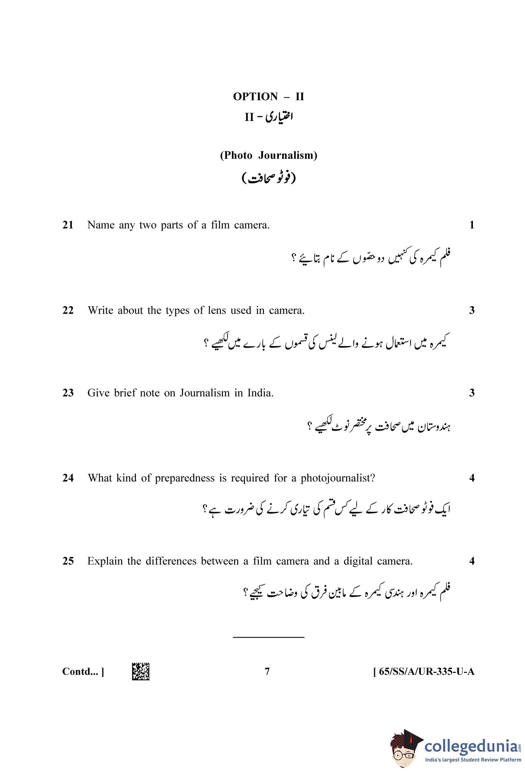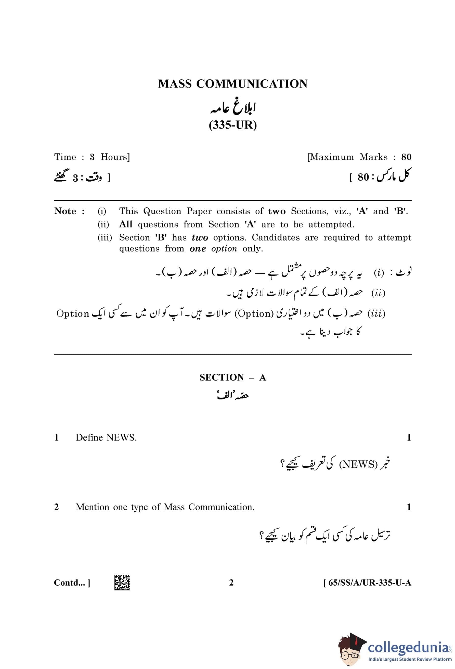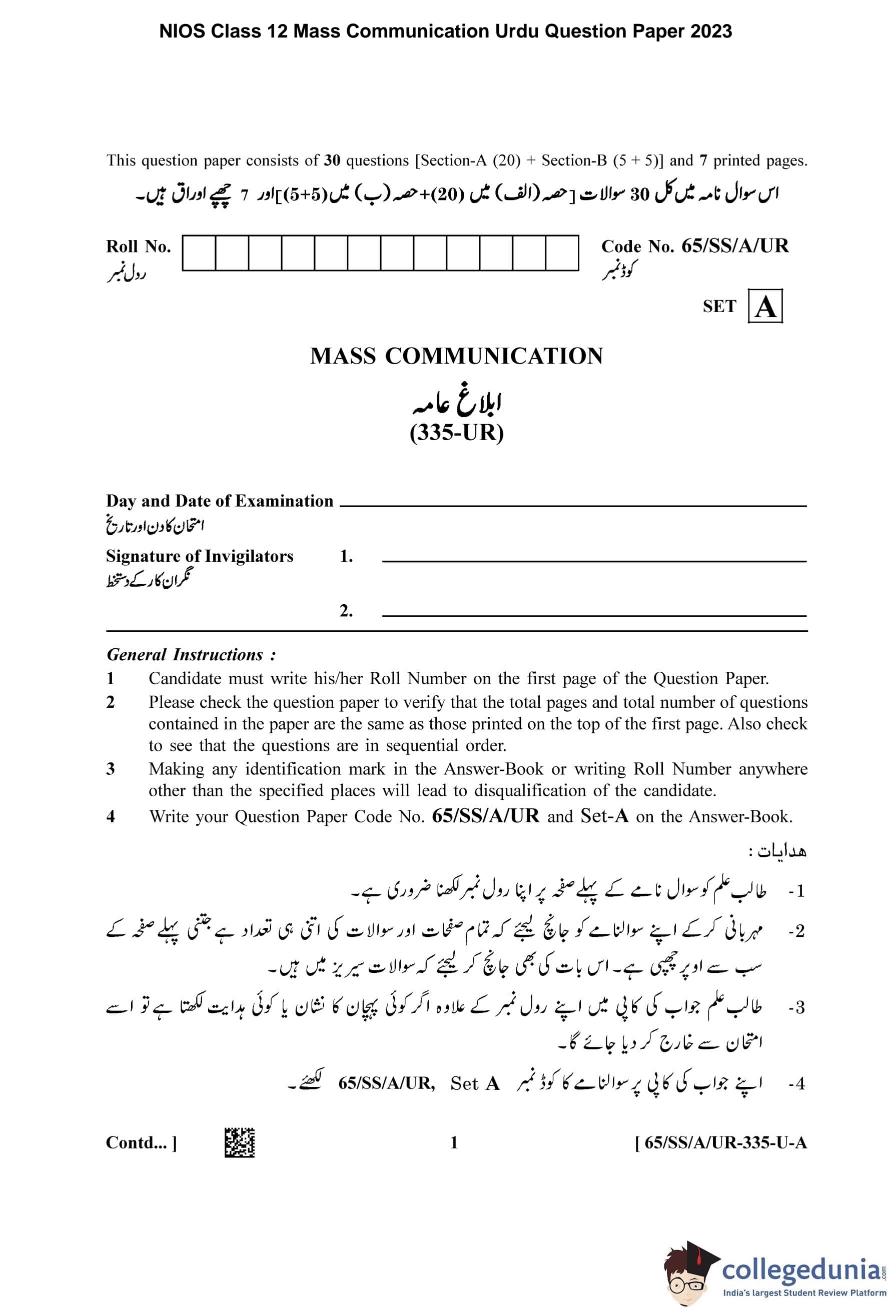 NIOS Class 12 Mass Communication Urdu Question Paper 2023 with Answer Key pdf (Set A) is available for download here. The exam was conducted by National Institute of Open Schooling on April 19, 2023 in the Afternoon Session 2.30 PM to 5.30 PM. The question paper comprised a total of 30 questions divided among 2 sections.