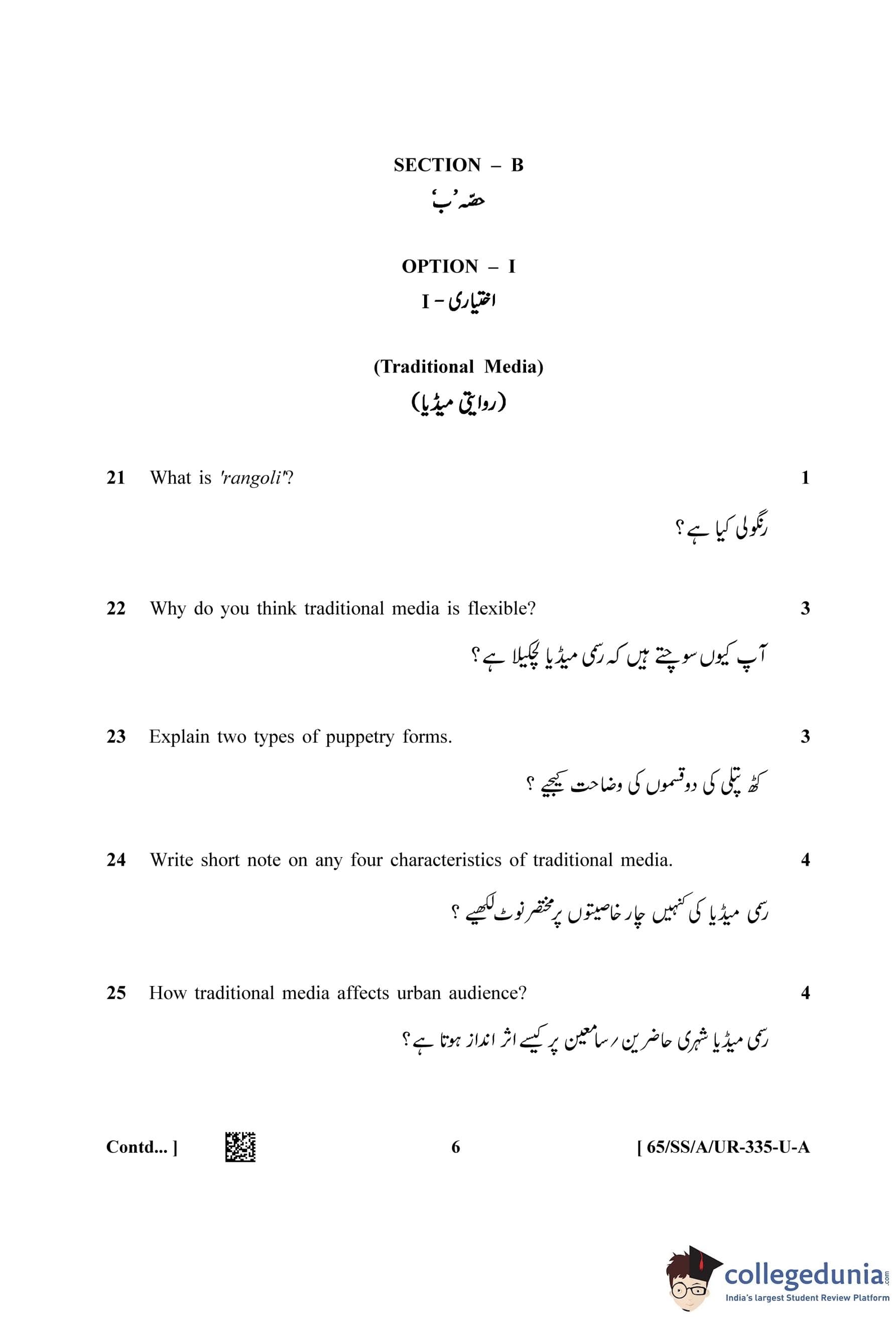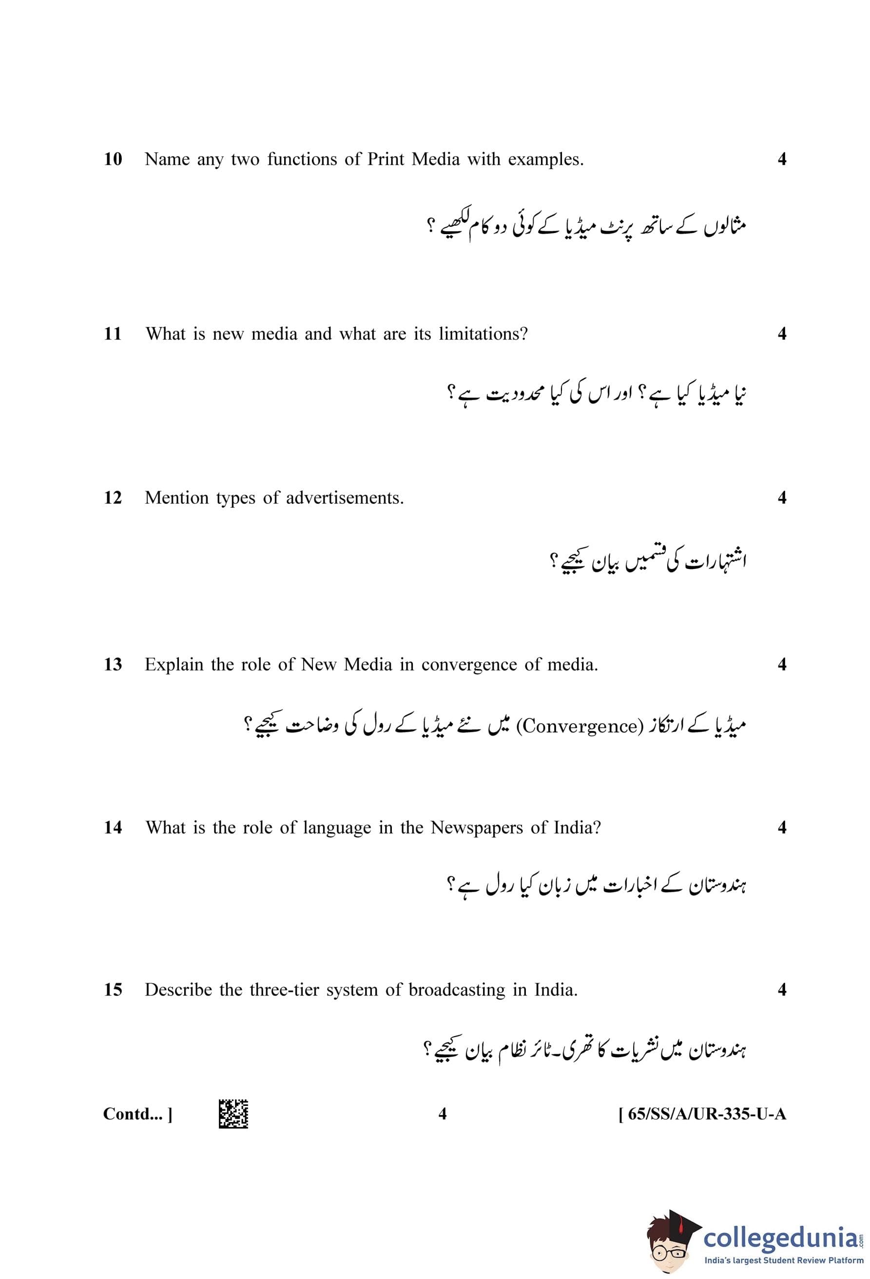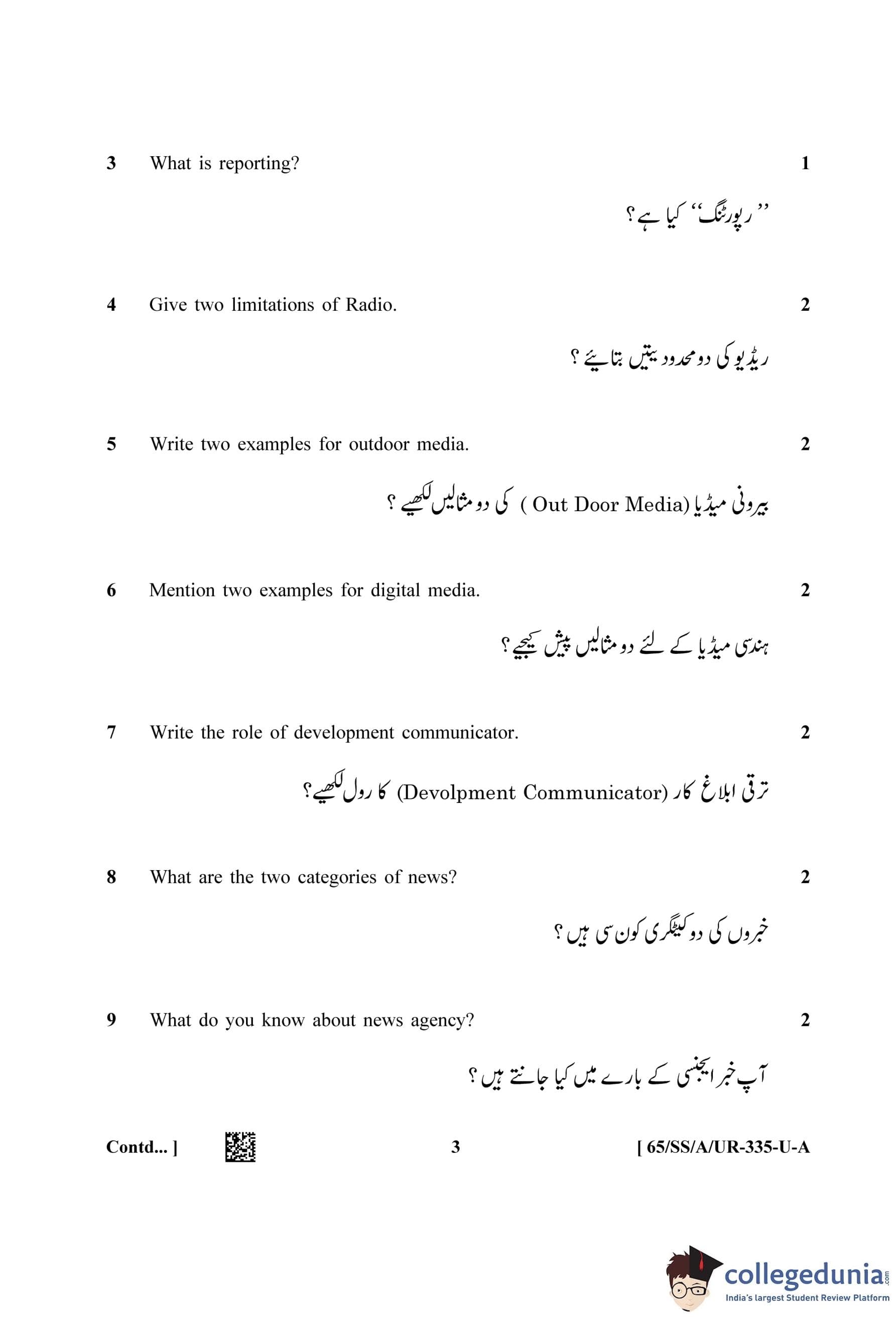 NIOS Class 12 Mass Communication Urdu (Set A) Question Paper 2023 with Answer Key