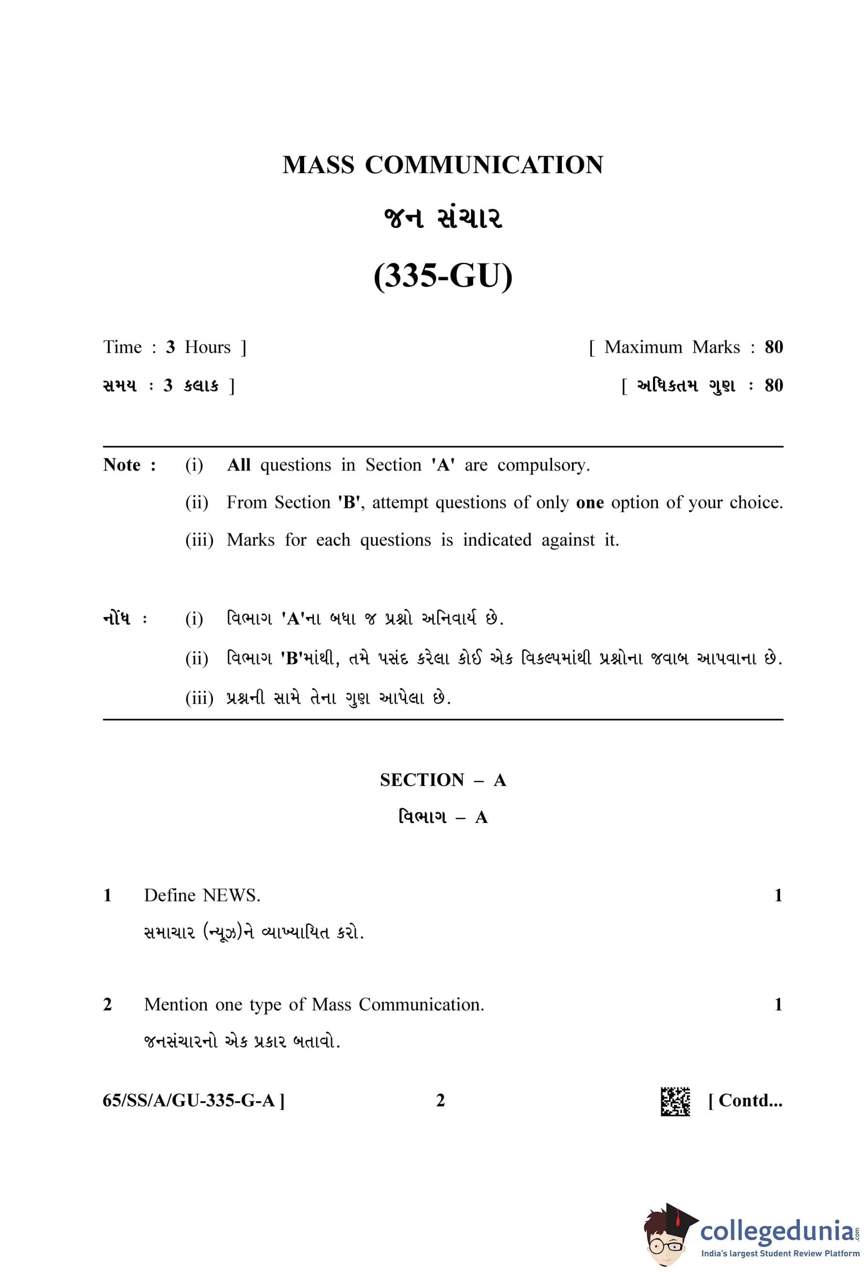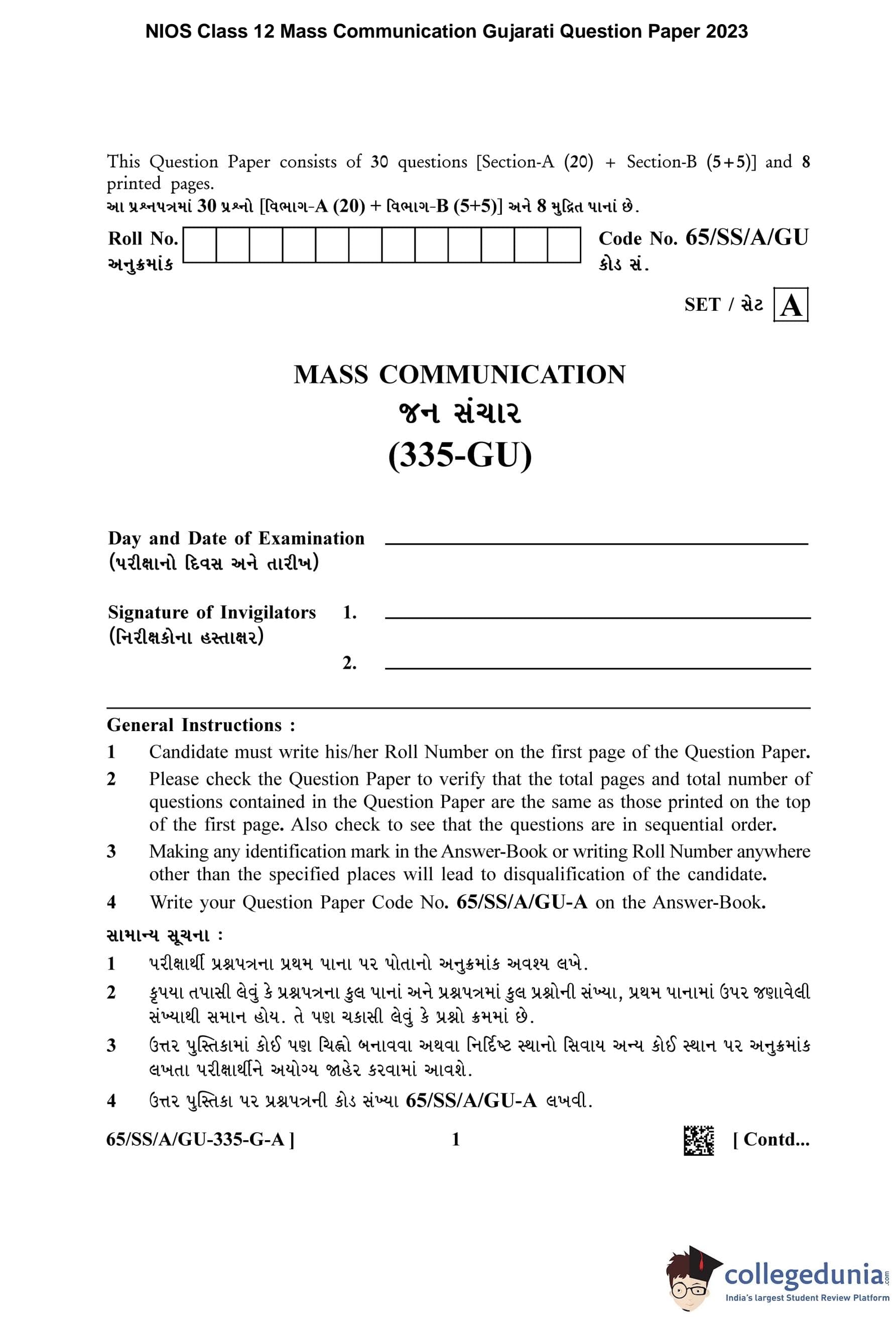 NIOS Class 12 Mass Communication Gujarati Question Paper 2023 with Answer Key pdf (Set A) is available for download here. The exam was conducted by National Institute of Open Schooling on April 19, 2023 in the Afternoon Session 2.30 PM to 5.30 PM. The question paper comprised a total of 30 questions divided among 2 sections.