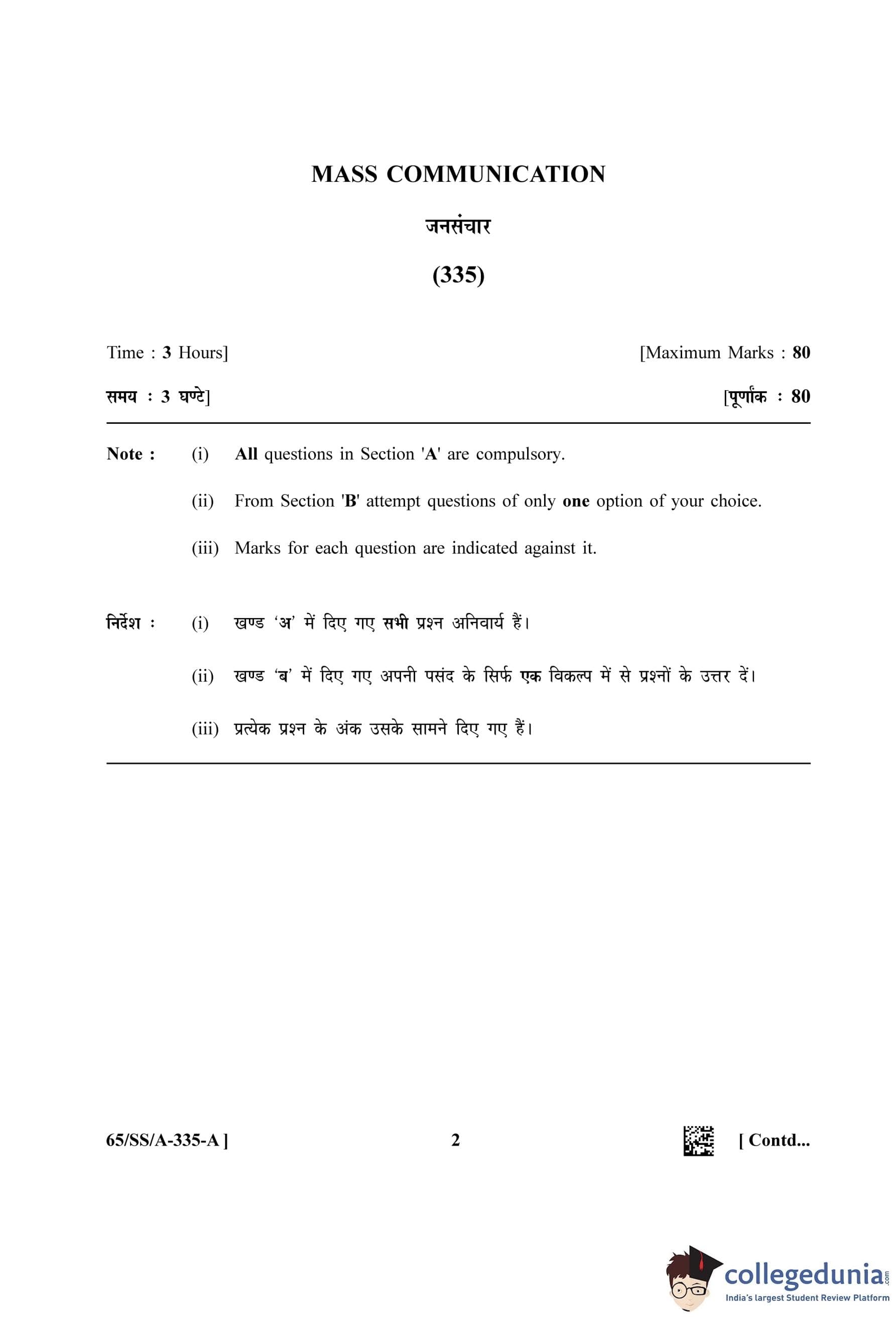 NIOS Class 12 Mass Communication Question Paper 2023 with Answer Key pdf (Set A - SS) is available for download here. The exam was conducted by National Institute of Open Schooling on April 19, 2023 in the Afternoon Session 2.30 PM to 5.30 PM. The question paper comprised a total of 30 questions divided among 2 sections.