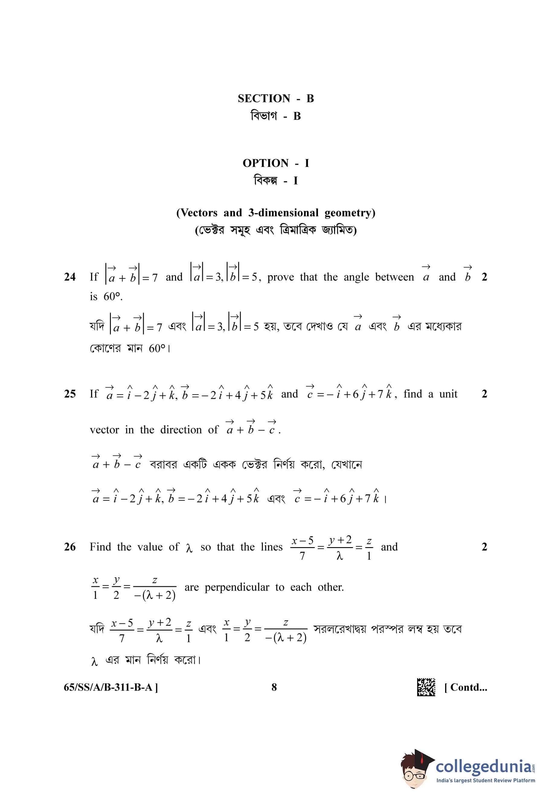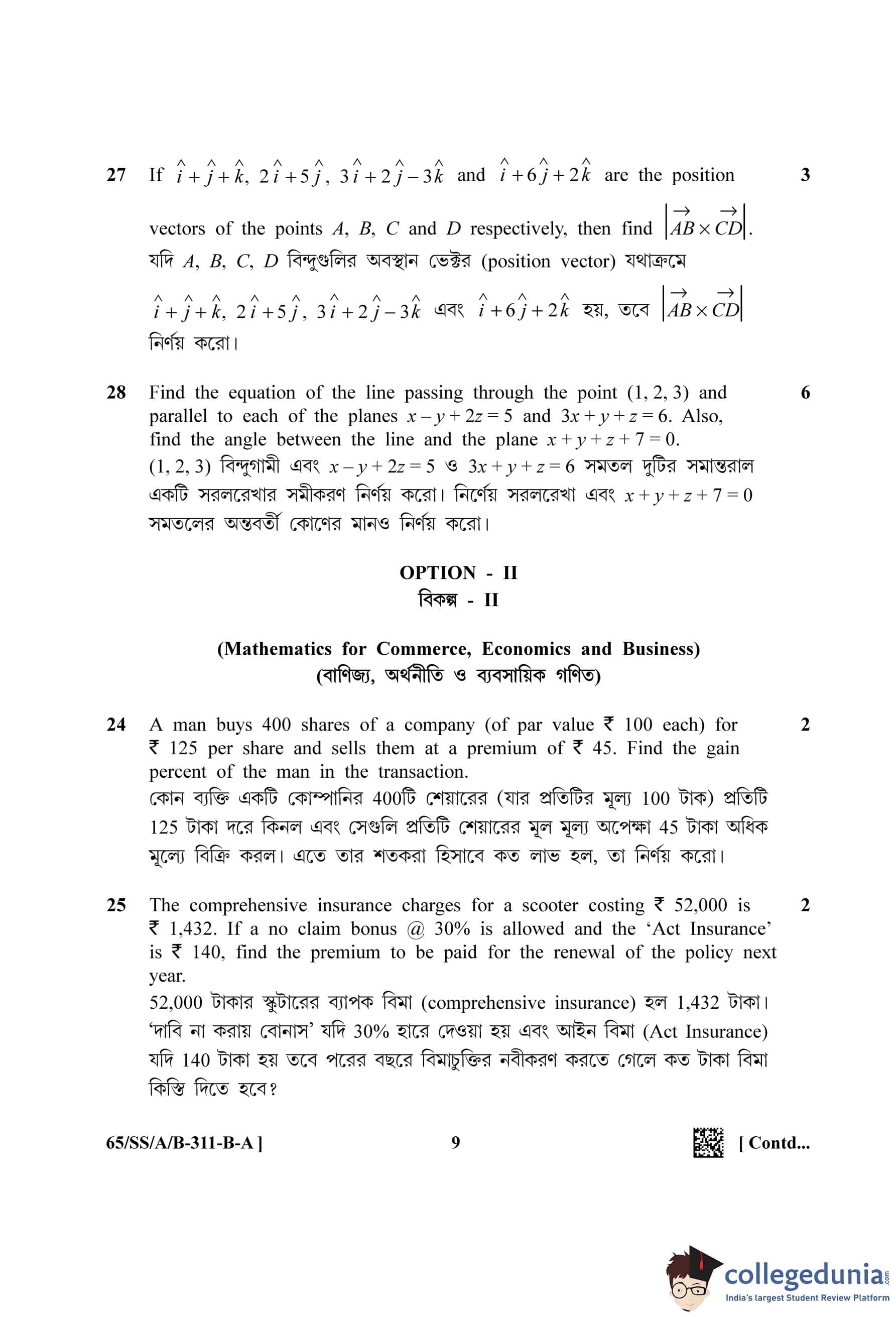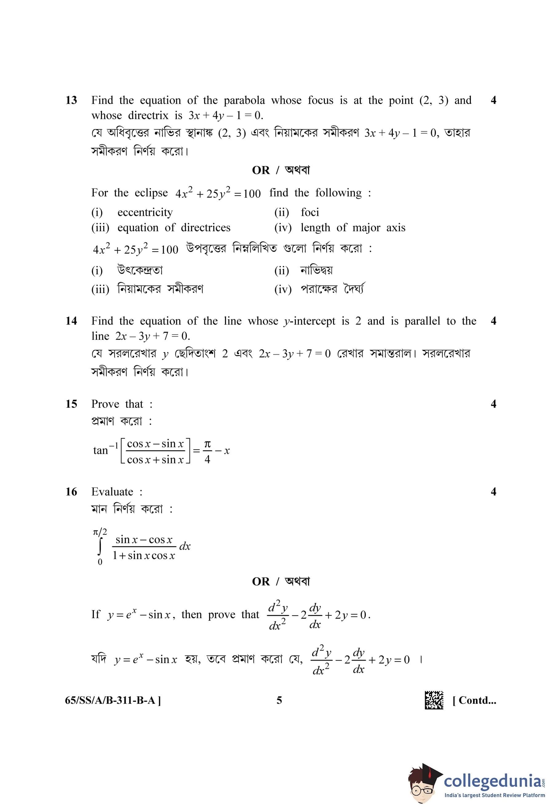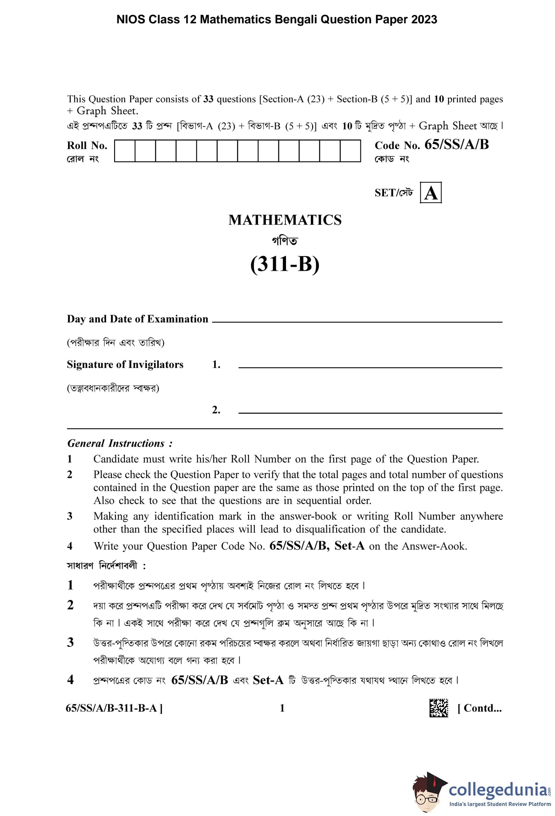 NIOS Class 12 Mathematics Bengali Question Paper 2023 with Answer Key pdf (Set A) is available for download here. The exam was conducted by National Institute of Open Schooling on May 2, 2023 in the Afternoon Session 2.30 PM to 5.30 PM. The question paper comprised a total of 33 questions divided among 2 sections.