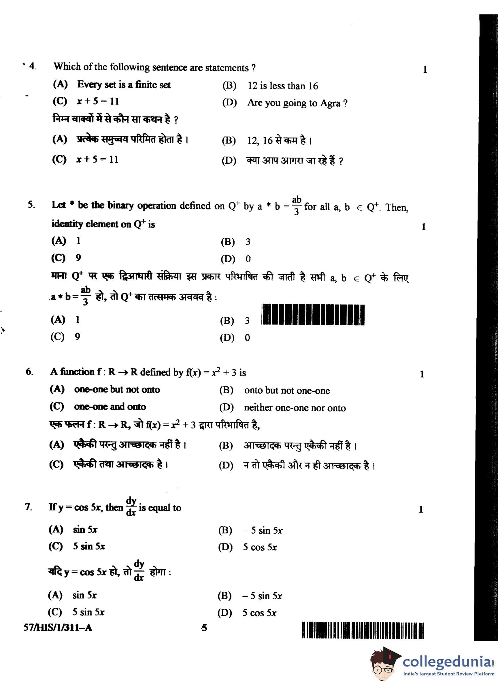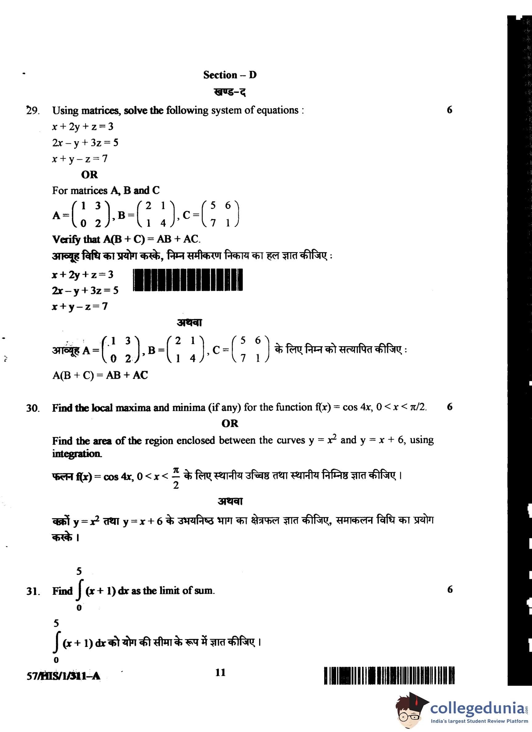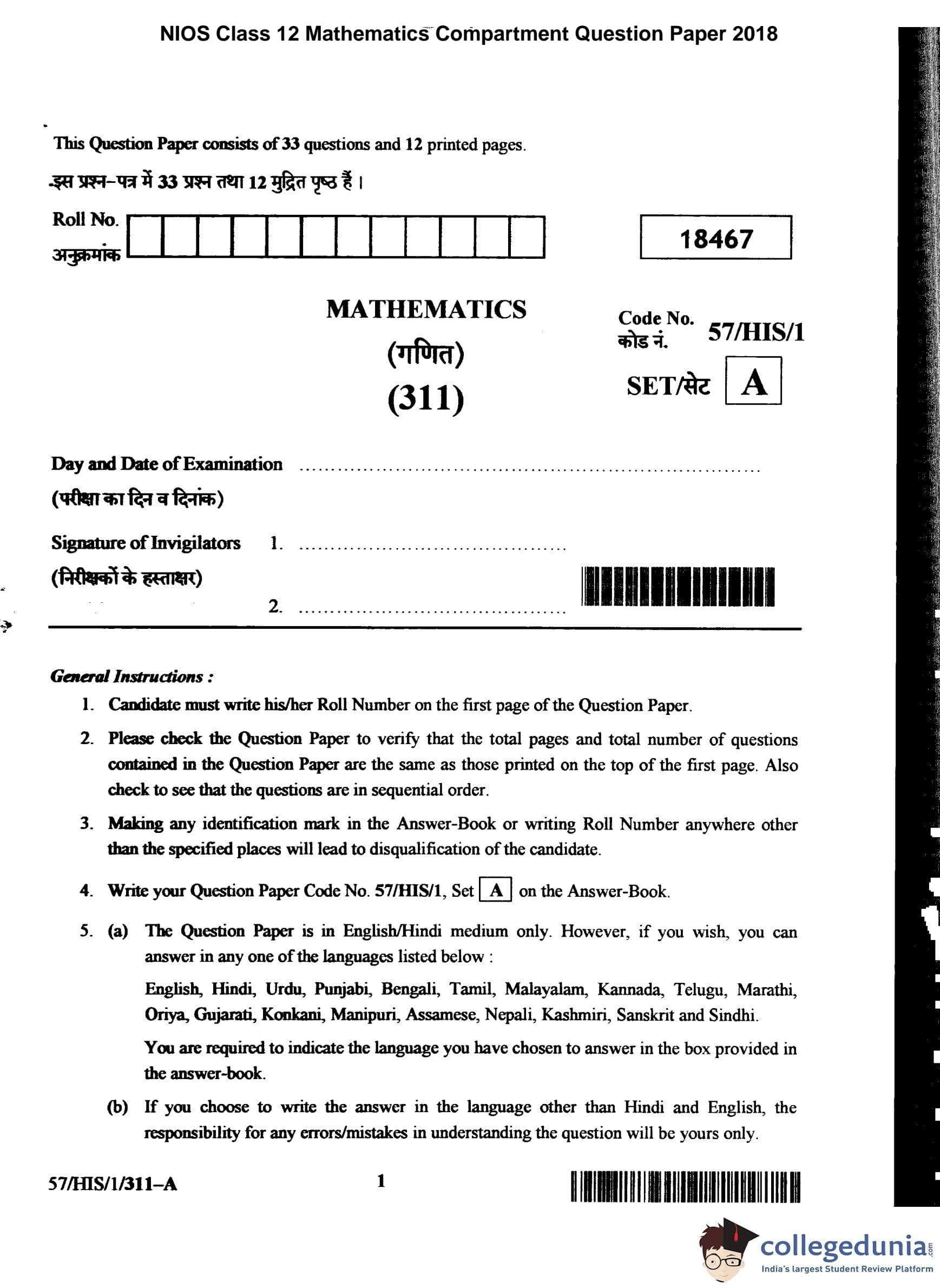 NIOS Class 12 Mathematics Compartment Question Paper 2018 with Answer Key