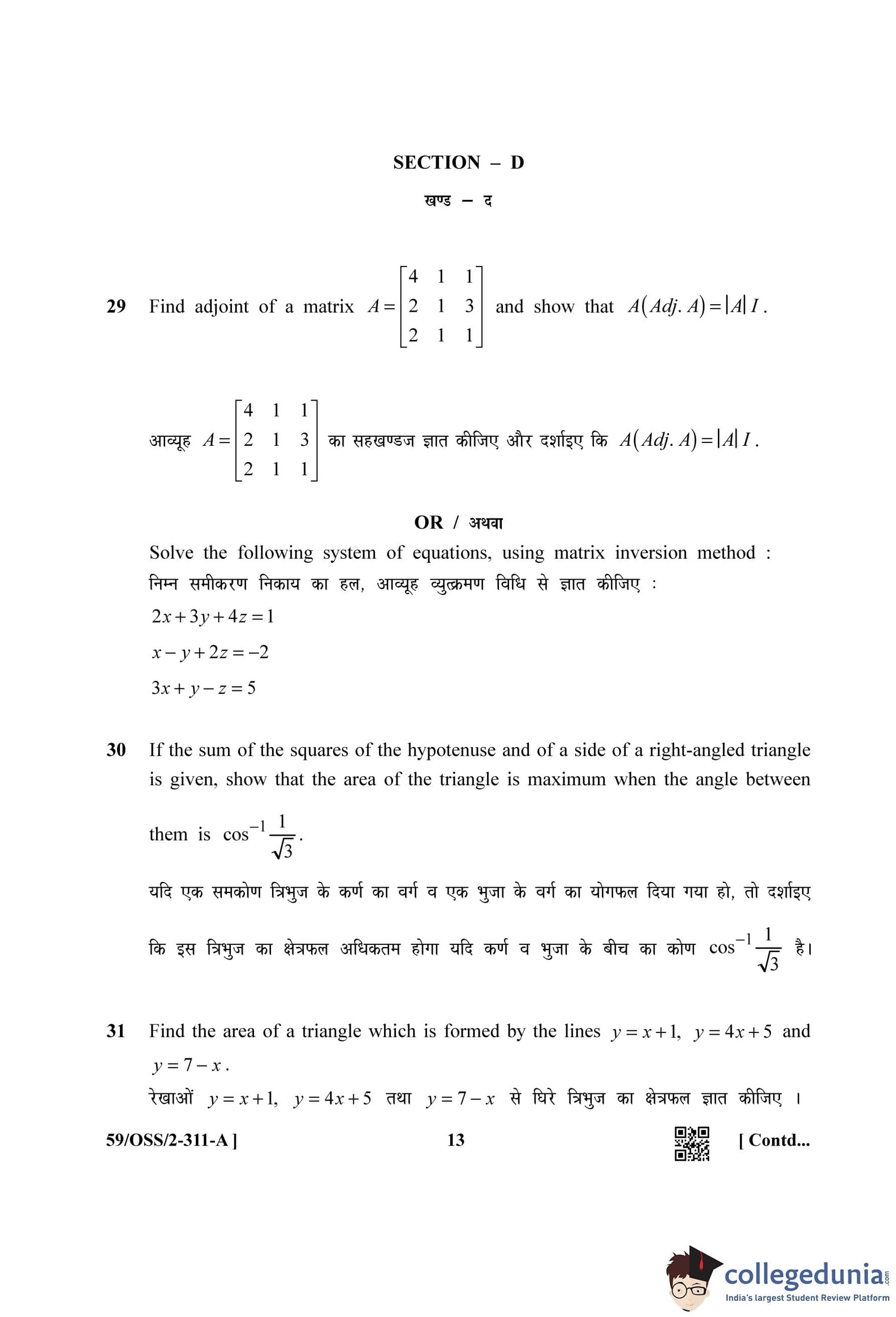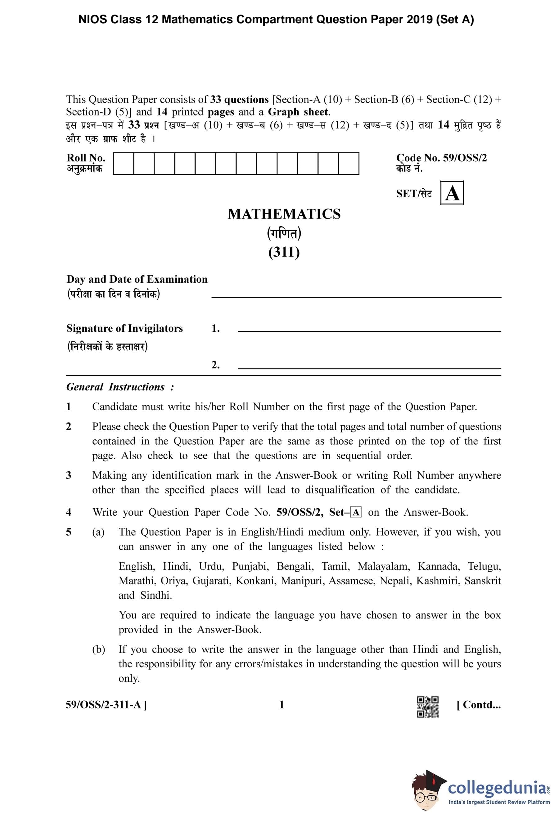 NIOS Class 12 Mathematics Compartment Question Paper 2019 with Answer Key pdf (Set A) is available for download here. The exam was conducted by National Institute of Open Schooling on October 23, 2019 in the Afternoon Session 2:30 PM to 5:30 PM. The question paper comprised a total of 33 questions divided among 4 sections.