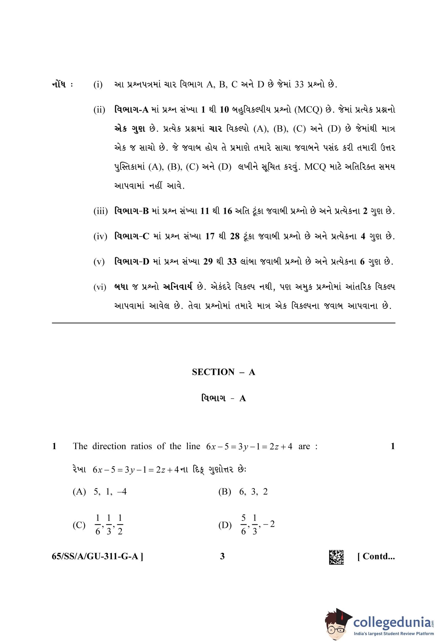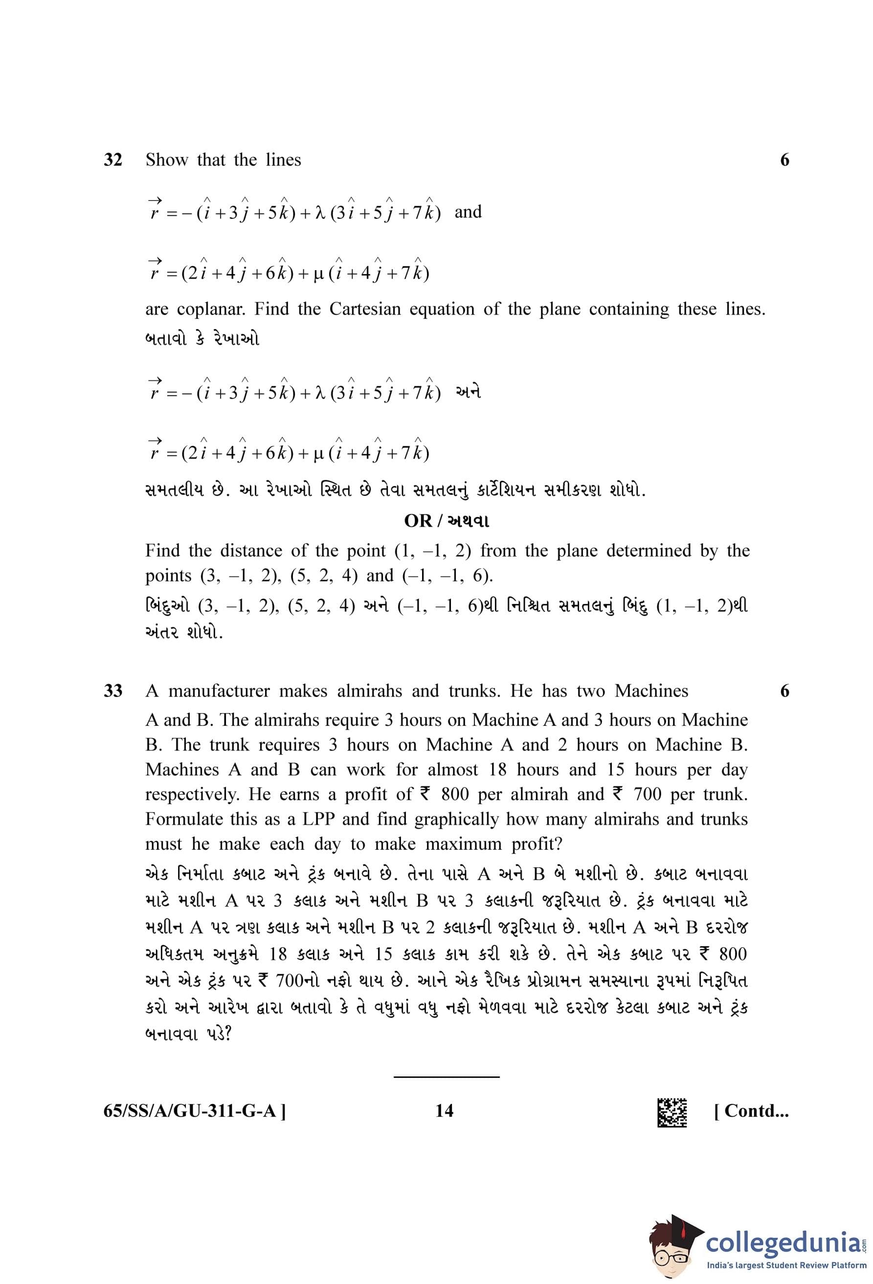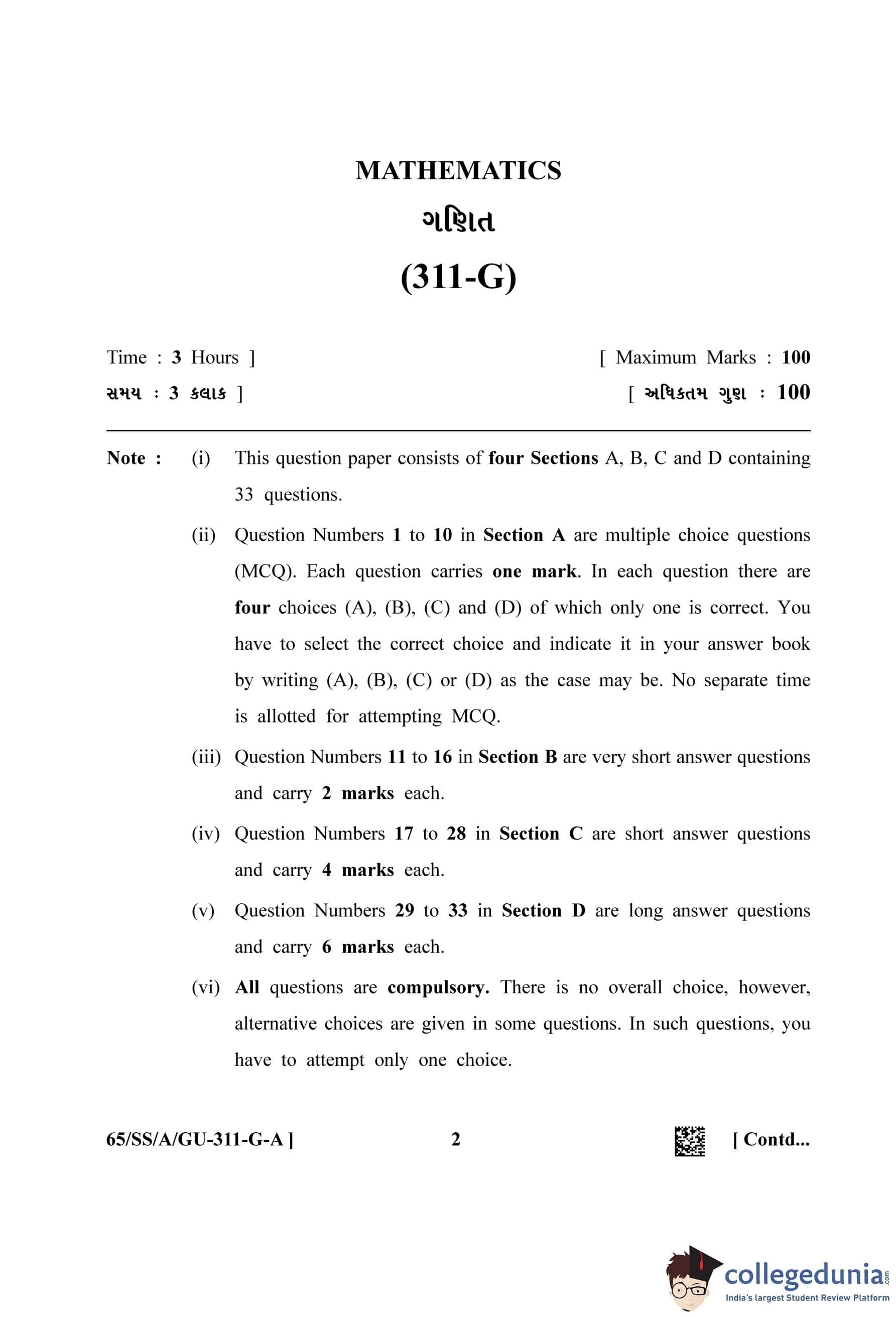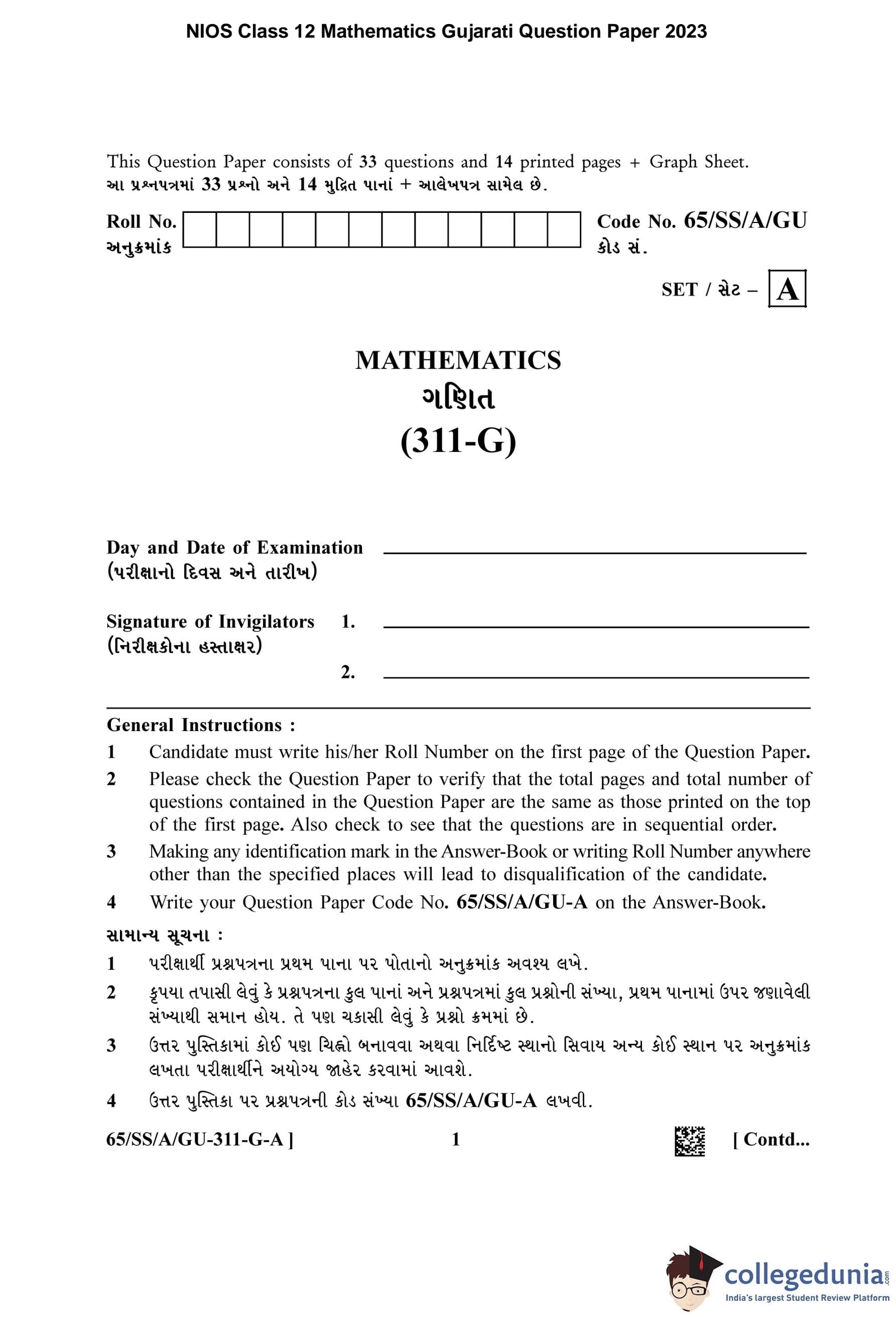 NIOS Class 12 Mathematics Gujarati Question Paper 2023 with Answer Key pdf (Set A) is available for download here. The exam was conducted by National Institute of Open Schooling on May 2, 2023 in the Afternoon Session 2.30 PM to 5.30 PM. The question paper comprised a total of 33 questions.