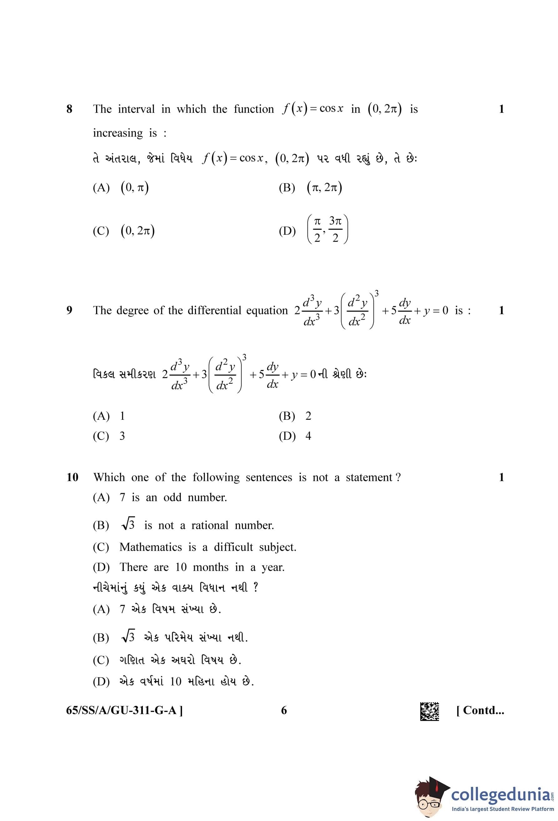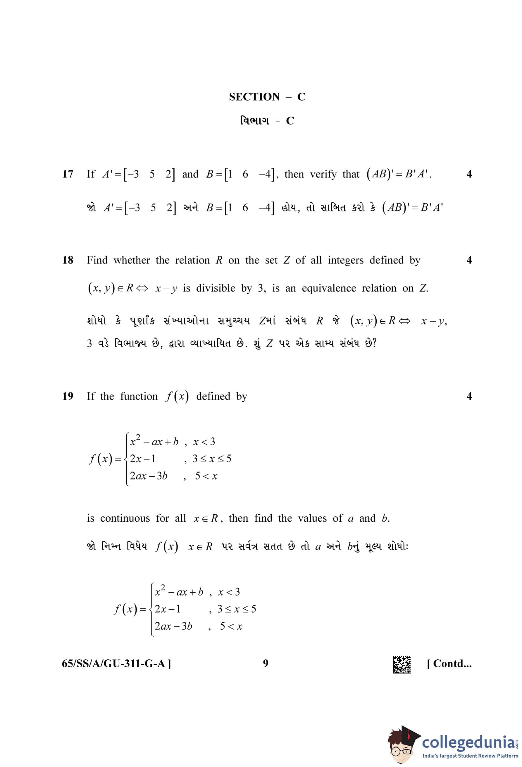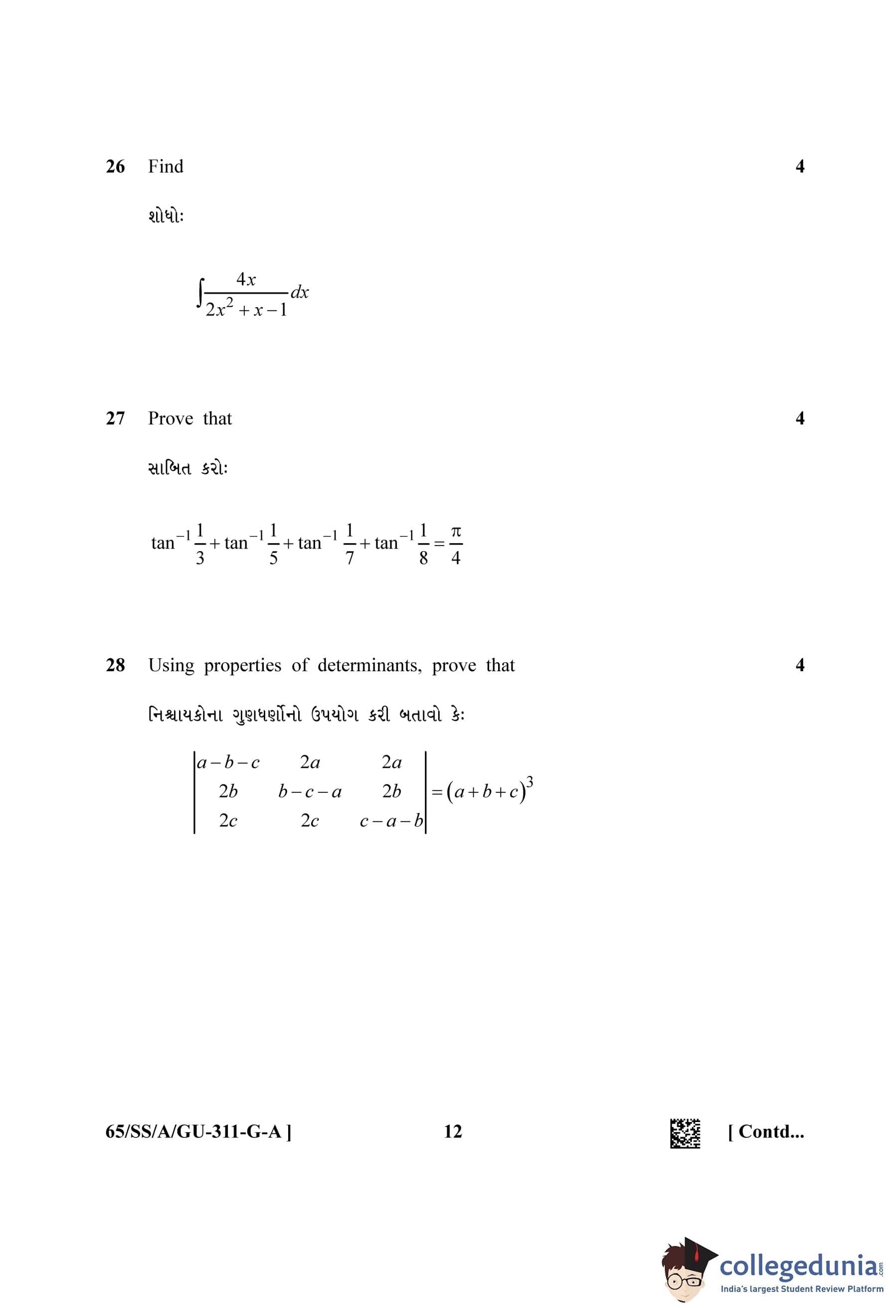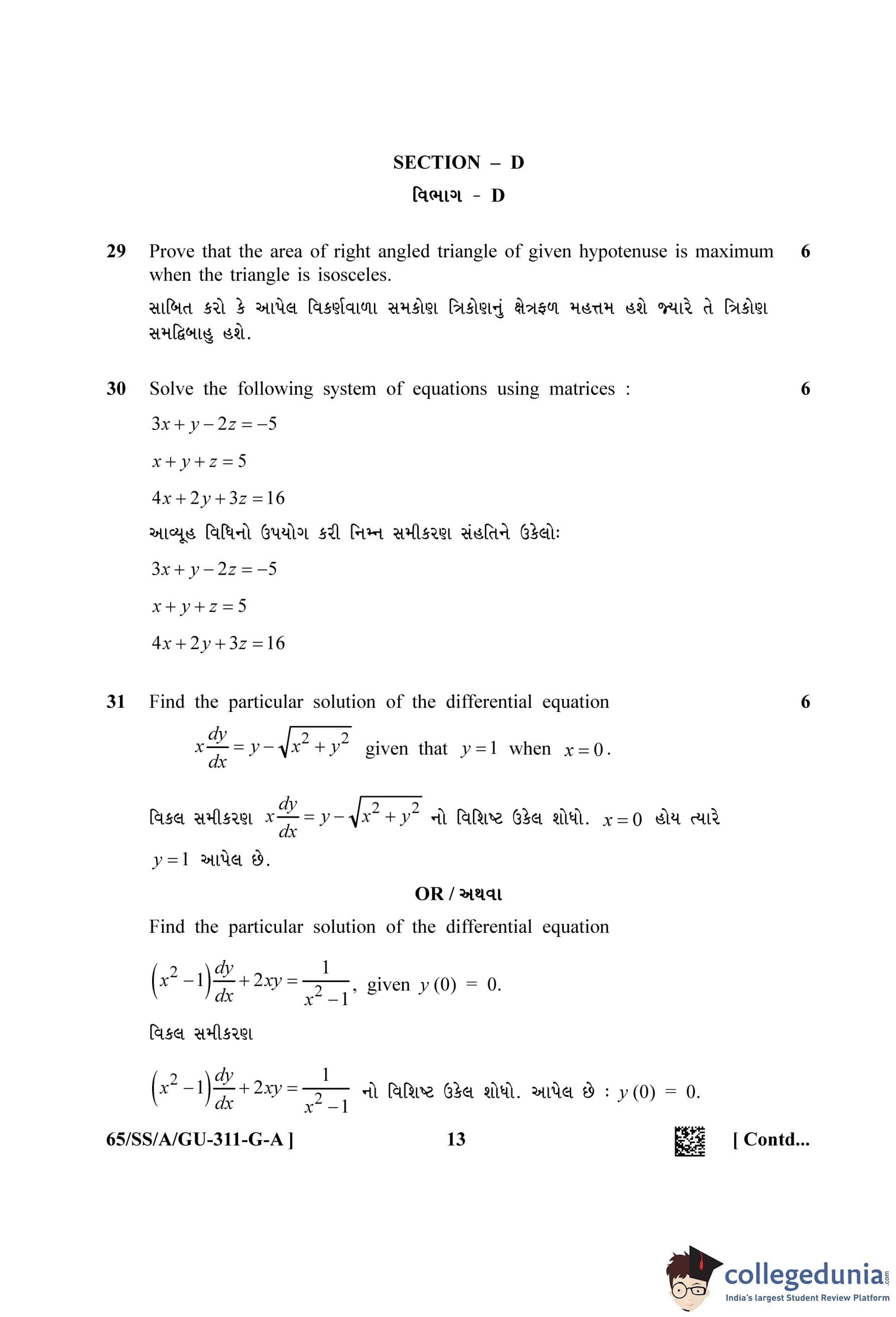 NIOS Class 12 Mathematics Gujarati (Set A) Question Paper 2023 with Answer Key