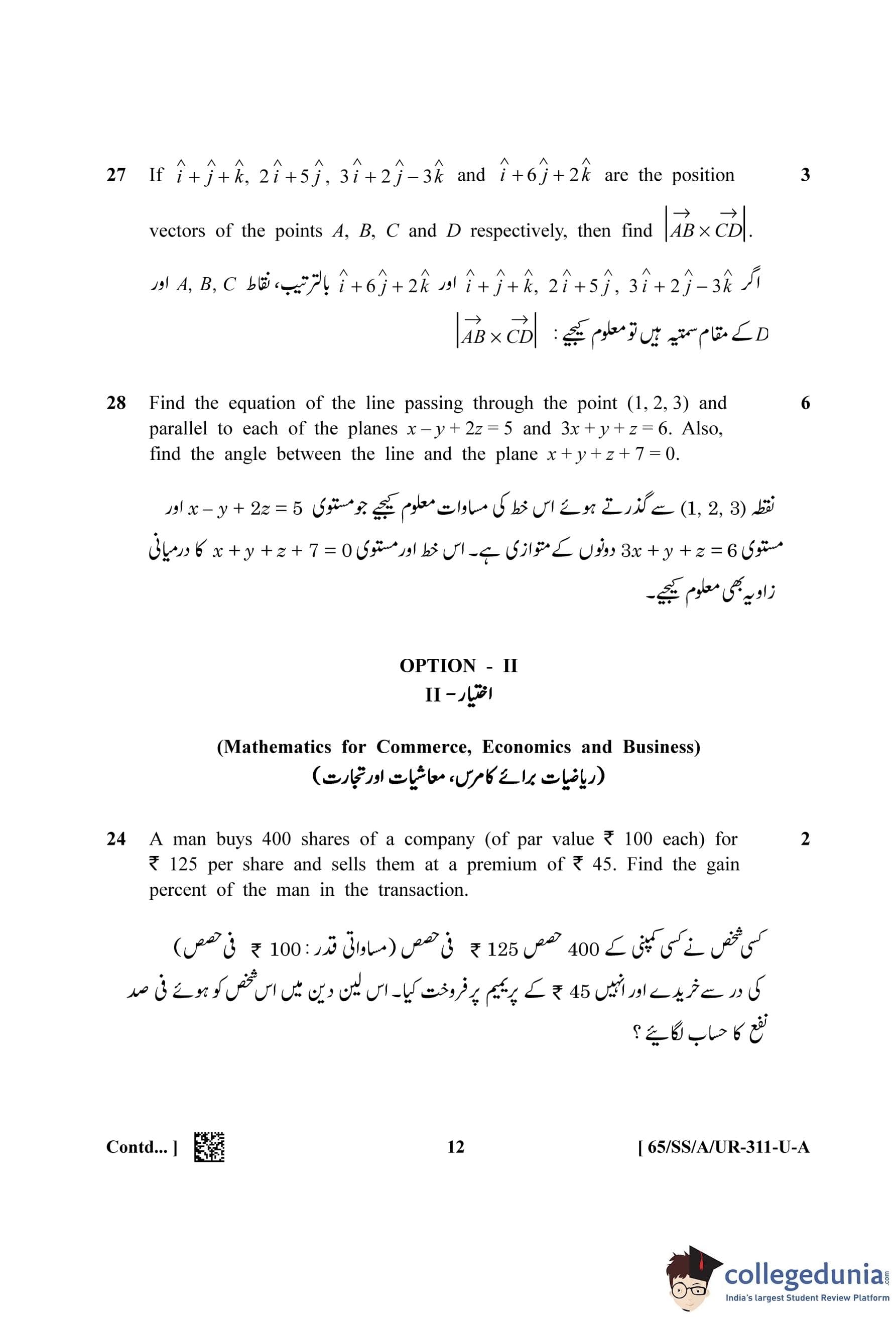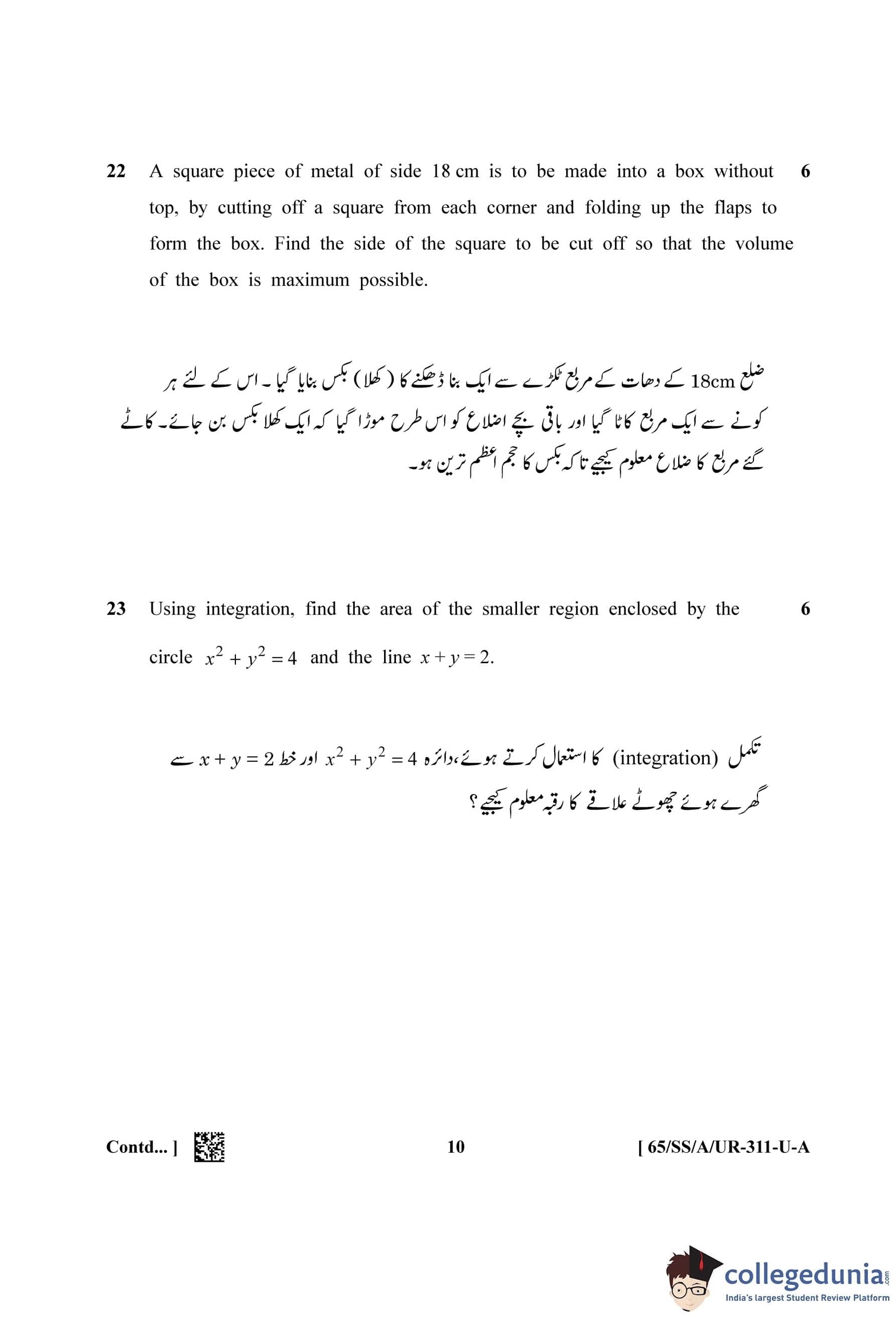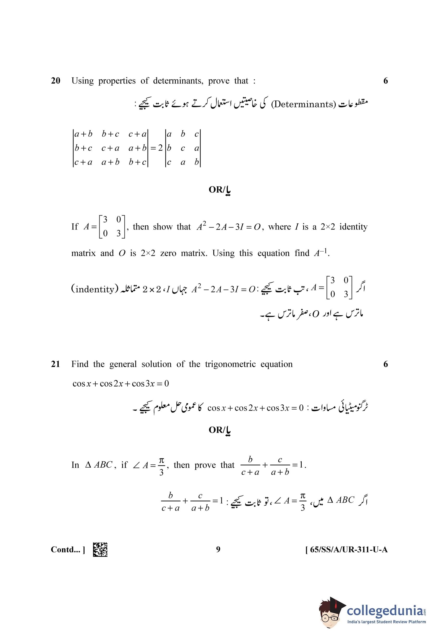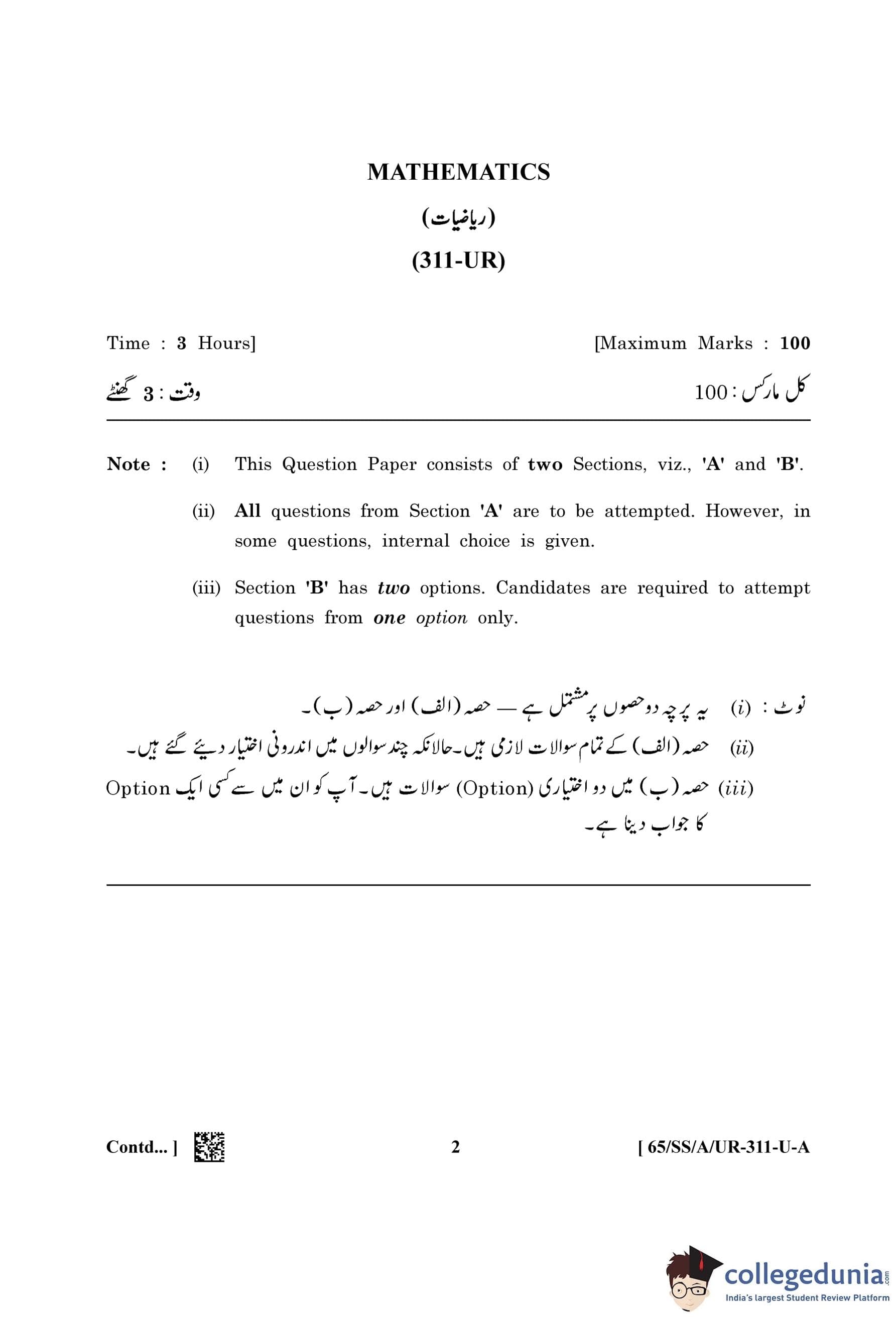 NIOS Class 12 Mathematics Urdu (Set A) Question Paper 2023 with Answer Key