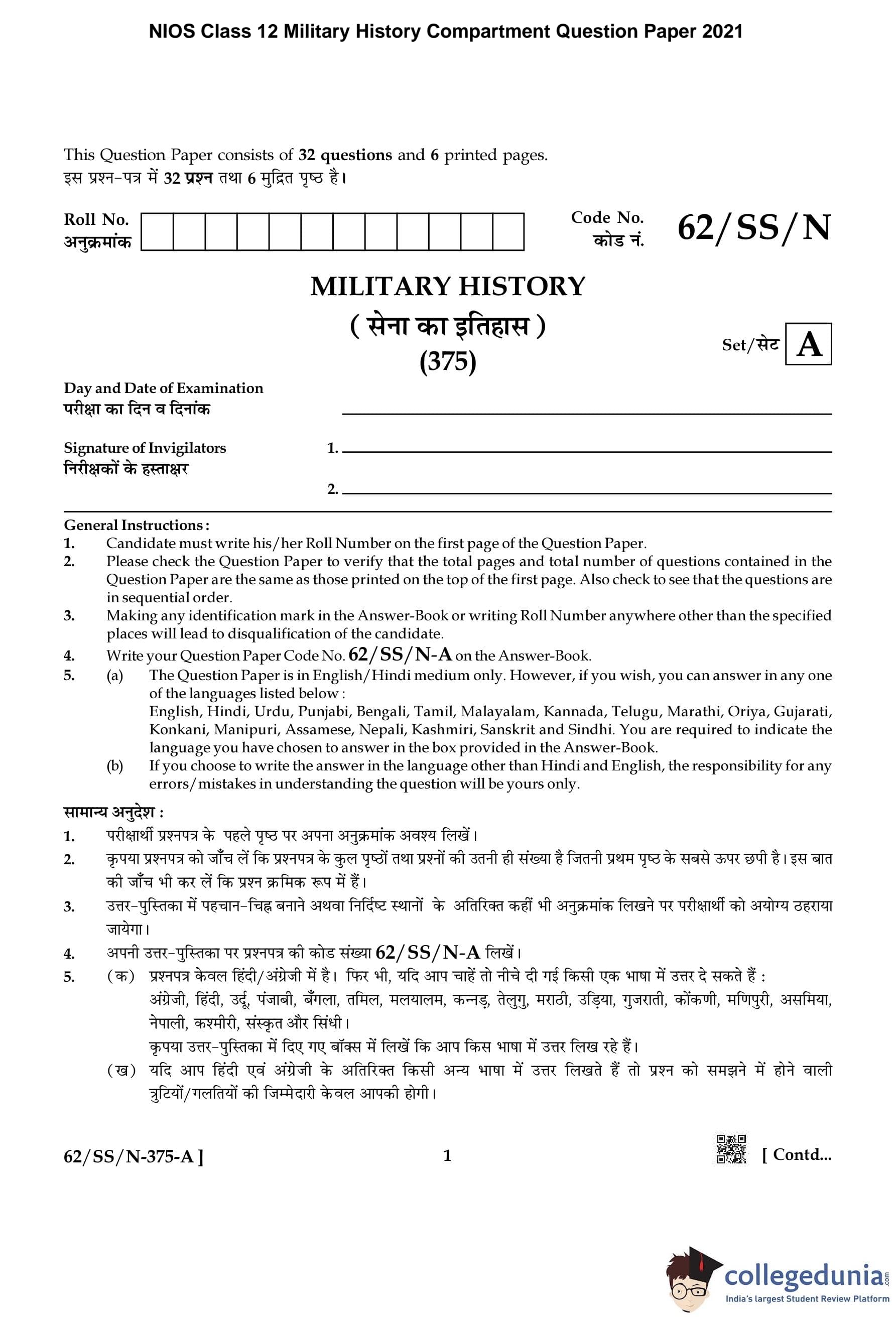NIOS Class 12 Military History Compartment Question Paper 2021 with Answer Key pdf is available for download here. The exam was conducted by National Institute of Open Schooling on December 14, 2021 in the Afternoon Session 2:30 PM to 5:30 PM. The question paper comprised a total of 32 questions.