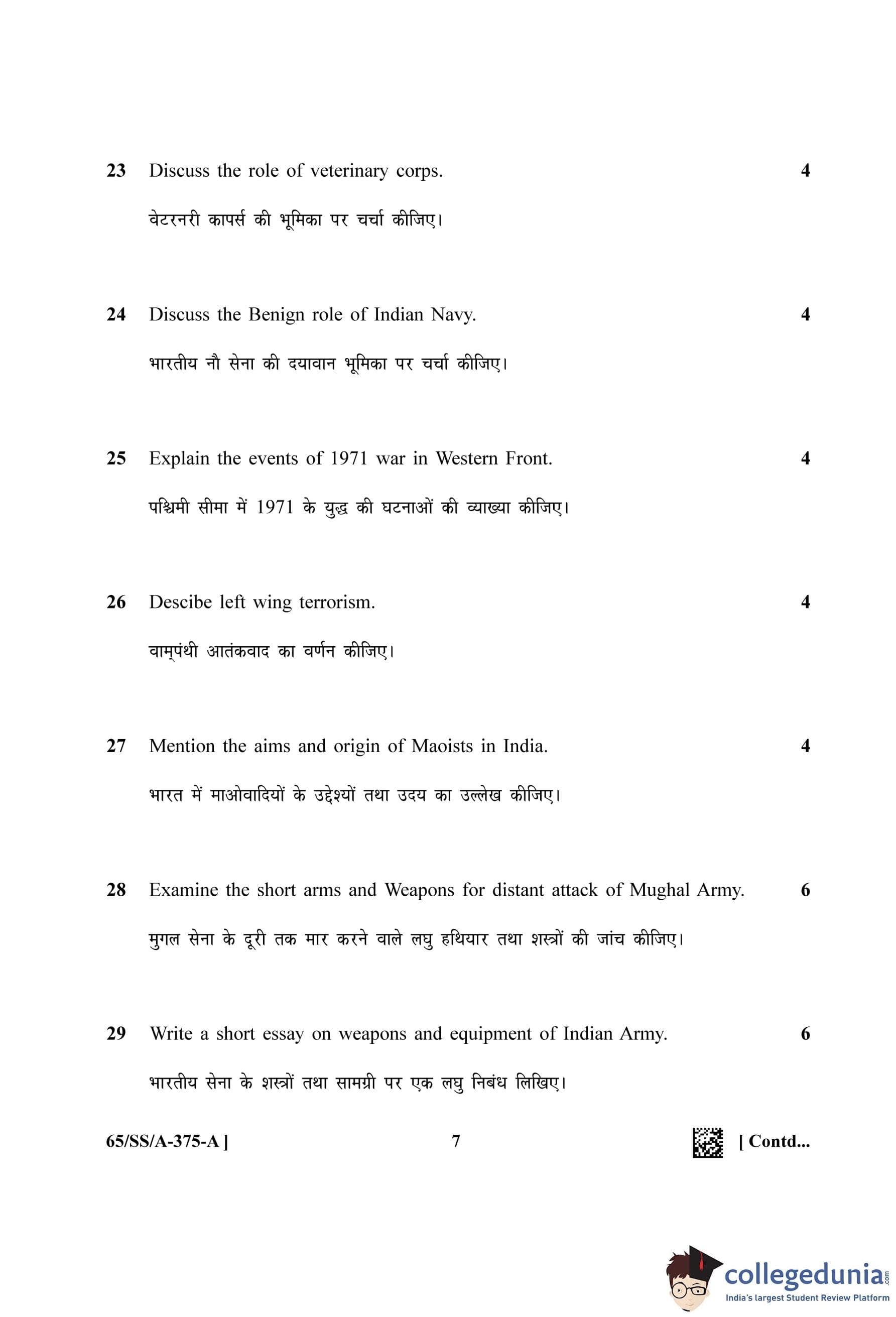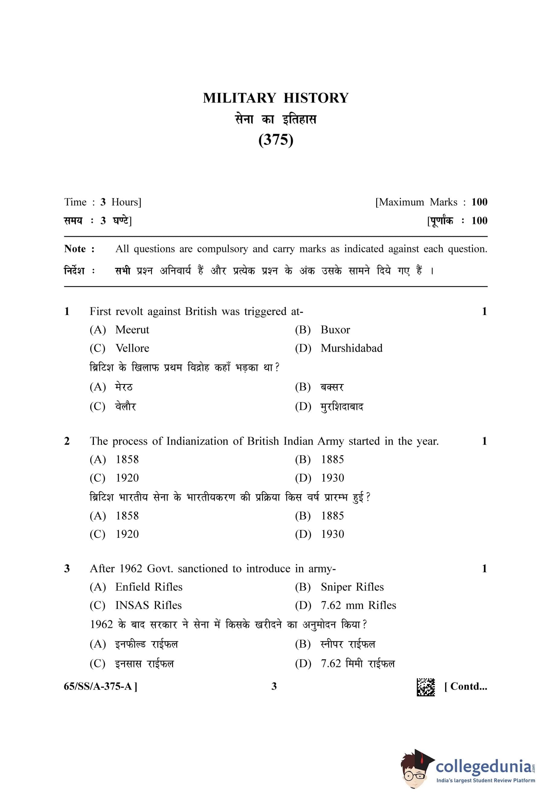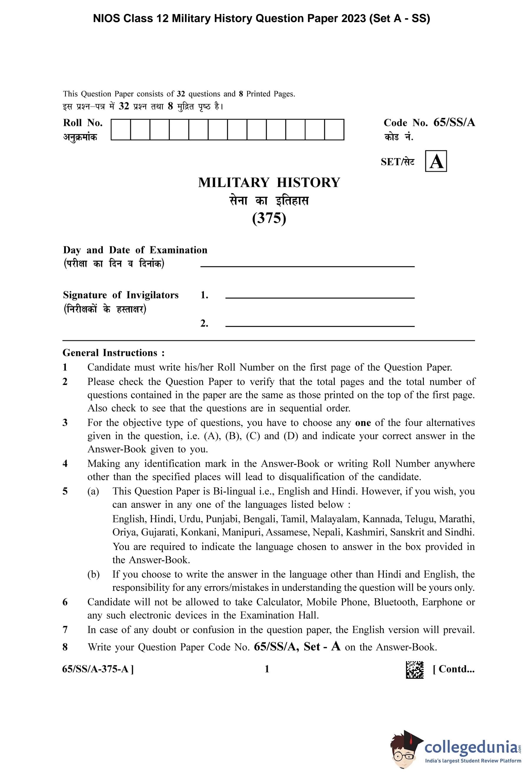 NIOS Class 12 Military History Question Paper 2023 with Answer Key pdf (Set A - SS) is available for download here. The exam was conducted by National Institute of Open Schooling on April 26, 2023 in the Afternoon Session 2.30 PM to 5.30 PM. The question paper comprised a total of 32 questions.