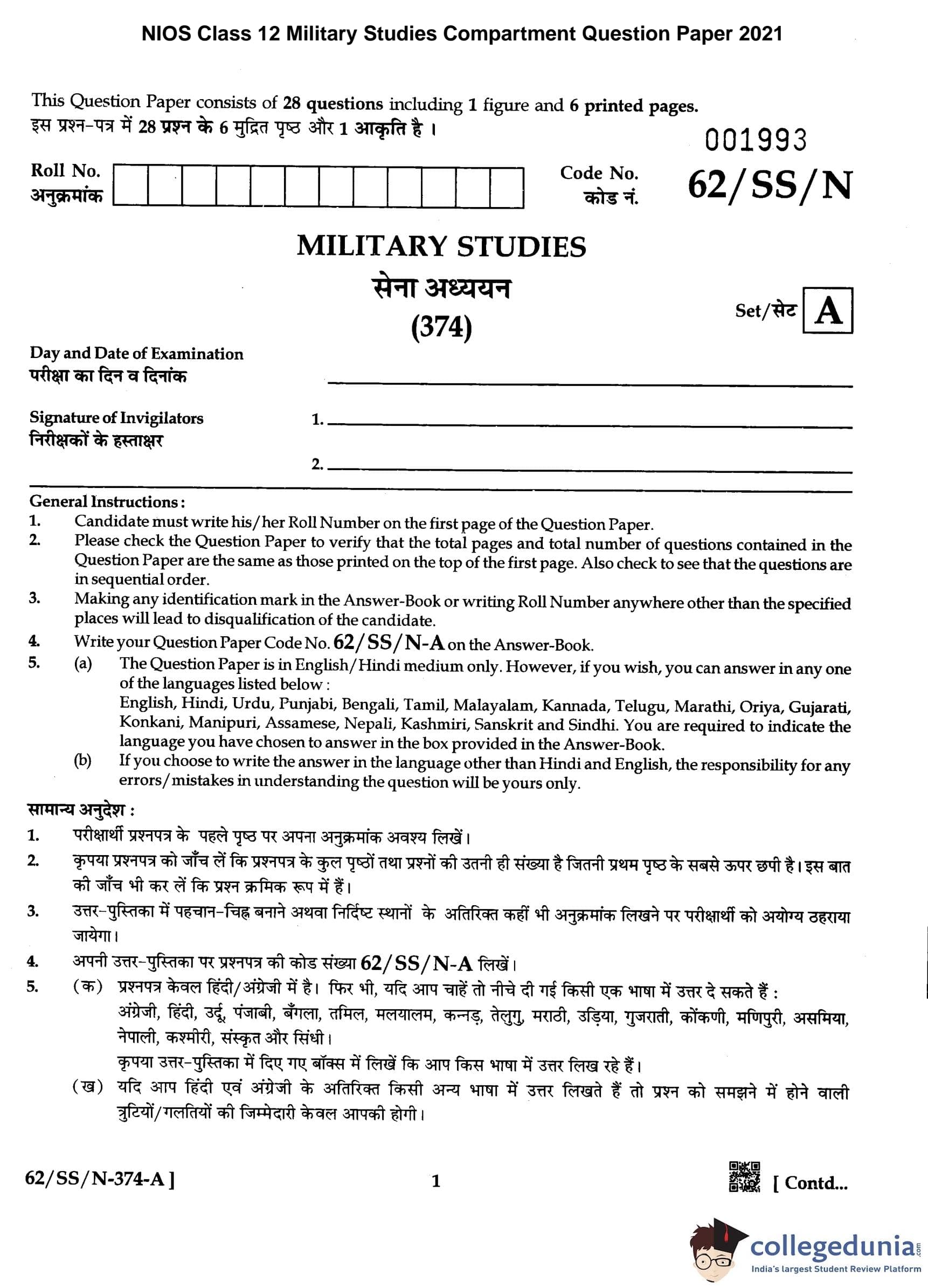 | NIOS Class 12 Military Studies Question Paper 2021 PDF | NIOS Class 12 Military Studies Answer Key 2021 PDF |