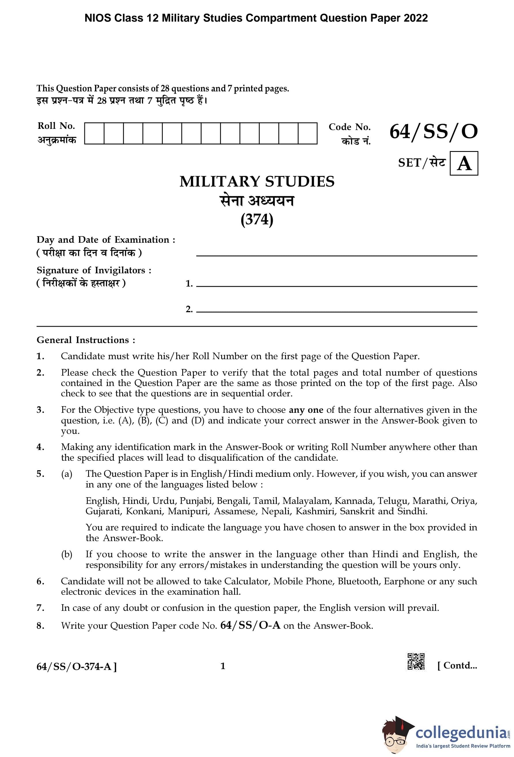 | NIOS Class 12 Military Studies Question Paper 2022 PDF | NIOS Class 12 Military Studies Answer Key 2022 PDF |