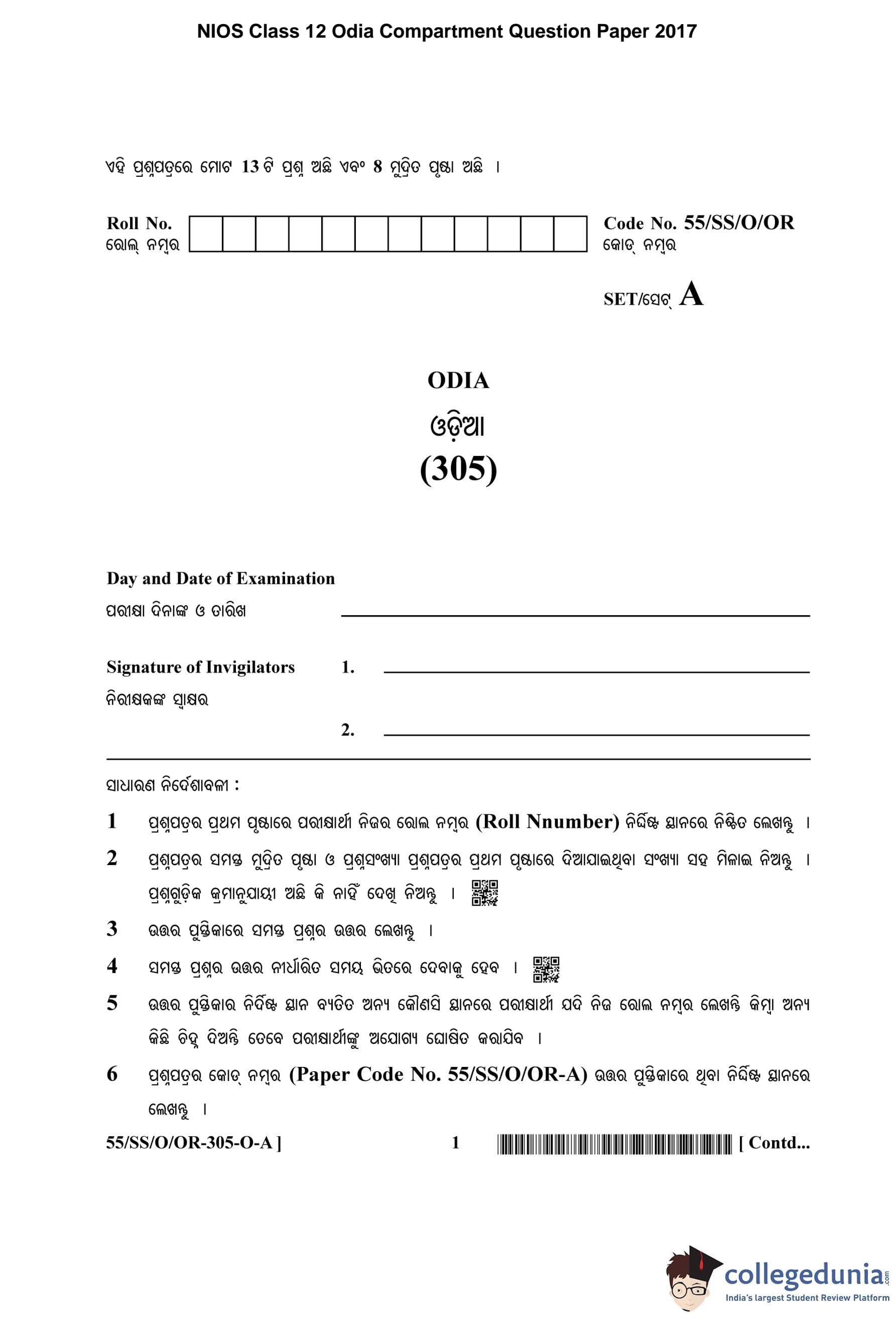 NIOS Class 12 Odia Compartment Question Paper 2017 with Answer Key pdf is available for download here. The exam was conducted by National Institute of Open Schooling on November 2, 2017 in the Afternoon Session 2:30 PM to 5:30 PM. The question paper comprised a total of 13 questions.