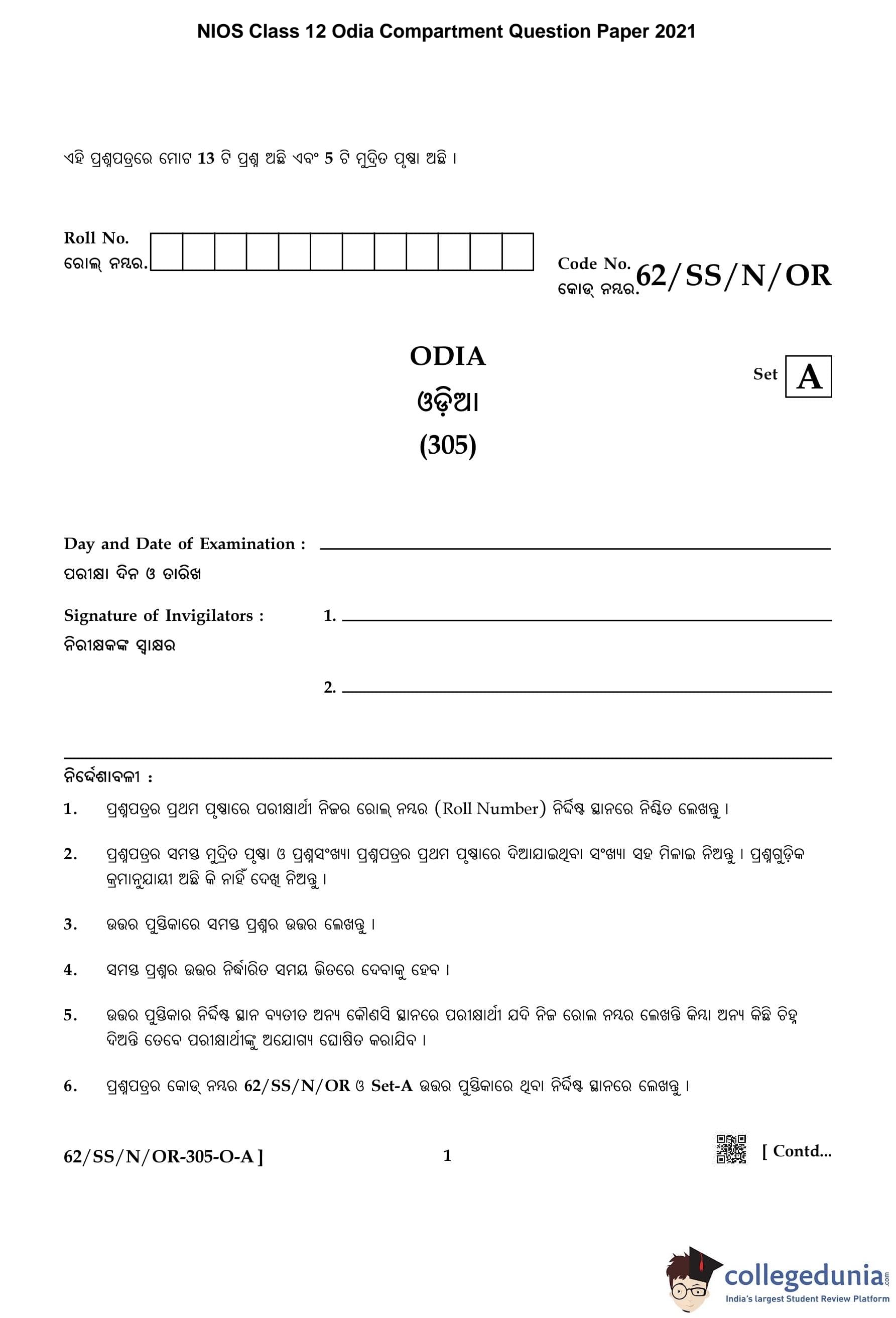 NIOS Class 12 Odia Compartment Question Paper 2021 with Answer Key pdf is available for download here. The exam was conducted by National Institute of Open Schooling on November 26, 2021 in the Afternoon Session 2:30 PM to 5:30 PM. The question paper comprised a total of 13 questions.