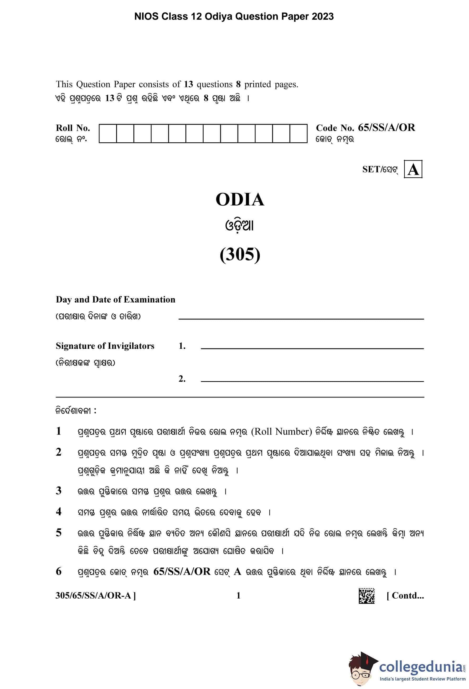 NIOS Class 12 Odiya Question Paper 2023 with Answer Key pdf (Set A) is available for download here. The exam was conducted by National Institute of Open Schooling on April 13, 2023 in the Afternoon Session 2.30 PM to 5.30 PM. The question paper comprised a total of 13 questions.