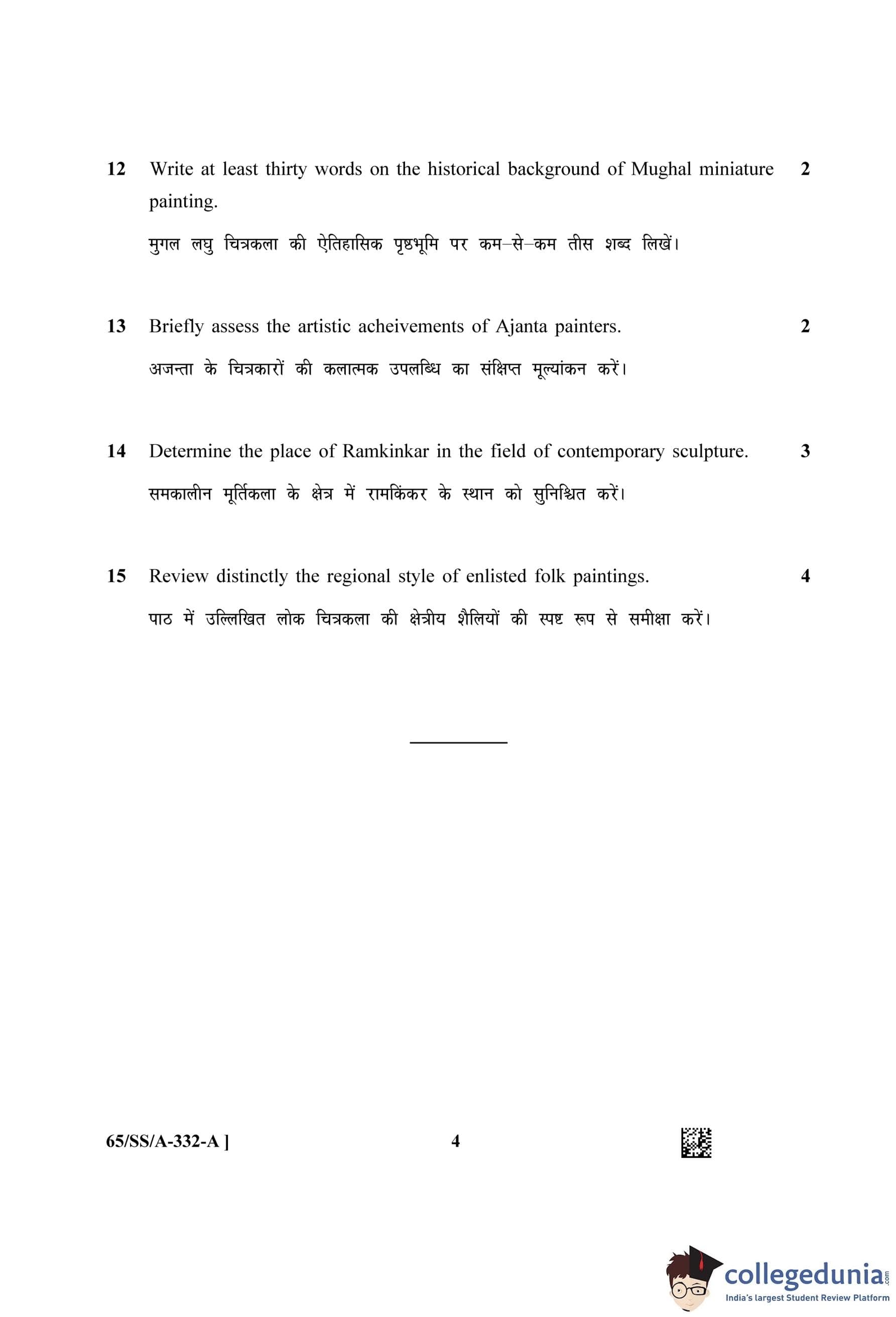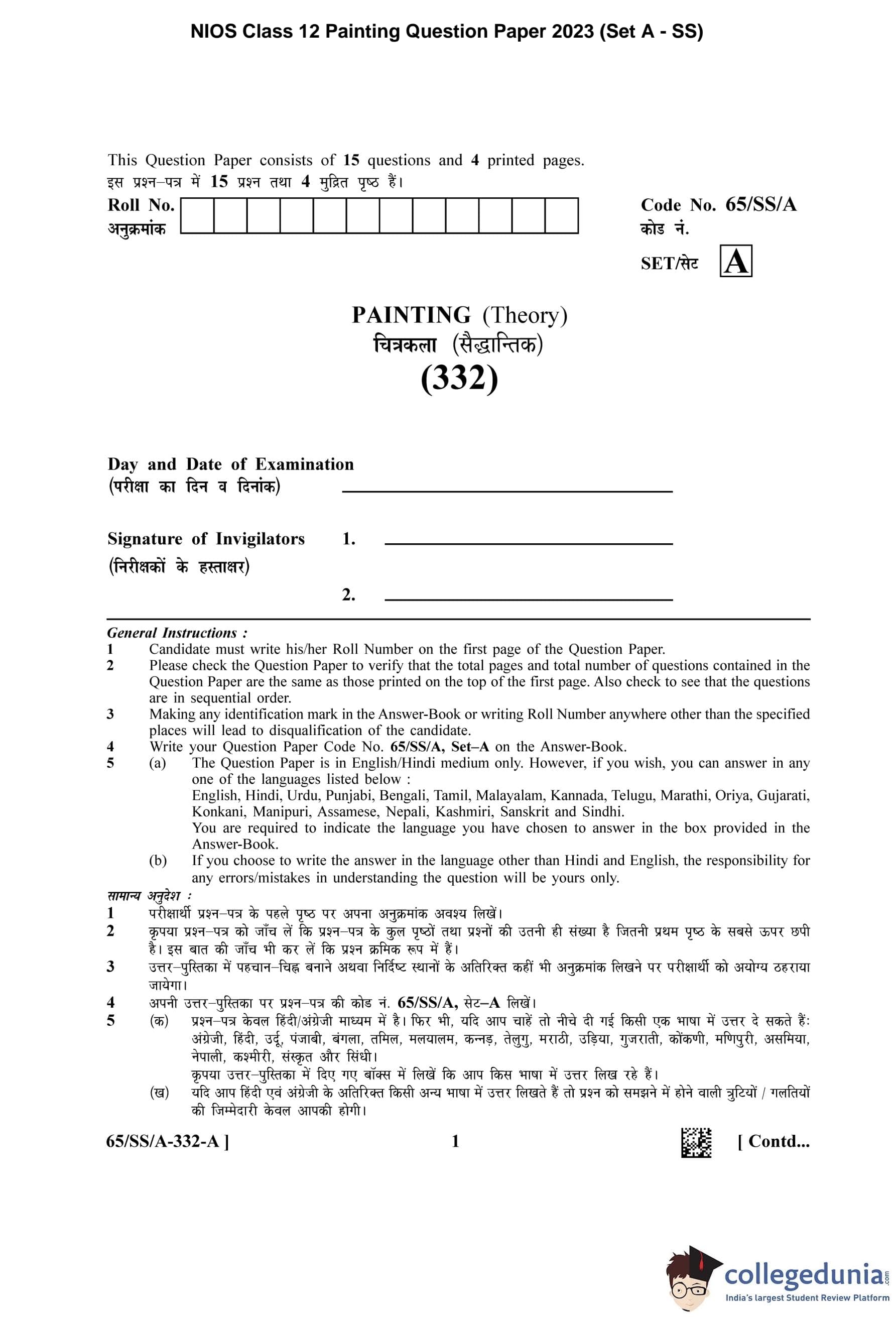 NIOS Class 12 Painting Question Paper 2023 with Answer Key pdf (Set A - SS) is available for download here. The exam was conducted by National Institute of Open Schooling on April 11, 2023 in the Afternoon Session 2.30 PM to 4 PM. The question paper comprised a total of 15 questions.