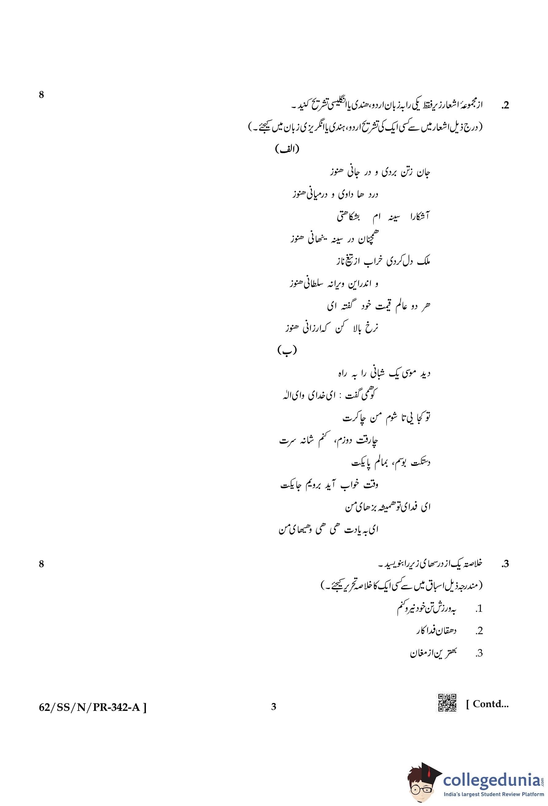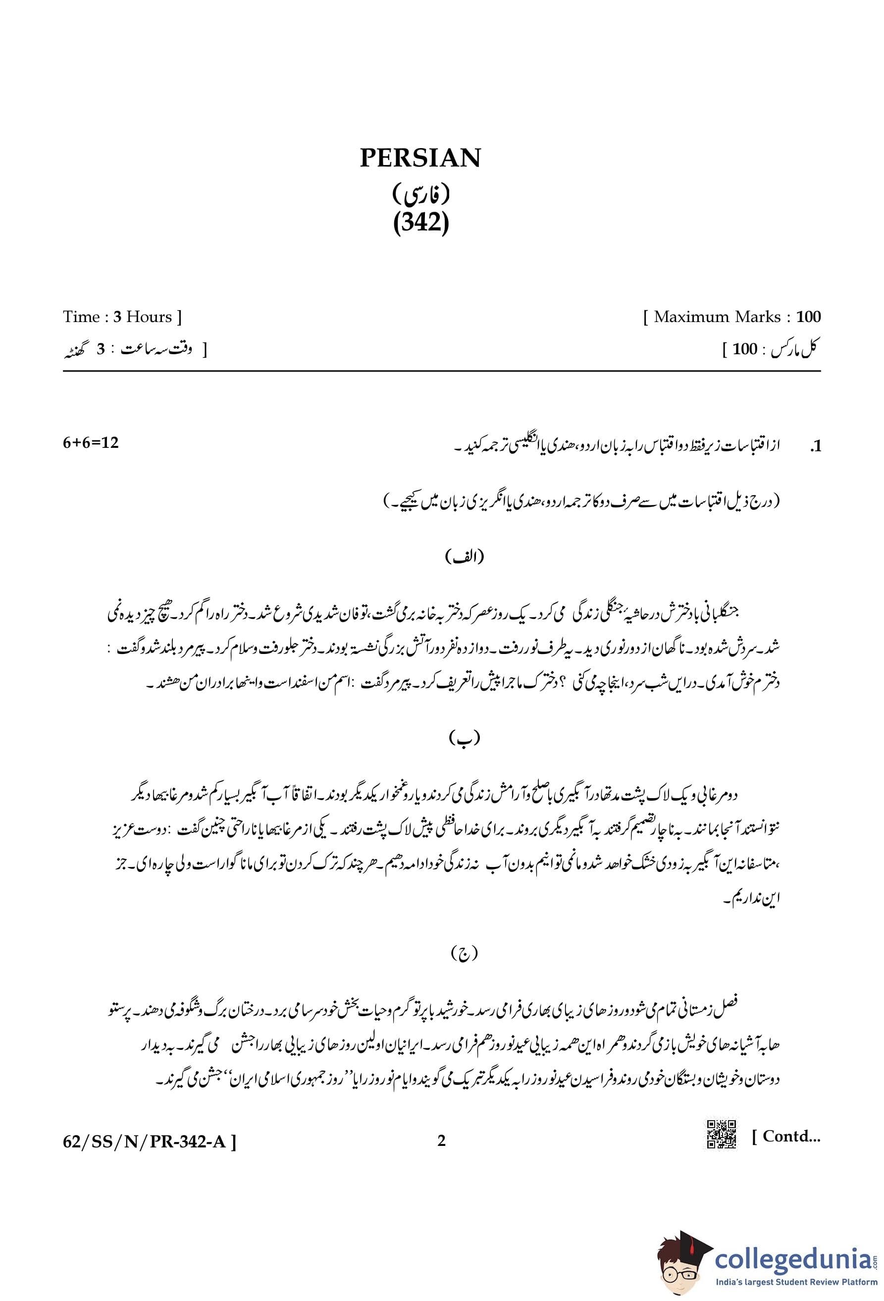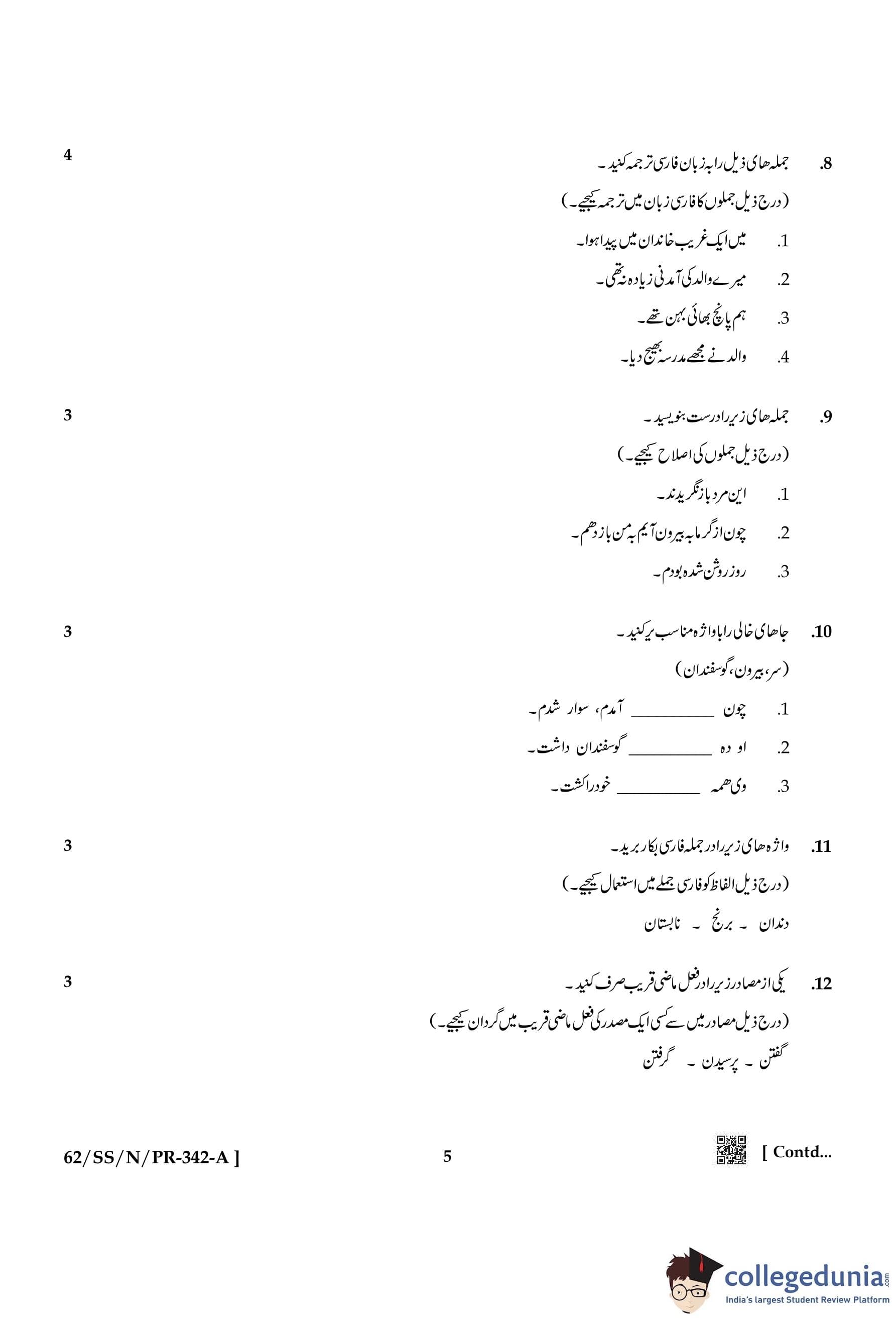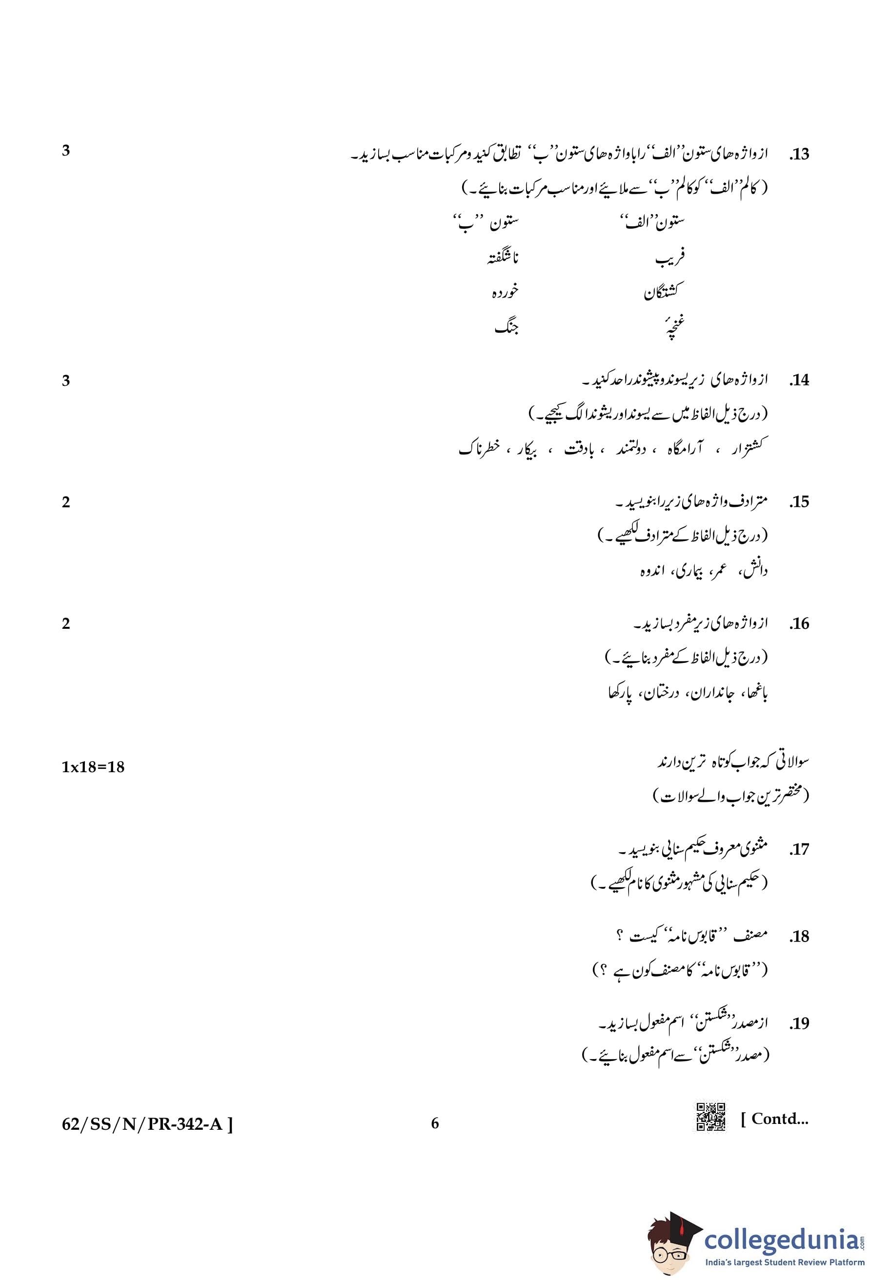 NIOS Class 12 Persian Compartment Question Paper 2021 with Answer Key